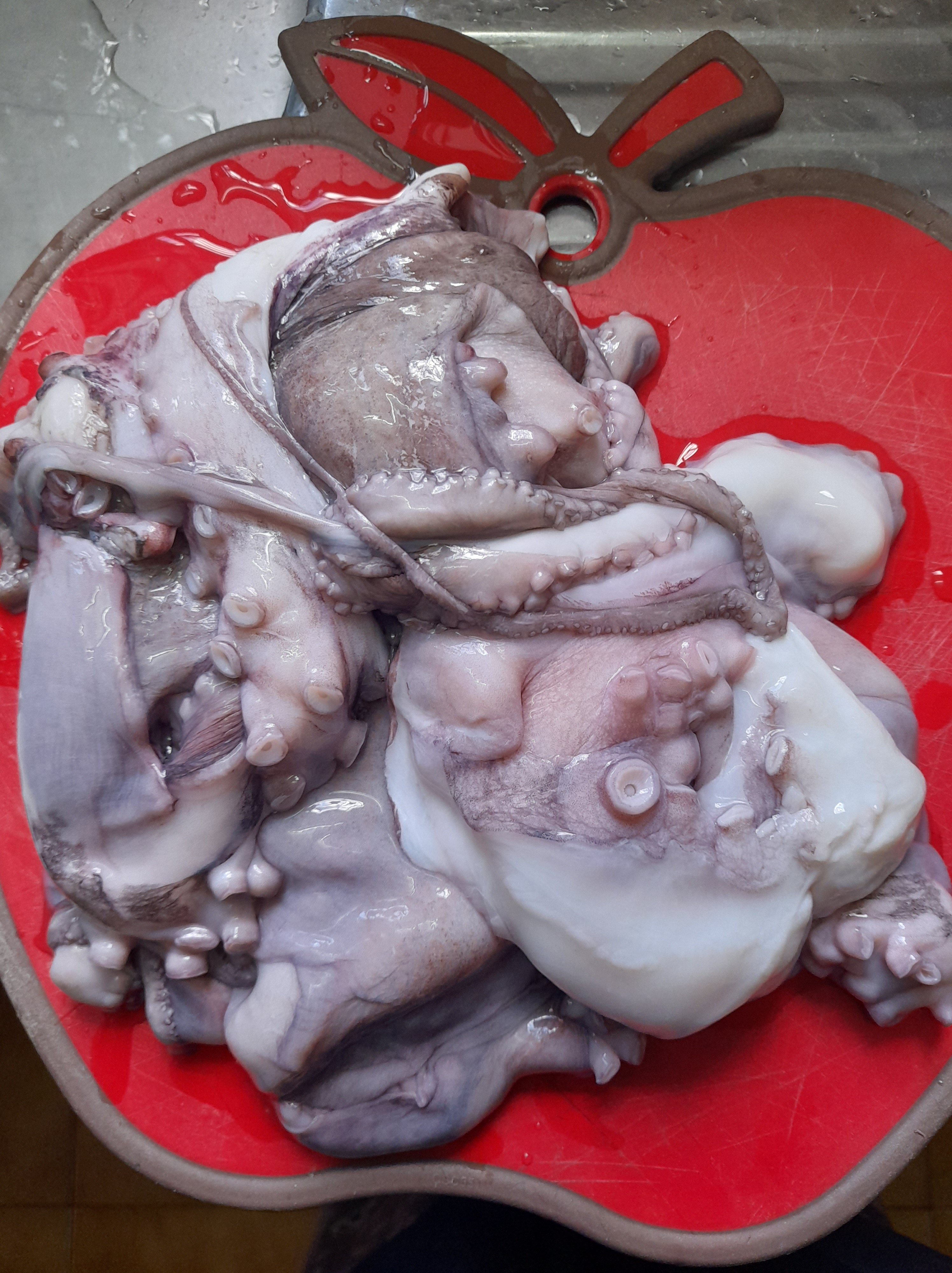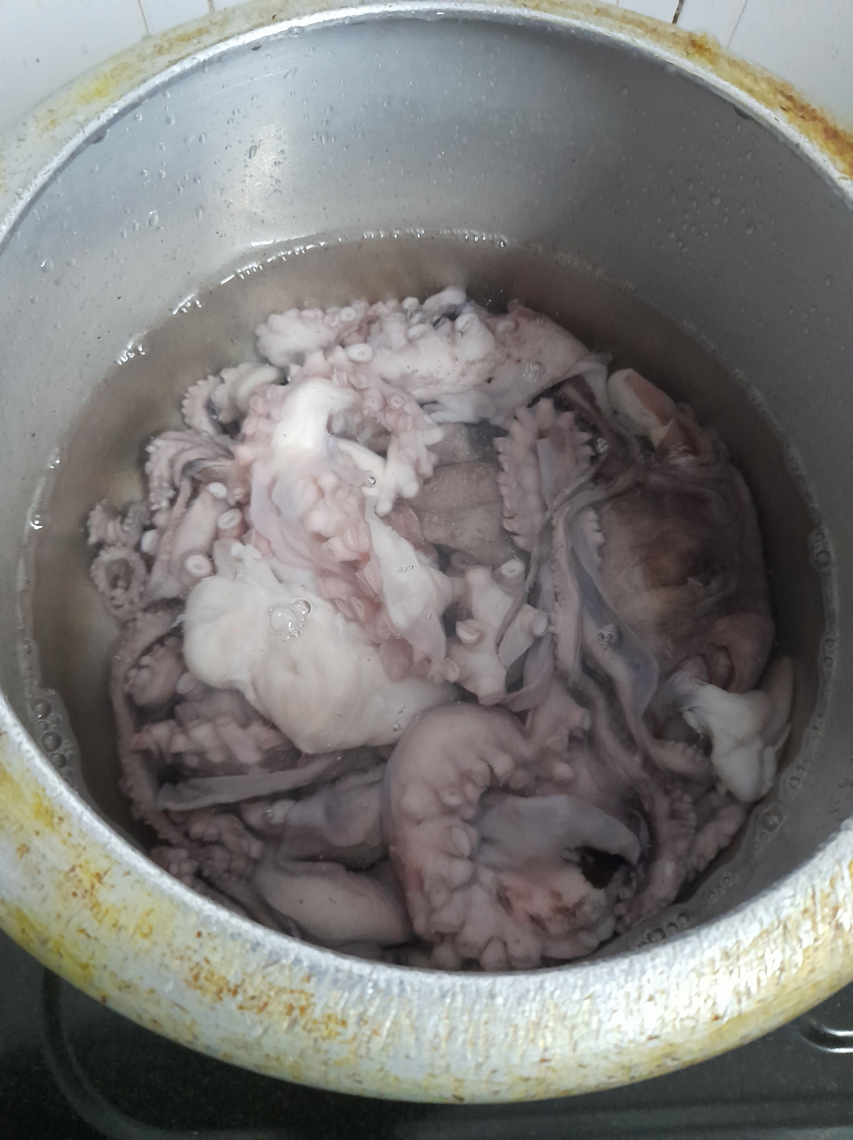 - Put the octopus in a large pan. Add water beneath a tap and wash many times till water is clear.