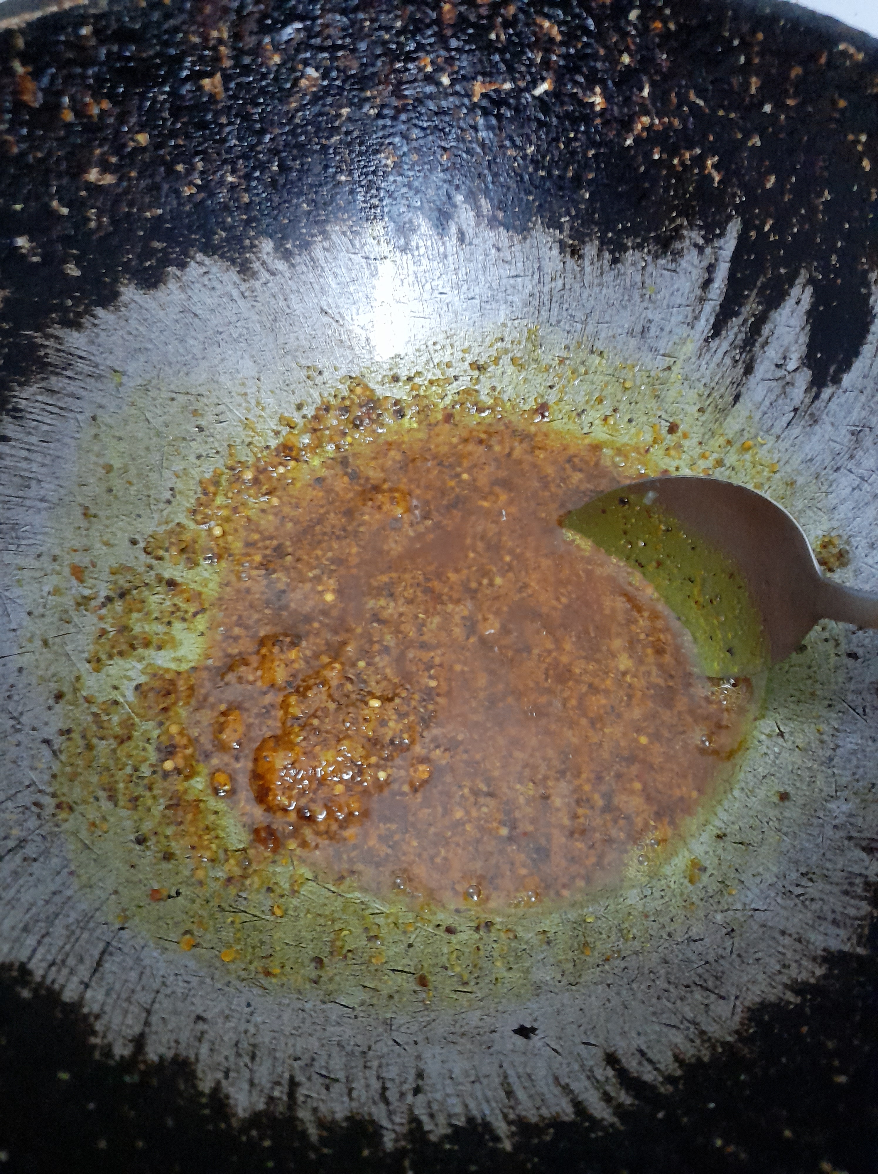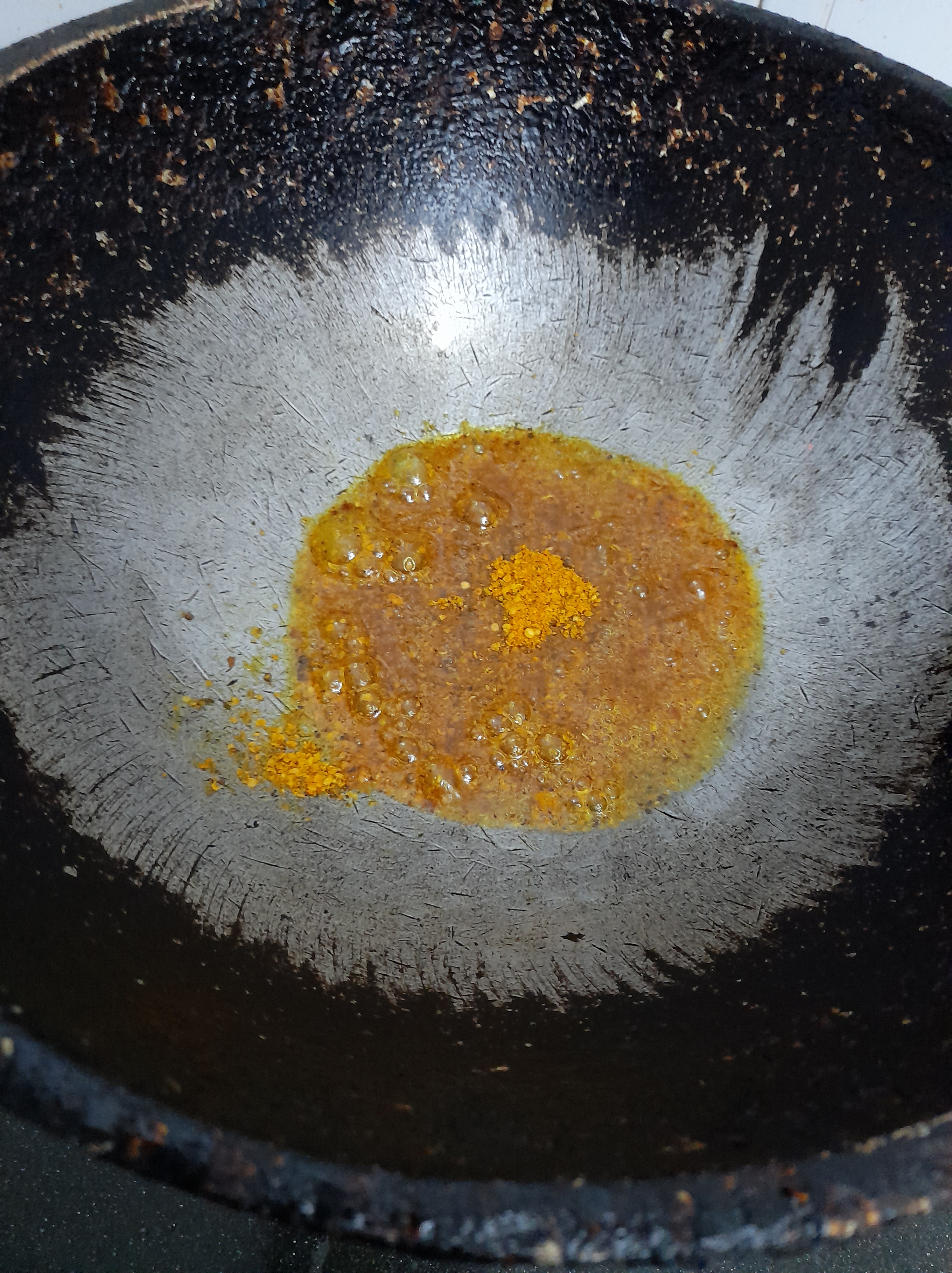 - Heat some oil in a pan. Add 3 tablespoons of of ‘vindaye and achard powder’. Add 1/2 teaspoon of powdered mustard. Now cook these powder over low heat in the oil for some 5 minutes. Once the colour changes, add the ginger garlic paste and cook again. Add the 1/2 teaspoon turmeric powder and cook in oil.