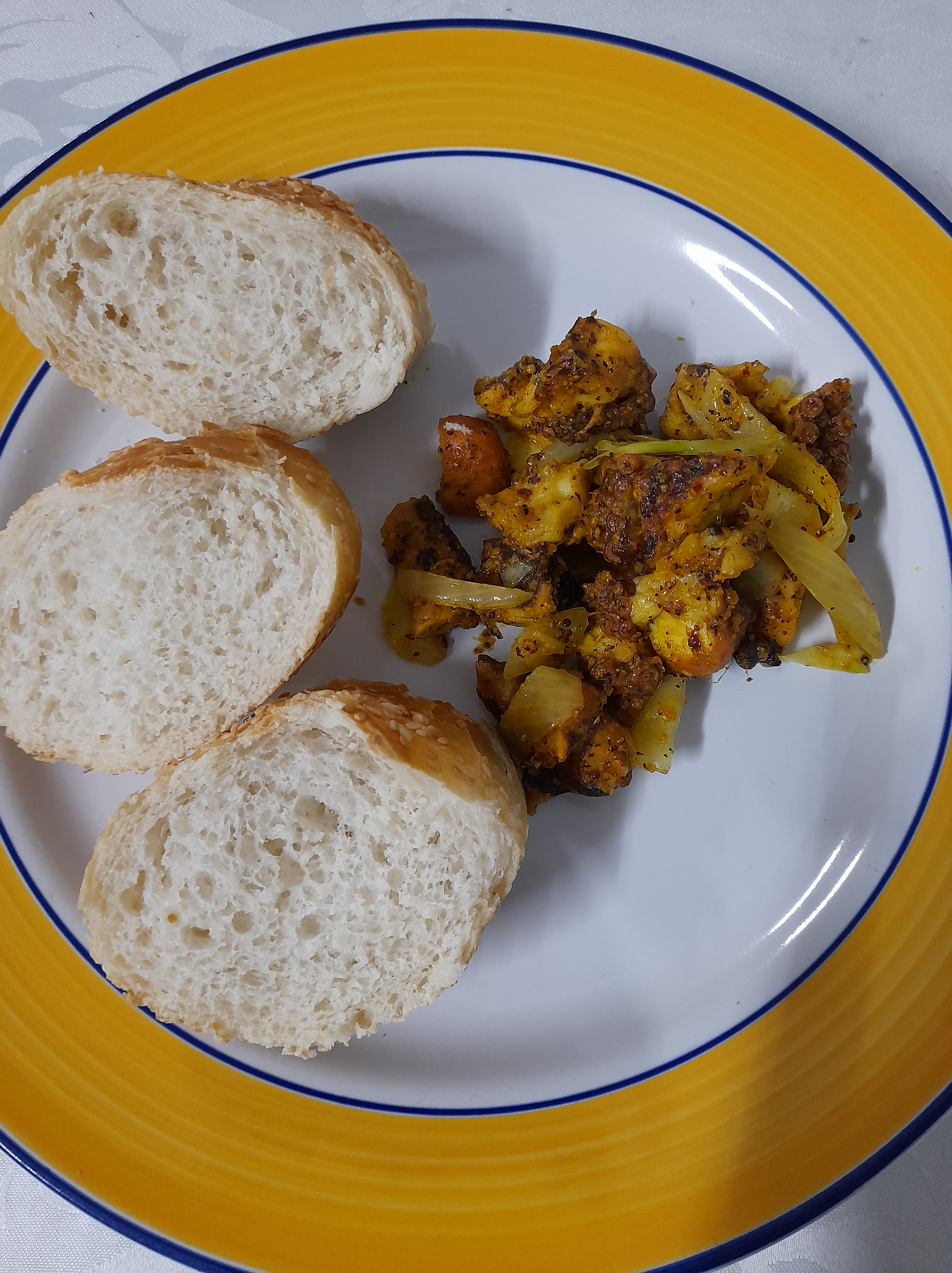 - Lastly add some curry leaves and large cut onions to the octopus achari also called vindaloo. Stir and cook for some minutes.