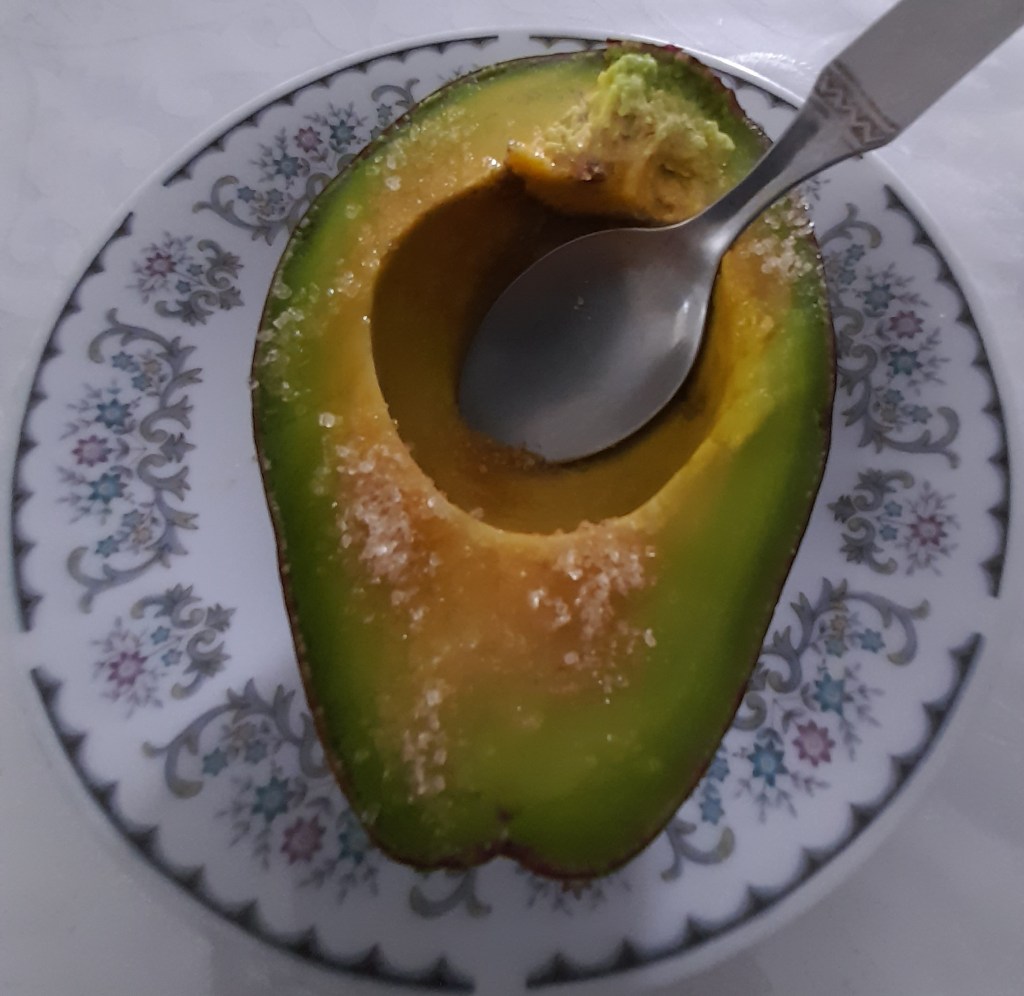 Avocado Ingredients : 1 avocado Some brown sugar Procedures : Wash the avocado. Cut into halves, Remove the seed. Sprinkle the top of the avocado with sugar. Enjoy for breakfast!