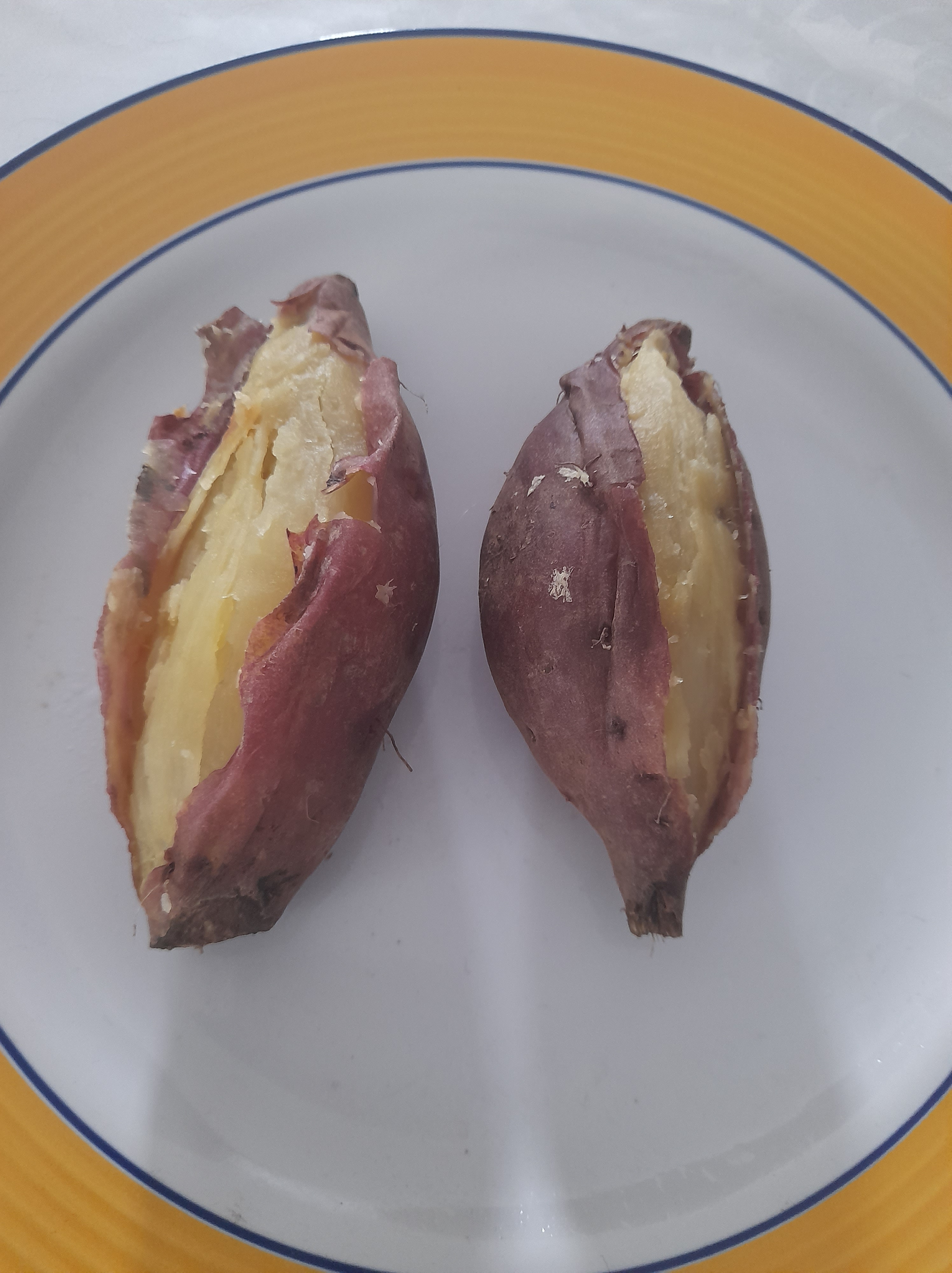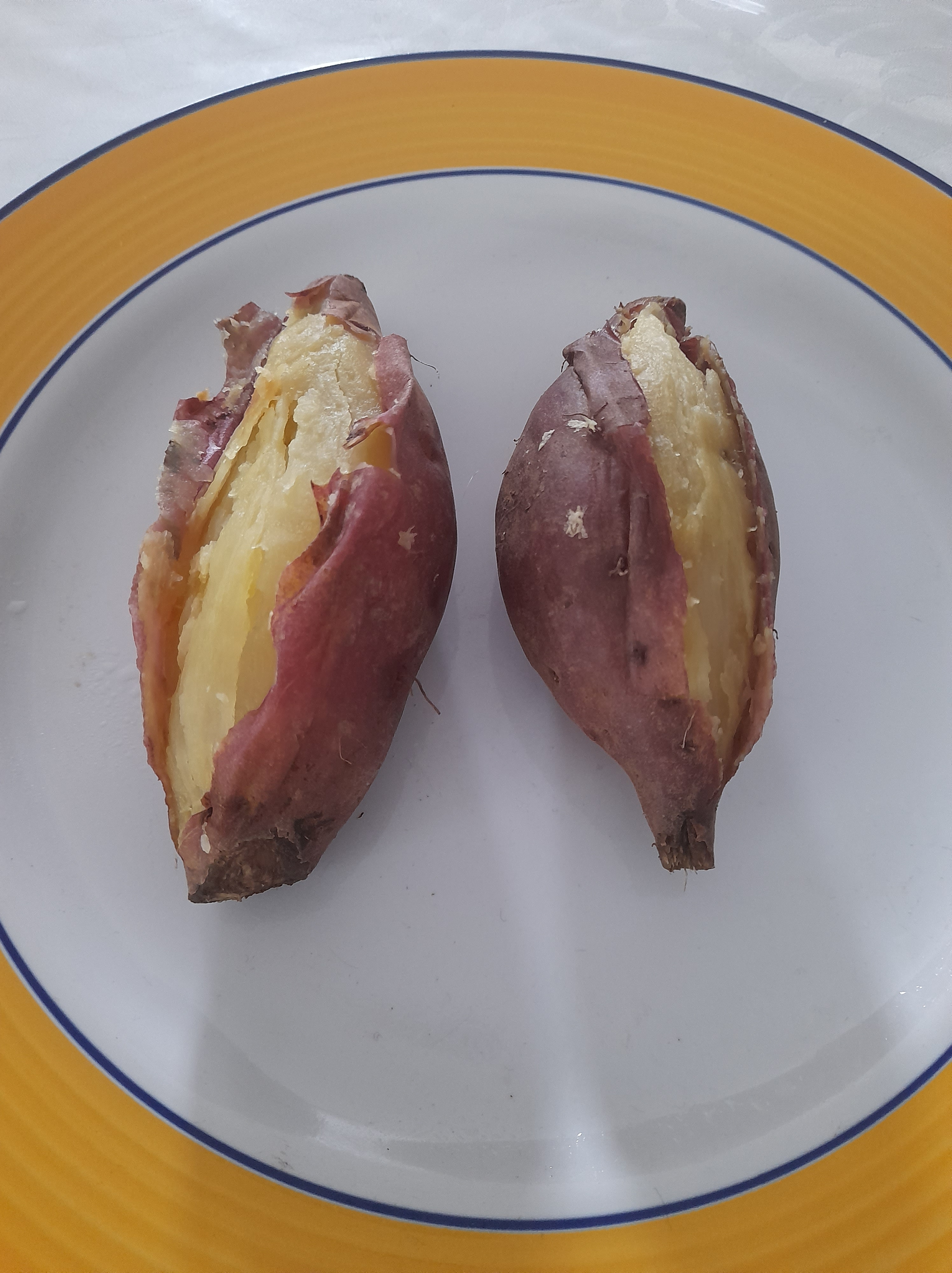 - The sweet potato will open during the boiling process. Strain the water and keep the sweet potato with the peels.