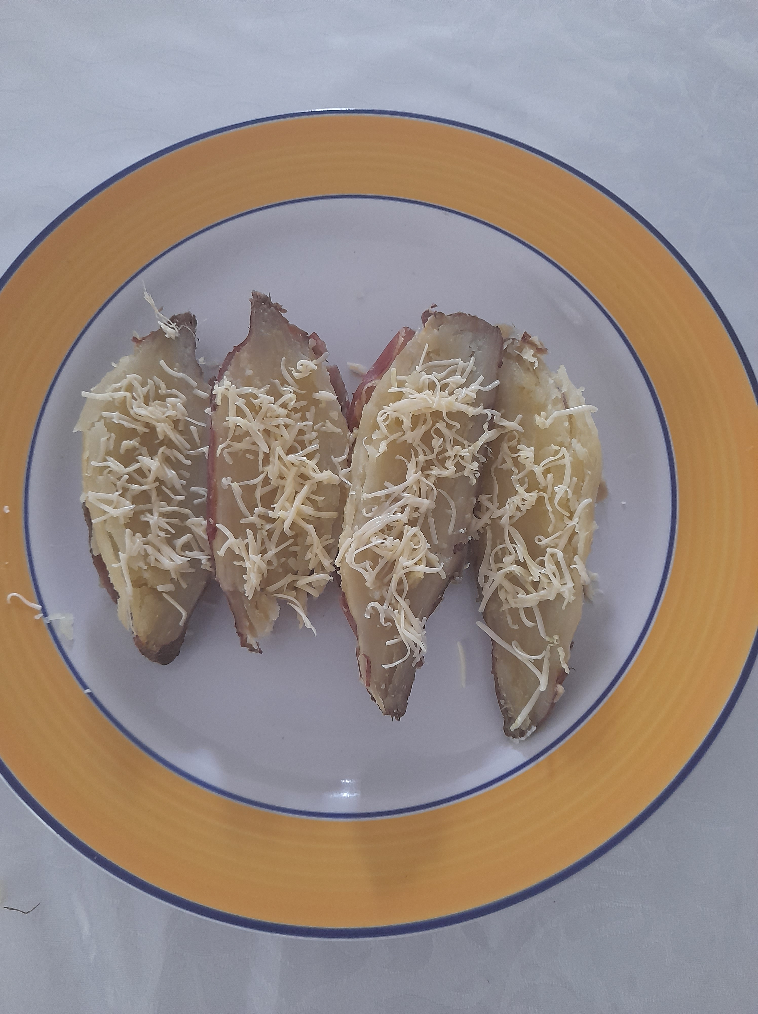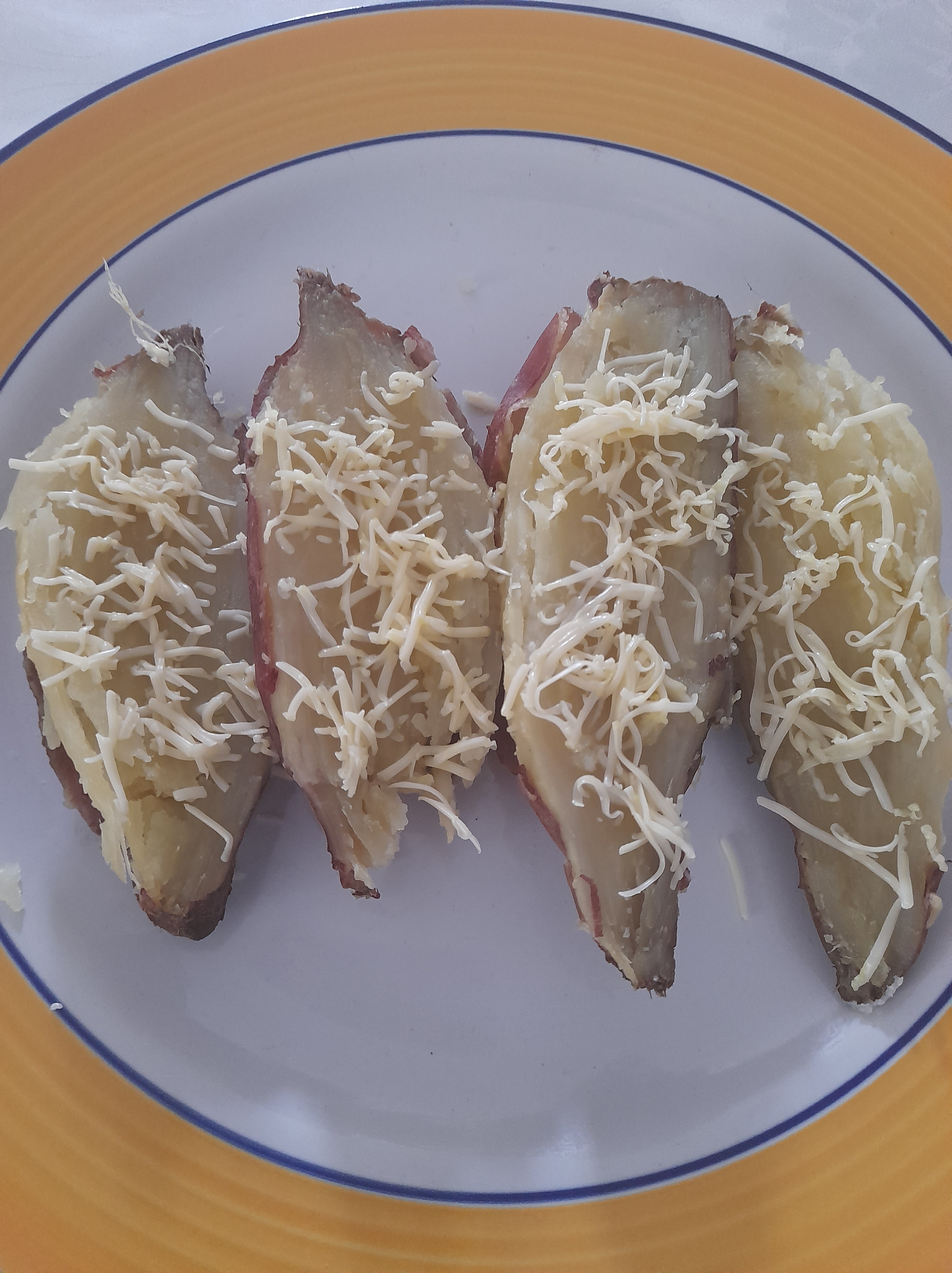 - Cut into halves the sweet potatoes. Spread butter and add grated cheese on top.
