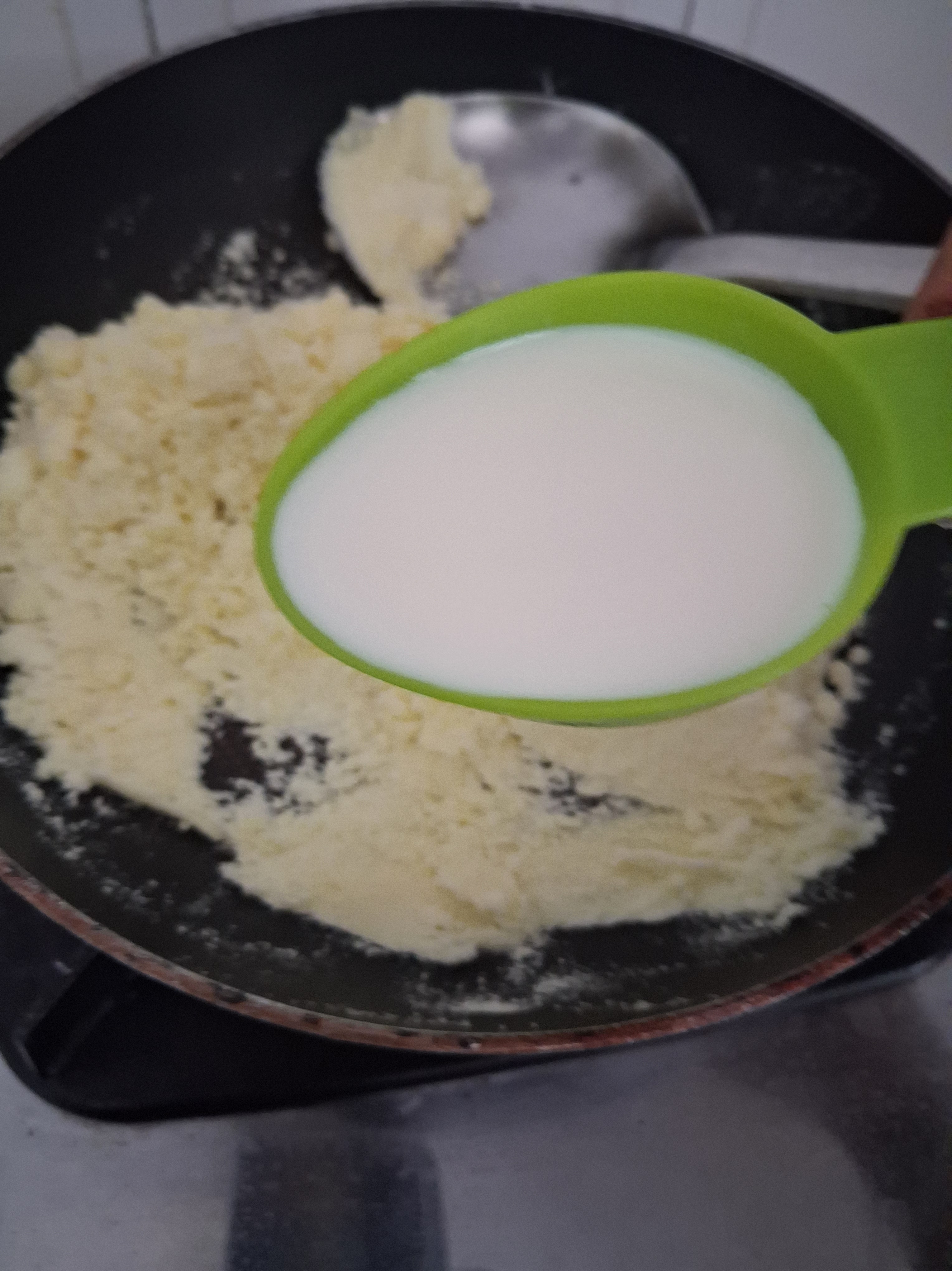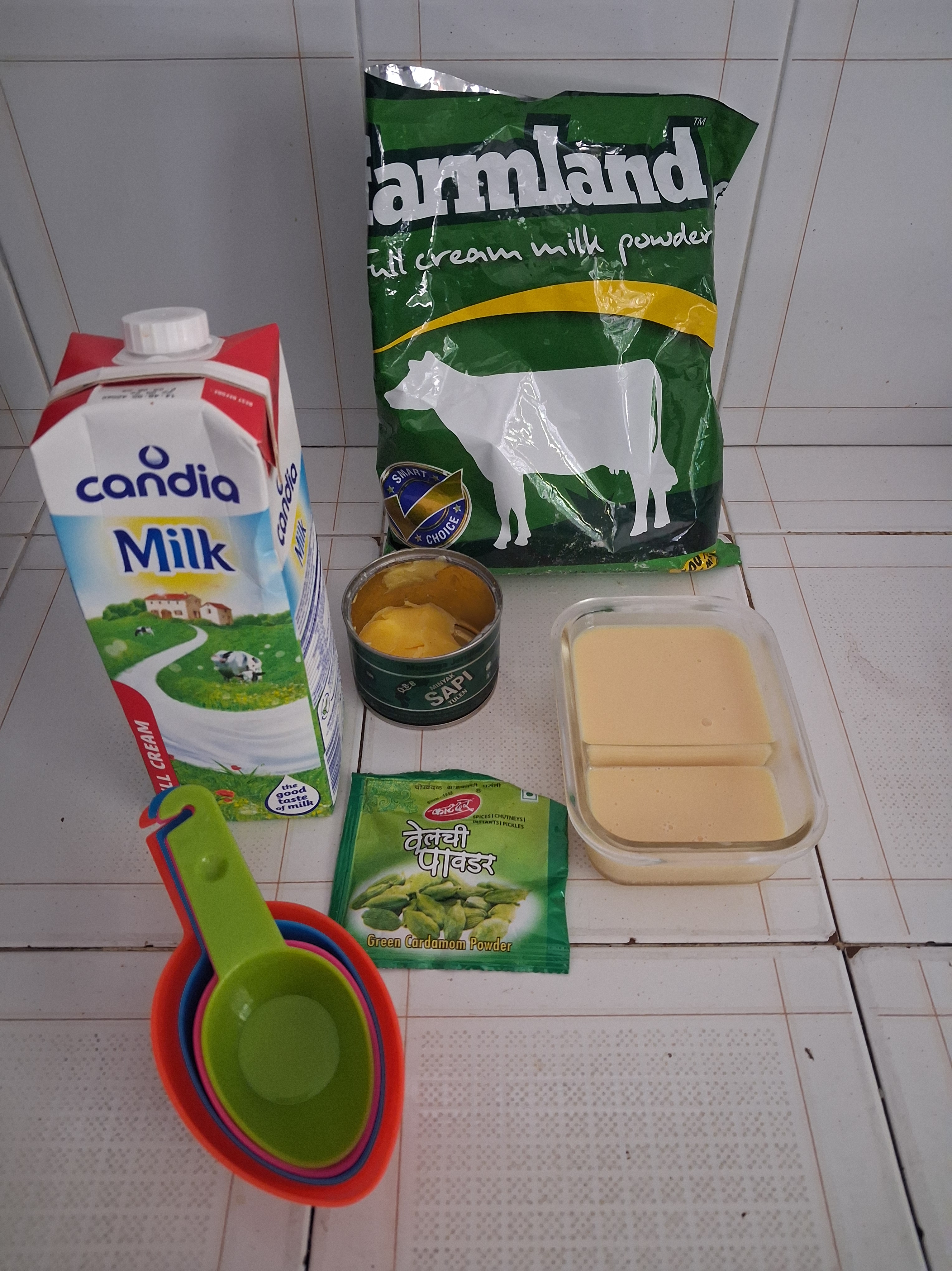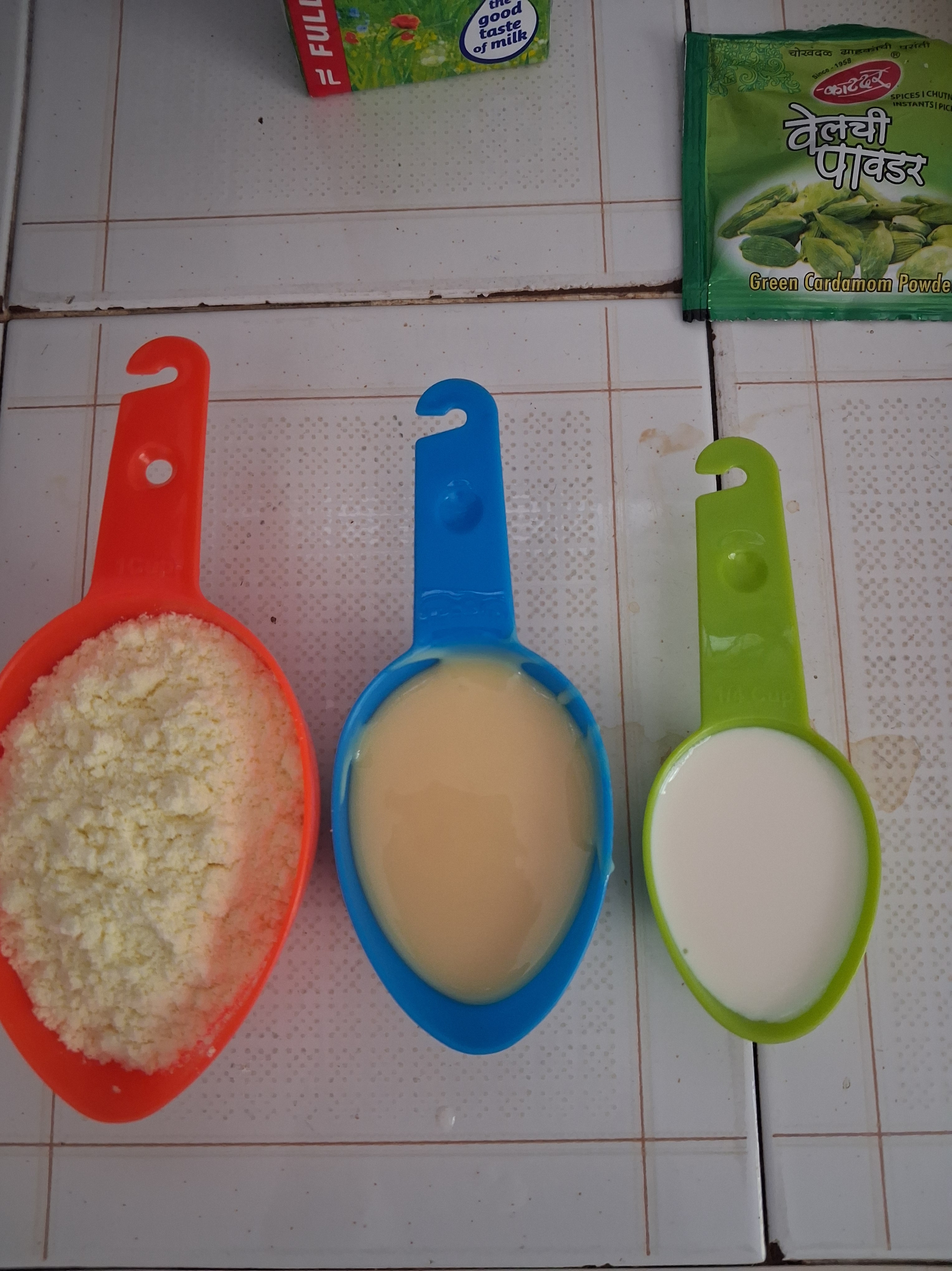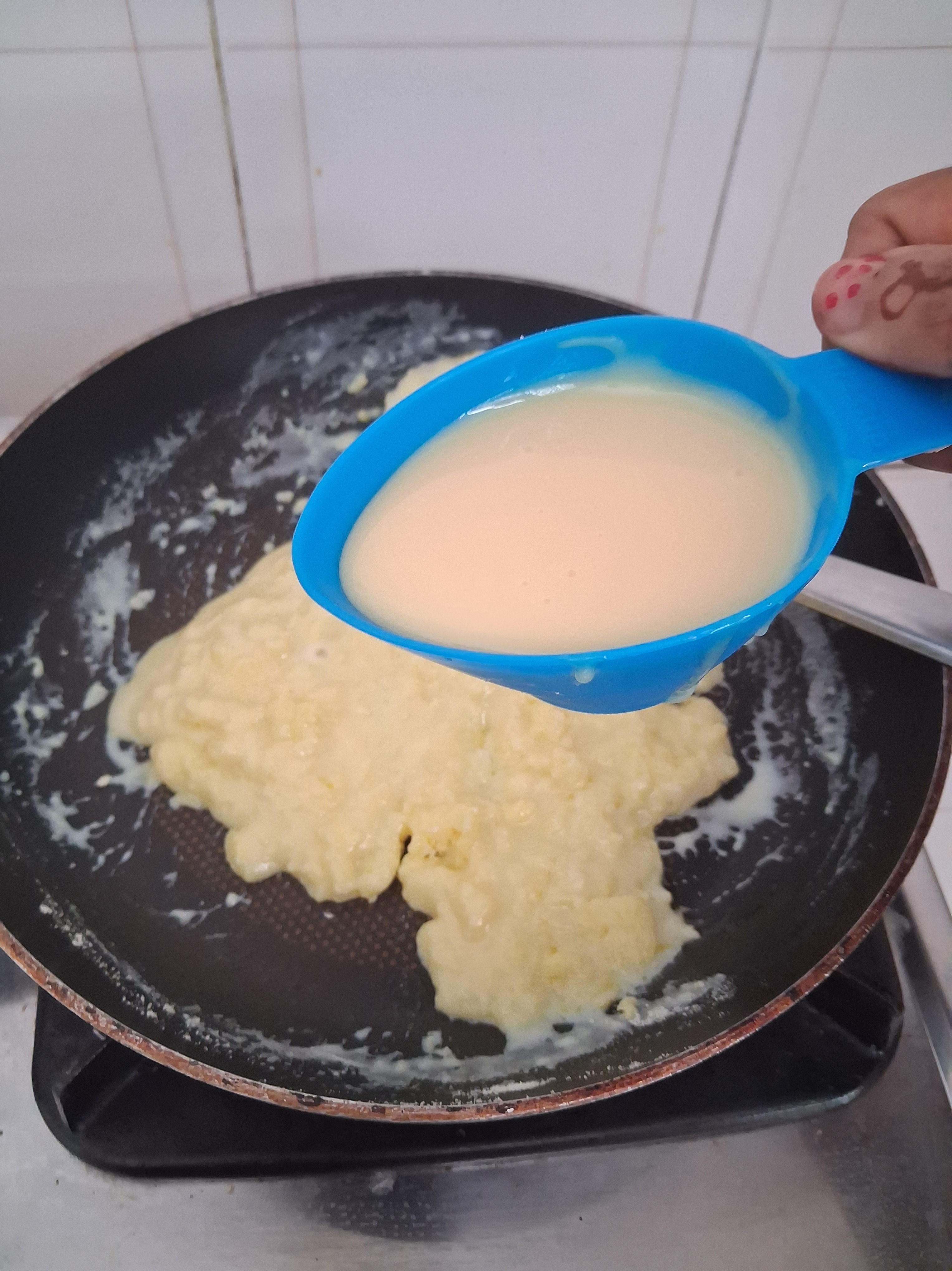 b) Add 1/4 cup milk, 1/2 cup condensed milk, 1 cup milk powder.