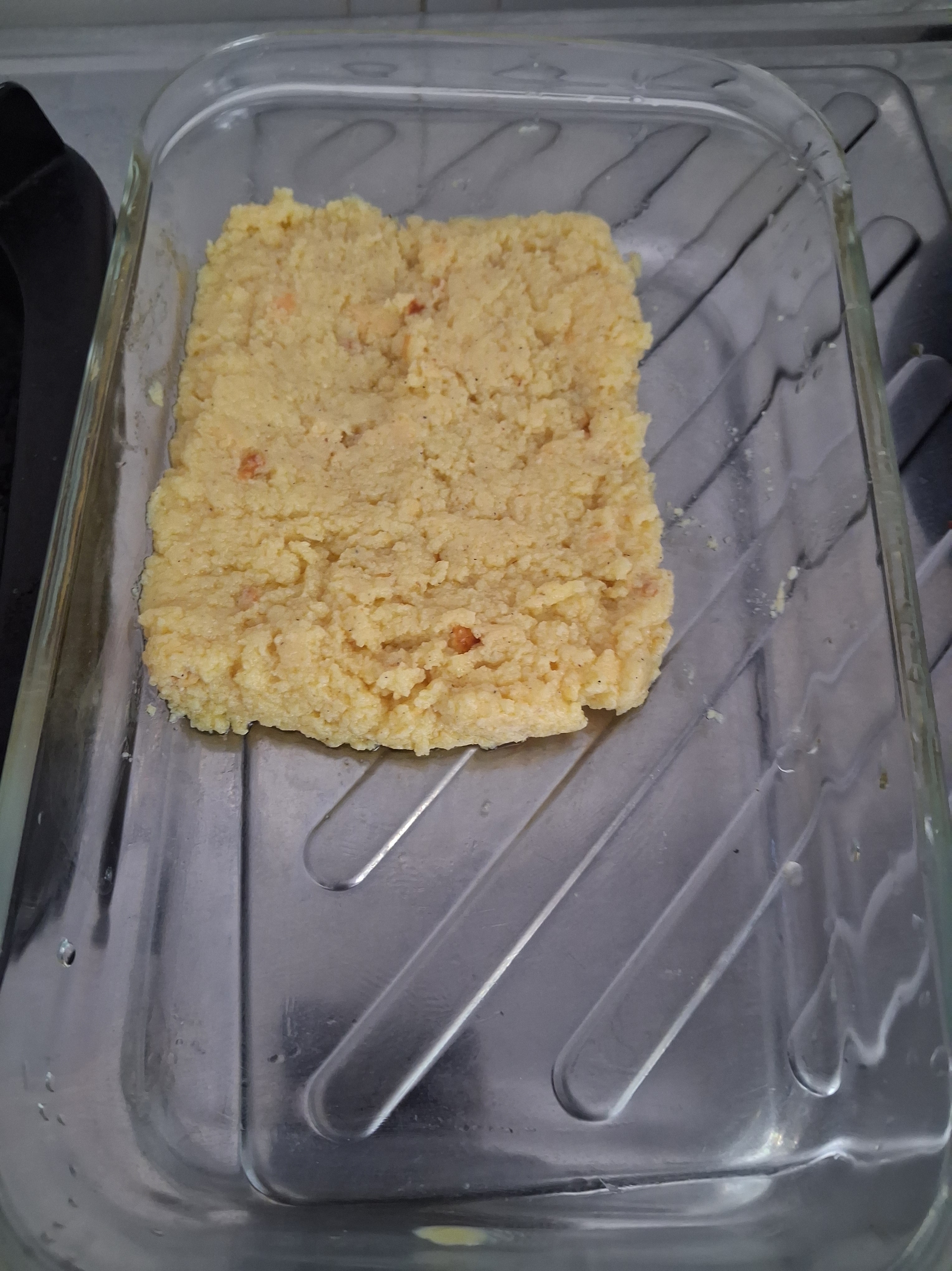 e) Pour the white cardamon barfi in a transparent bowl.