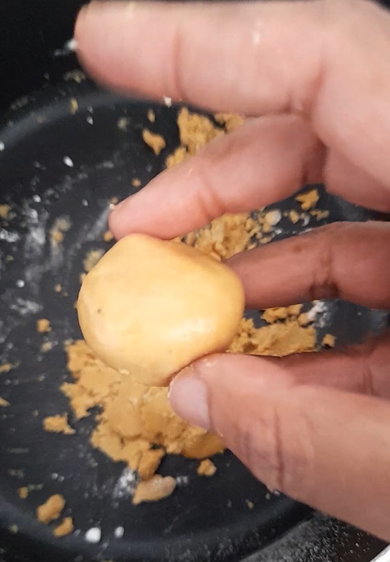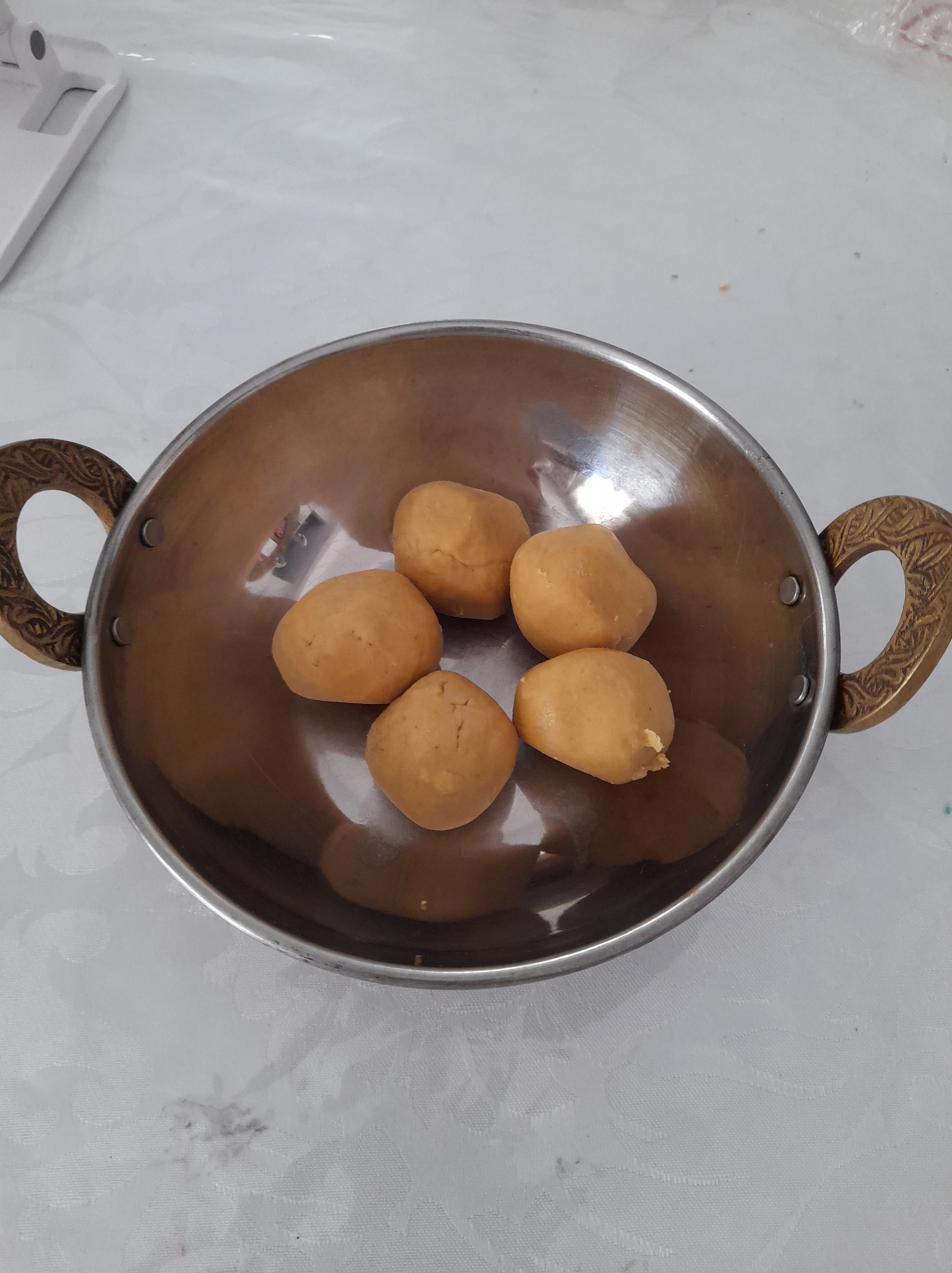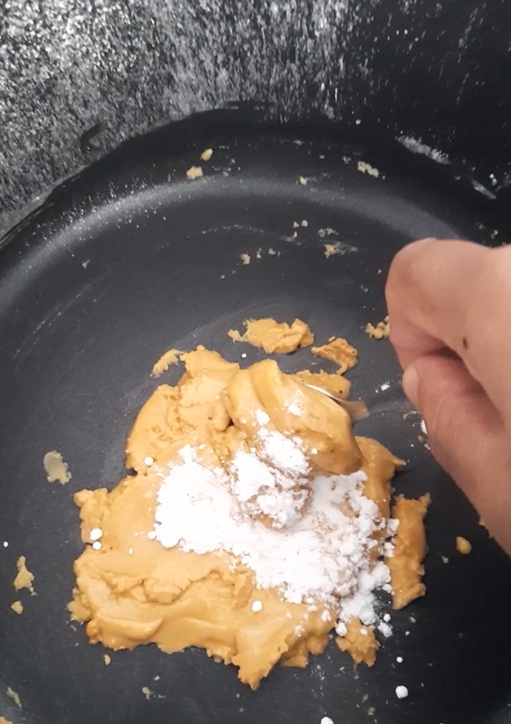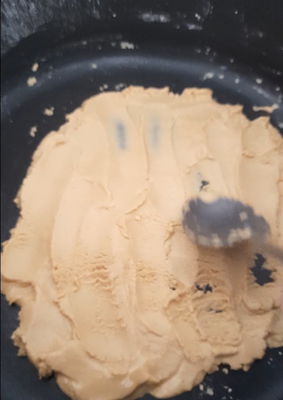 - After 8 minutes of stirring, bessan will loosen up and become a golden paste.