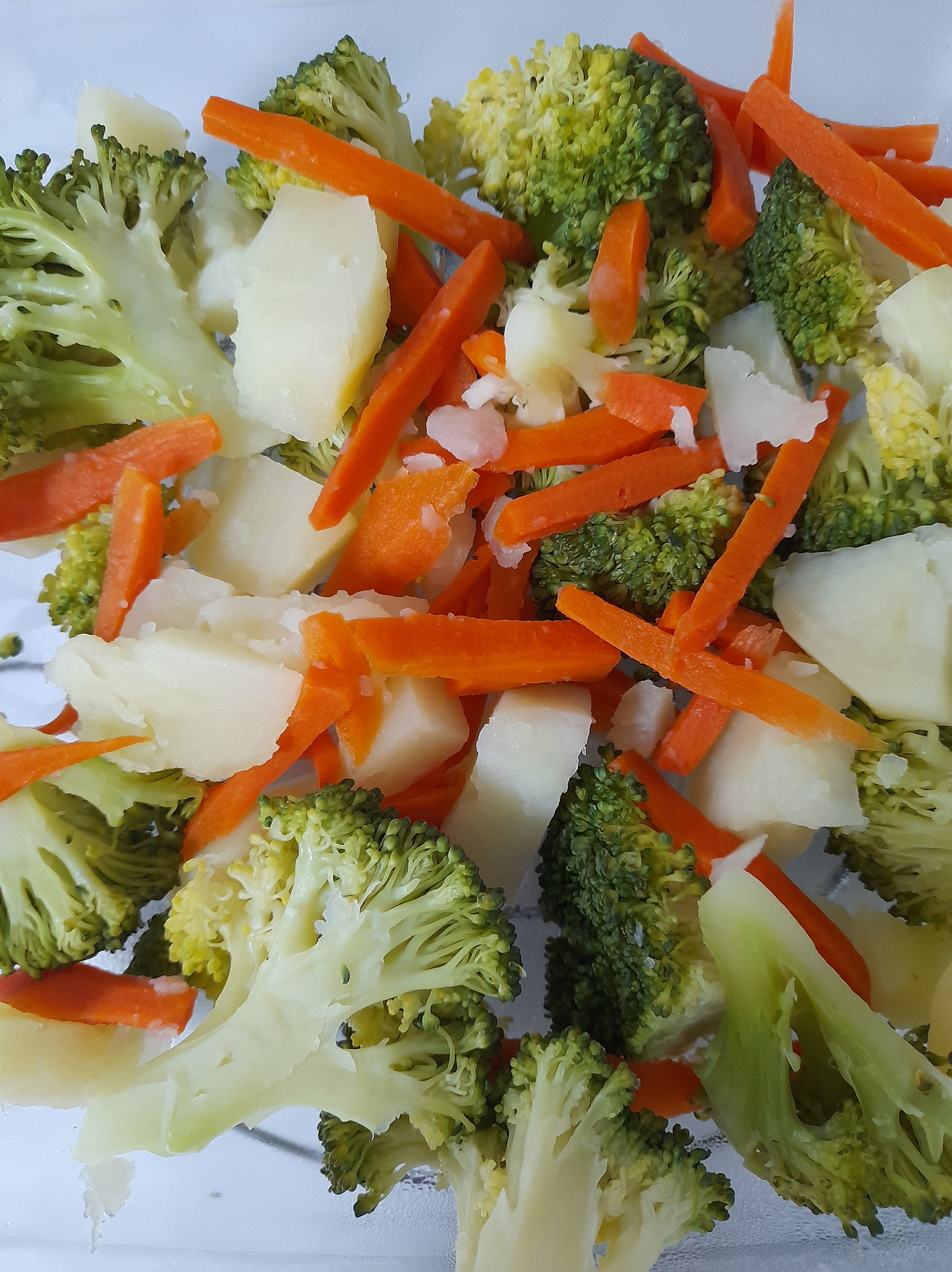 8. In a glassware, add the broccoli florets, potato dices and carrots. With a spoon mix the salad.