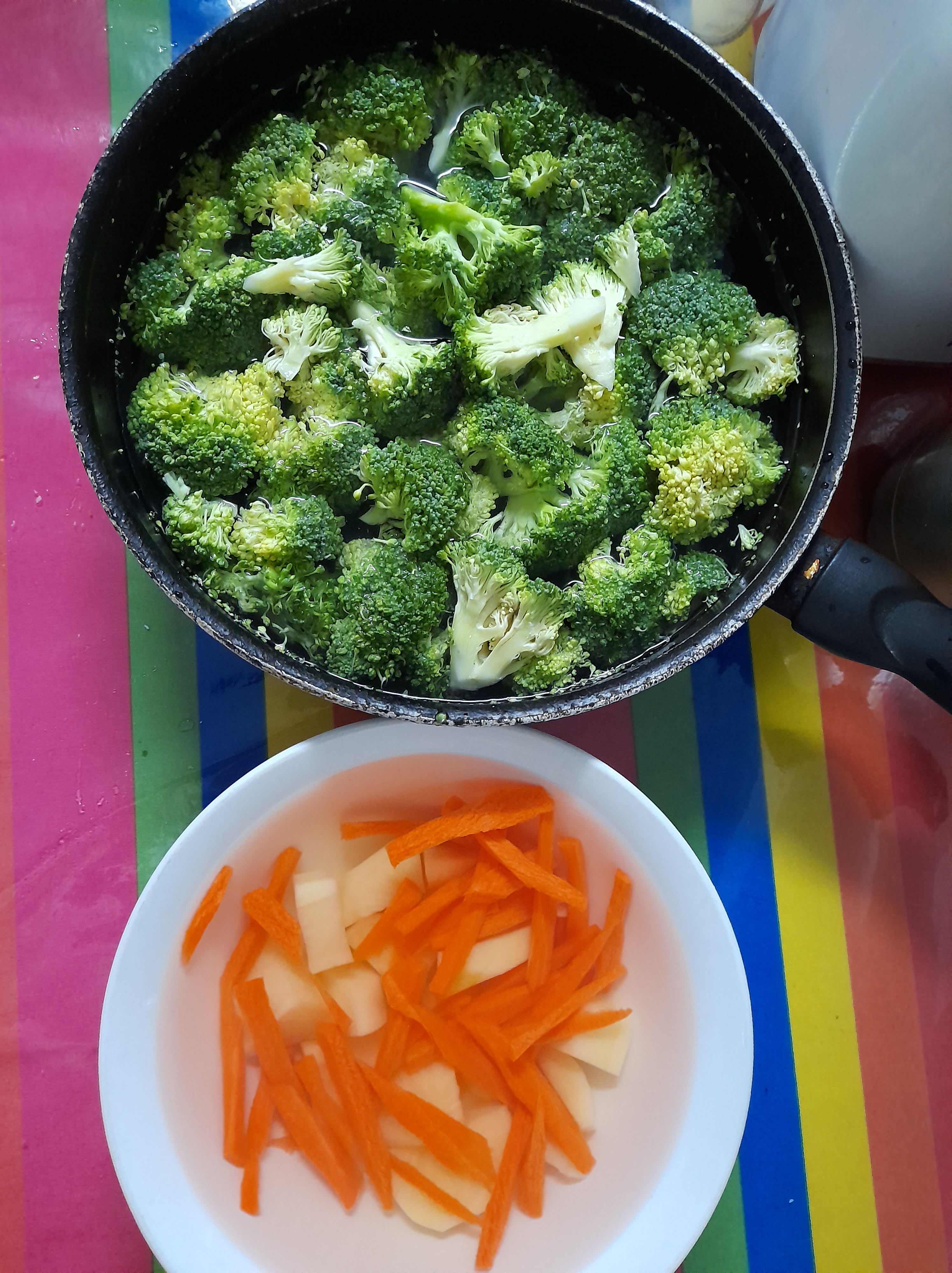 1.Wash a first time the broccoli. Cut the broccoli into florets/ heads and remove the outer part of the stem for each floret, that is actually the hard part to consume.