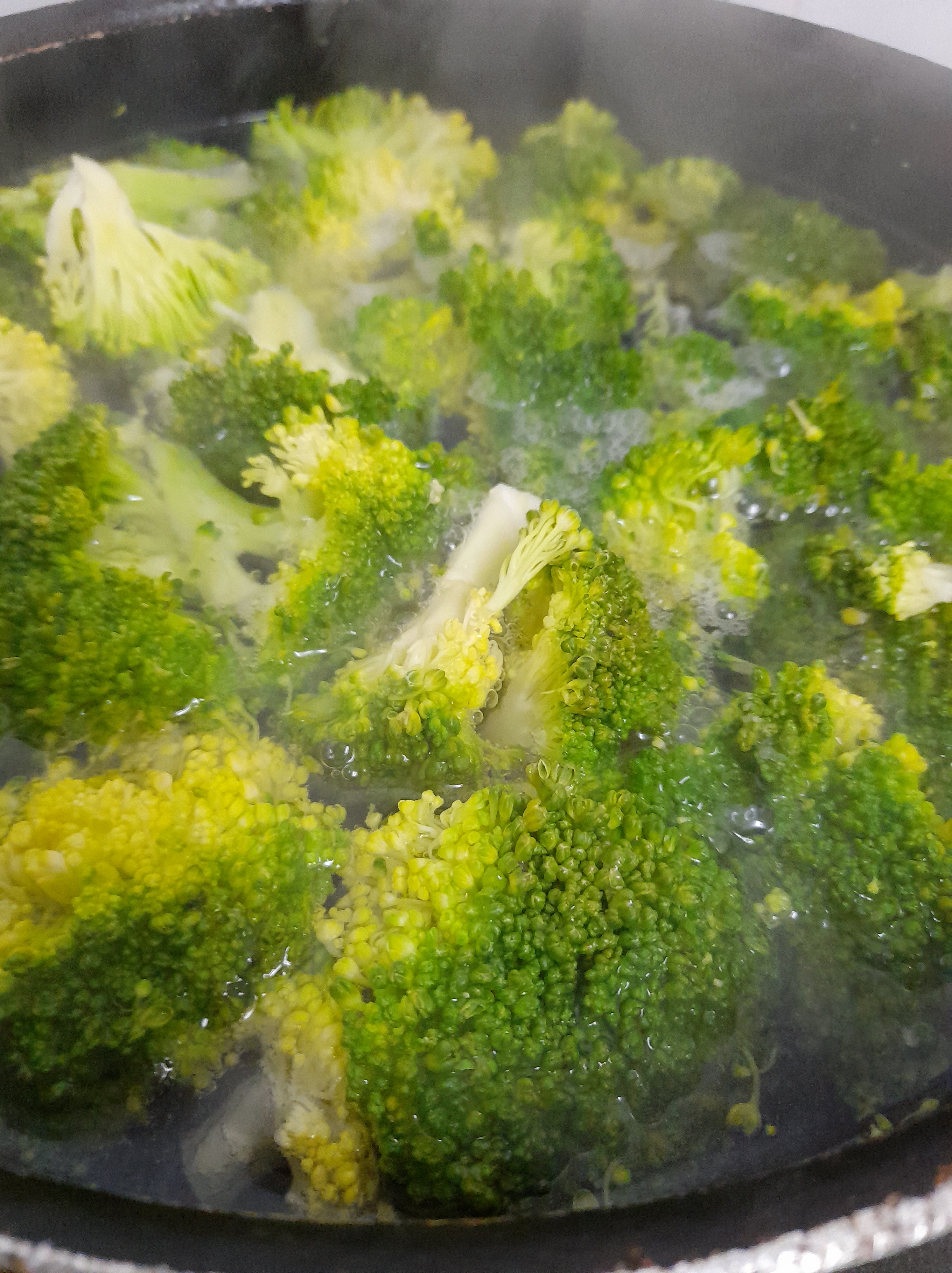 7. After one hour of soaking the broccoli, drain the water. Wash again the broccoli. Then in a pan put water again and parboil the broccoli for 10 minutes. Add salt to the broccoli and butter is optional. After 10 minutes, remove broccoli from flame and strain the water. The broccoli should be crunchy and not soft and overcooked.