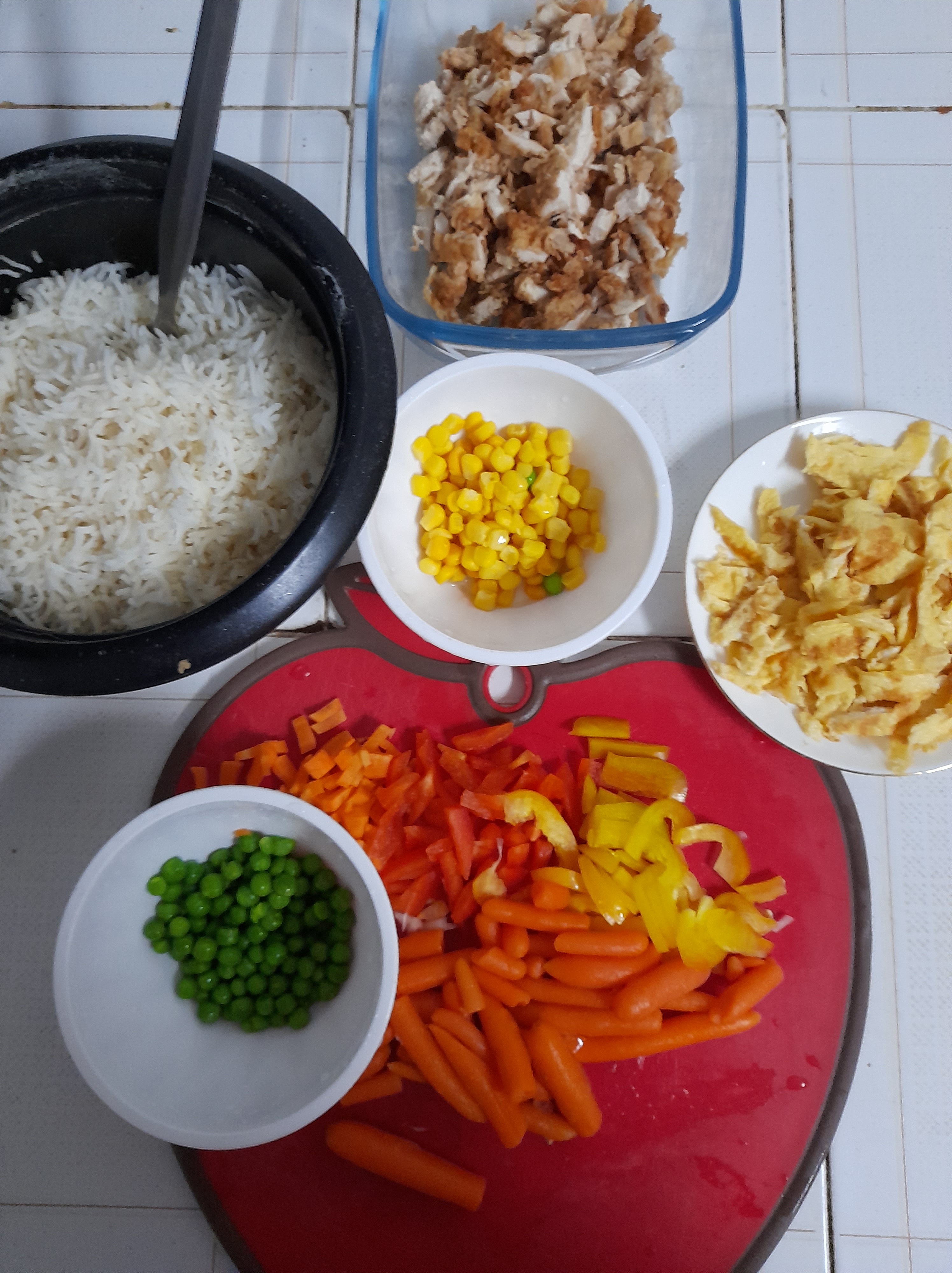 4. For the chicken, please refer to KFC chicken style. Or you can just chopped some breast chicken, wash them, pat dry and fry on medium heat with some soy sauce.