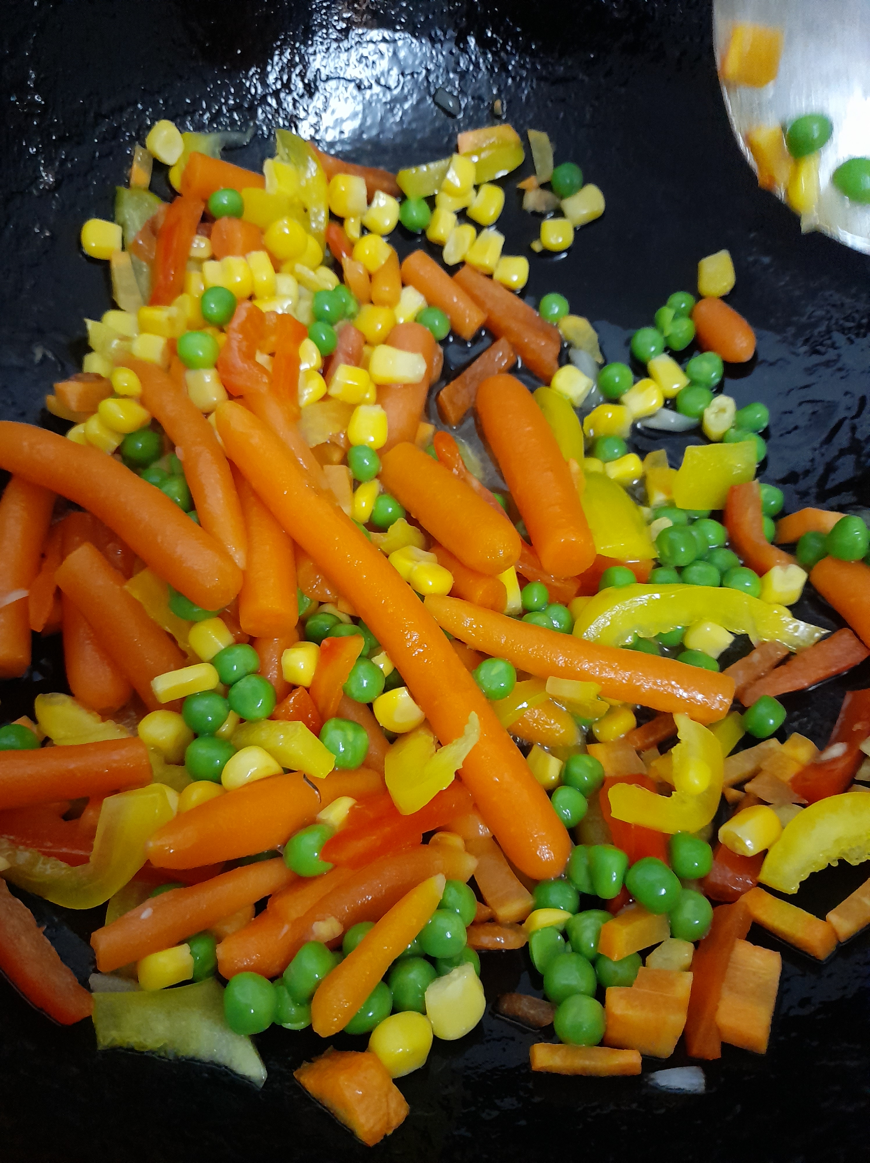 11. Add the peas, carrots, corns. Cook for few minutes.