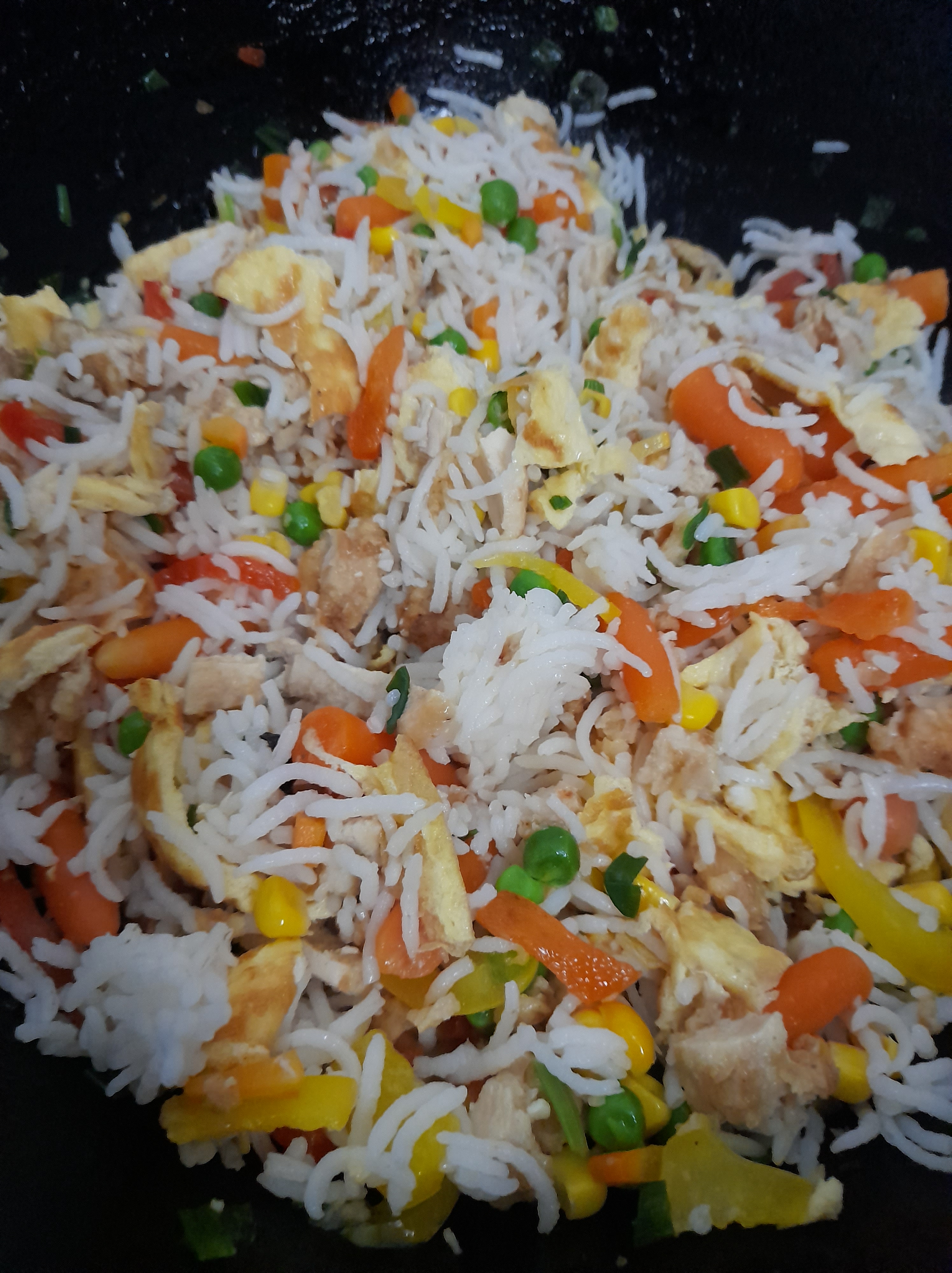 15. Slowly add the remaining rice little by little. If there is some extra white rice do not keep adding to the pan. Balance the quantity of vegetables, egg, chicken with the amount of rice. Cook for a few minutes.