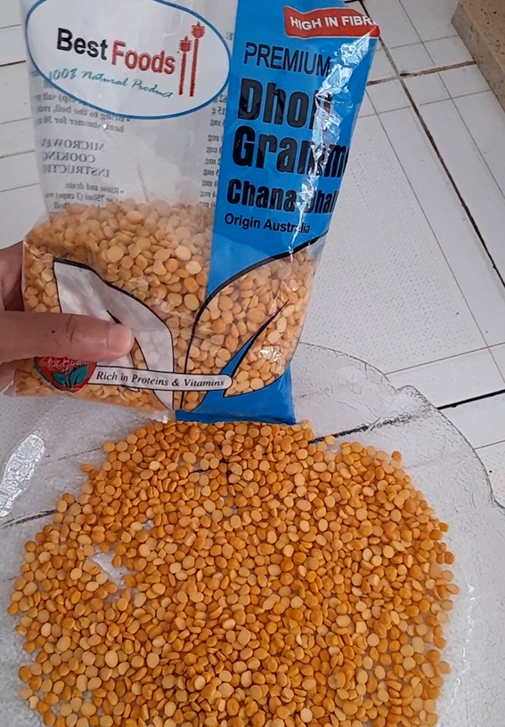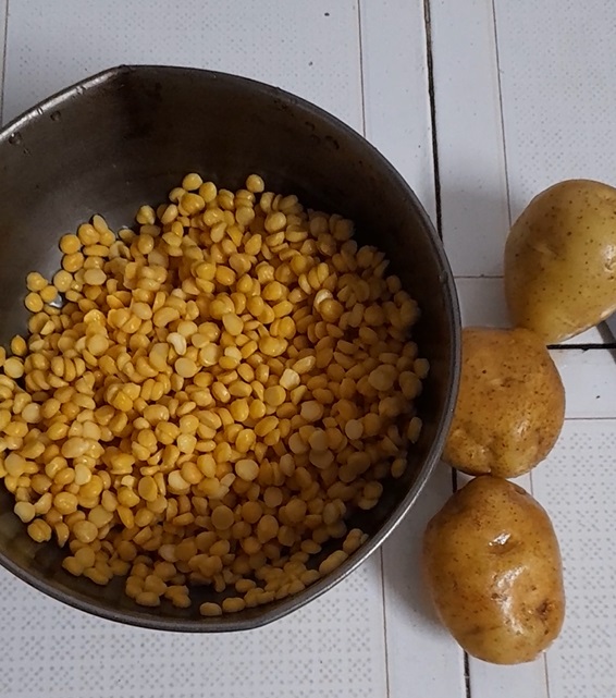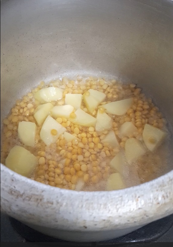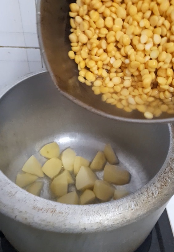 In a pressure cooker, add oil. Put 1 tbsp turmeric, cumin powder, garam masala, fry on medium heat. Add chana dhall and potatoes. Add some water and salt. Close lid of pressure cooker and wait for 3 whistles. Check softness with a fork. If well cooked, mash the mixture of chana dhall and potatoes. Make small round balls with the mixture of chana dhall and potatoes.