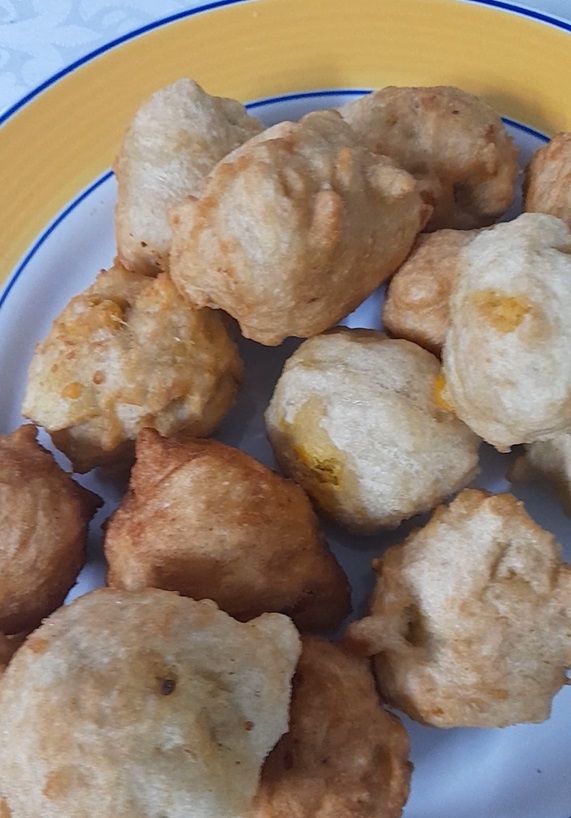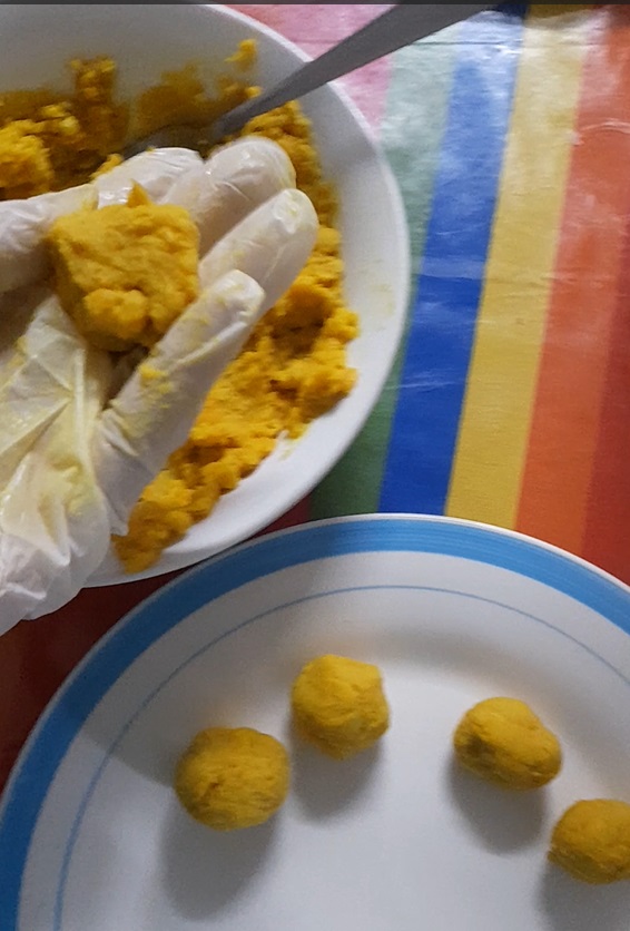 First, wet your hands with water. After 4 hours of dough rest, wrap each ball (mixture of potato and chana dhall) with flour dough that has risen.