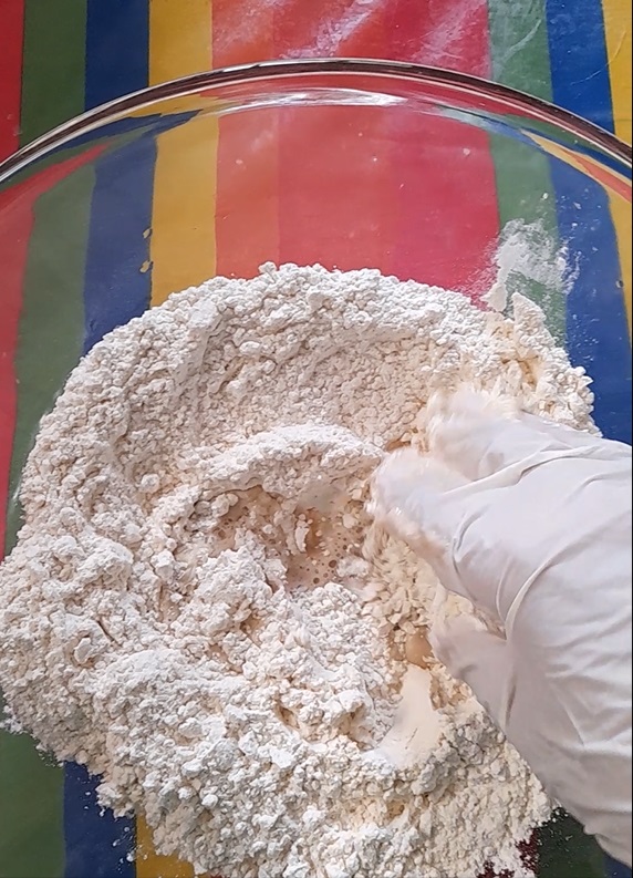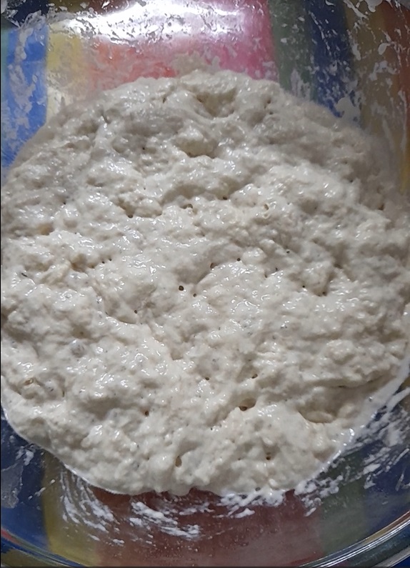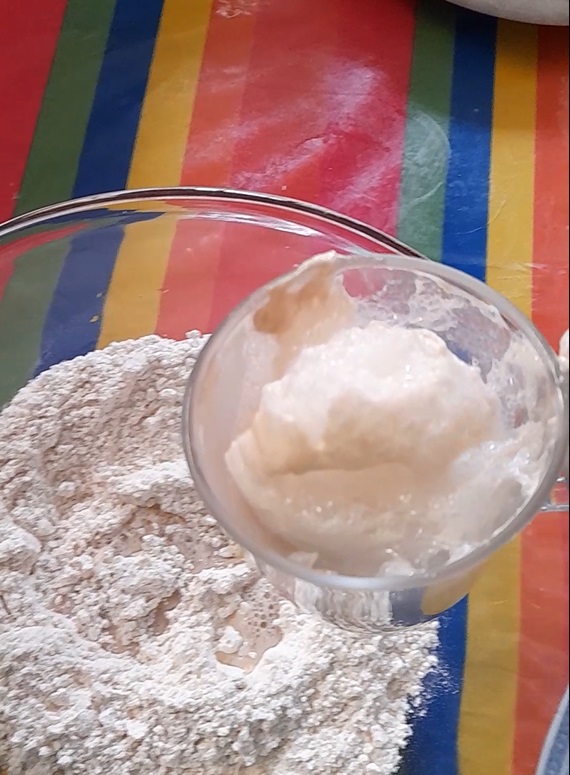 In a bowl, add 300g of flour, add salt, add a glass of yeast and some water to make a soft dough. Let the dough rest for 4 hours. Cover bowl with plastic film and let dough rest. The dough should have risen after rest.