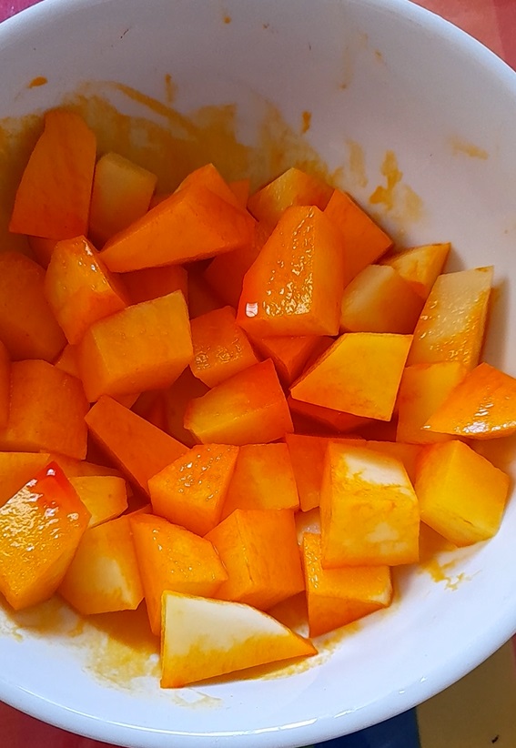 - Wash a potato and dice it into cubes. Put some yellow coloured powder over the diced potatoes and fry in oil for some minutes. Then remove from heat.