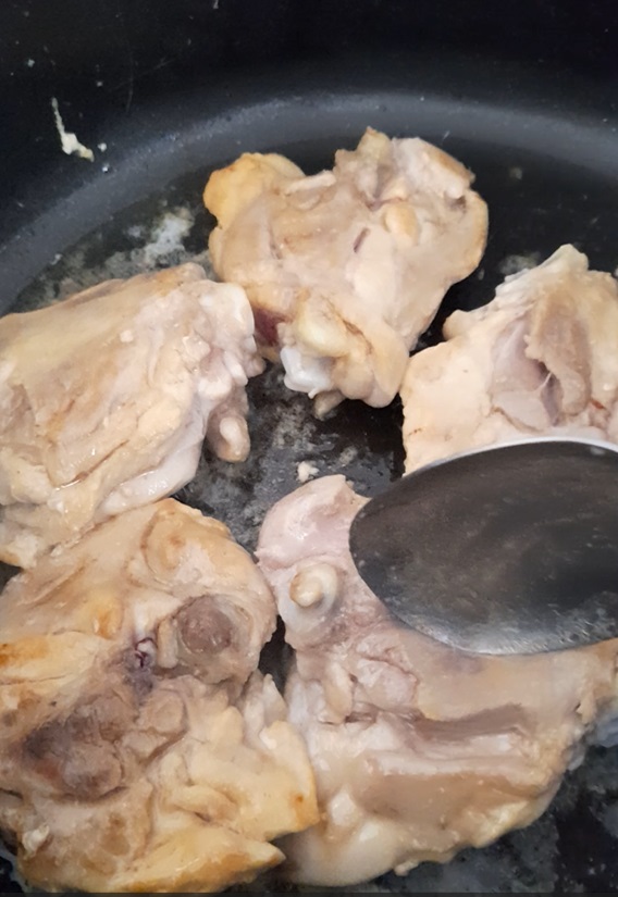 - Wash the chicken pieces and remove the outer thick skin only. Fry the chicken in oil till they change colour.