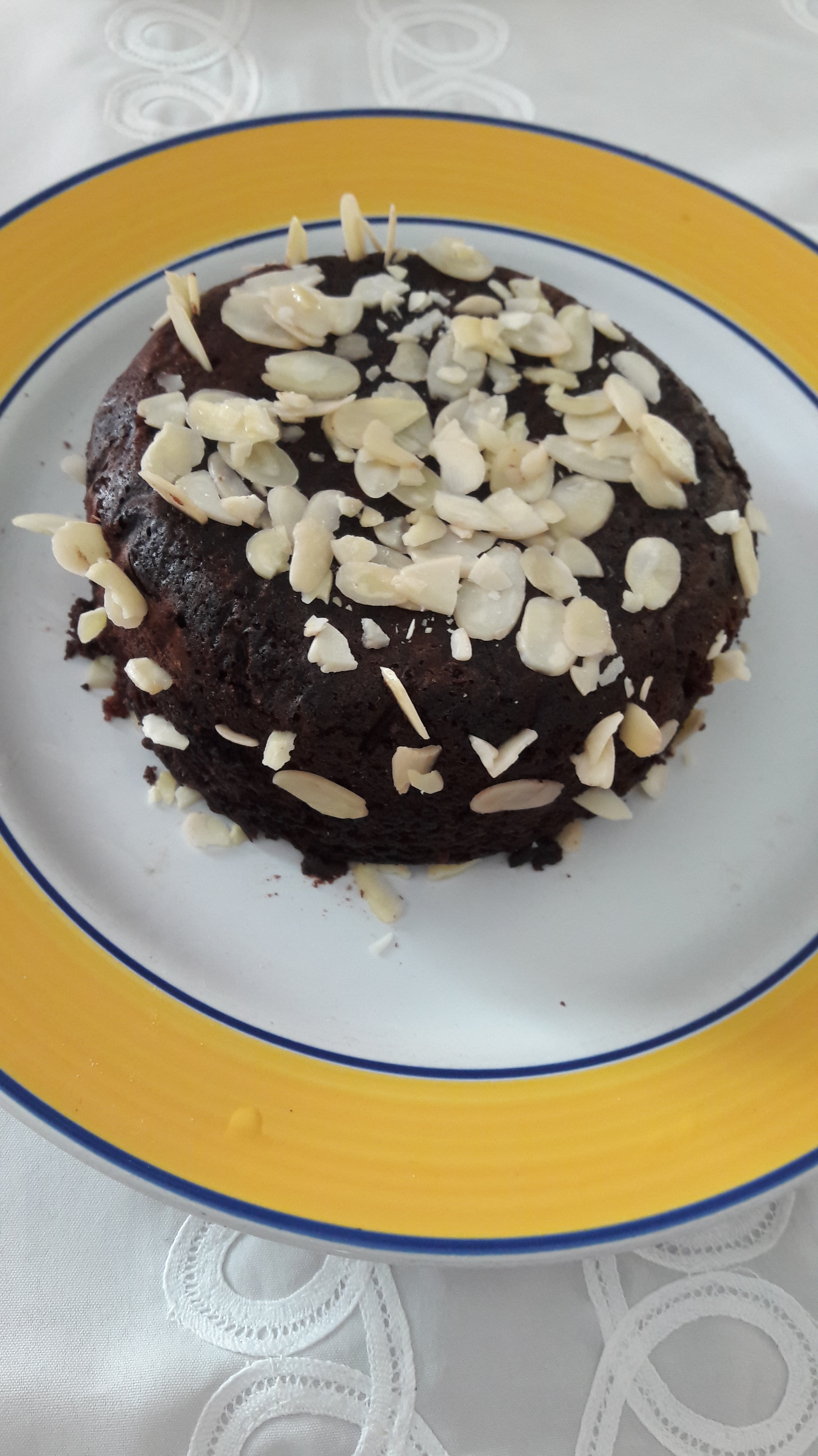 9. For cake decoration, 1 tbsp icing sugar in 2 tbsp of water. Mix water and sugar to dissolve the sugar.. With a brush apply the mixture on top of cake. Add almond flakes over.