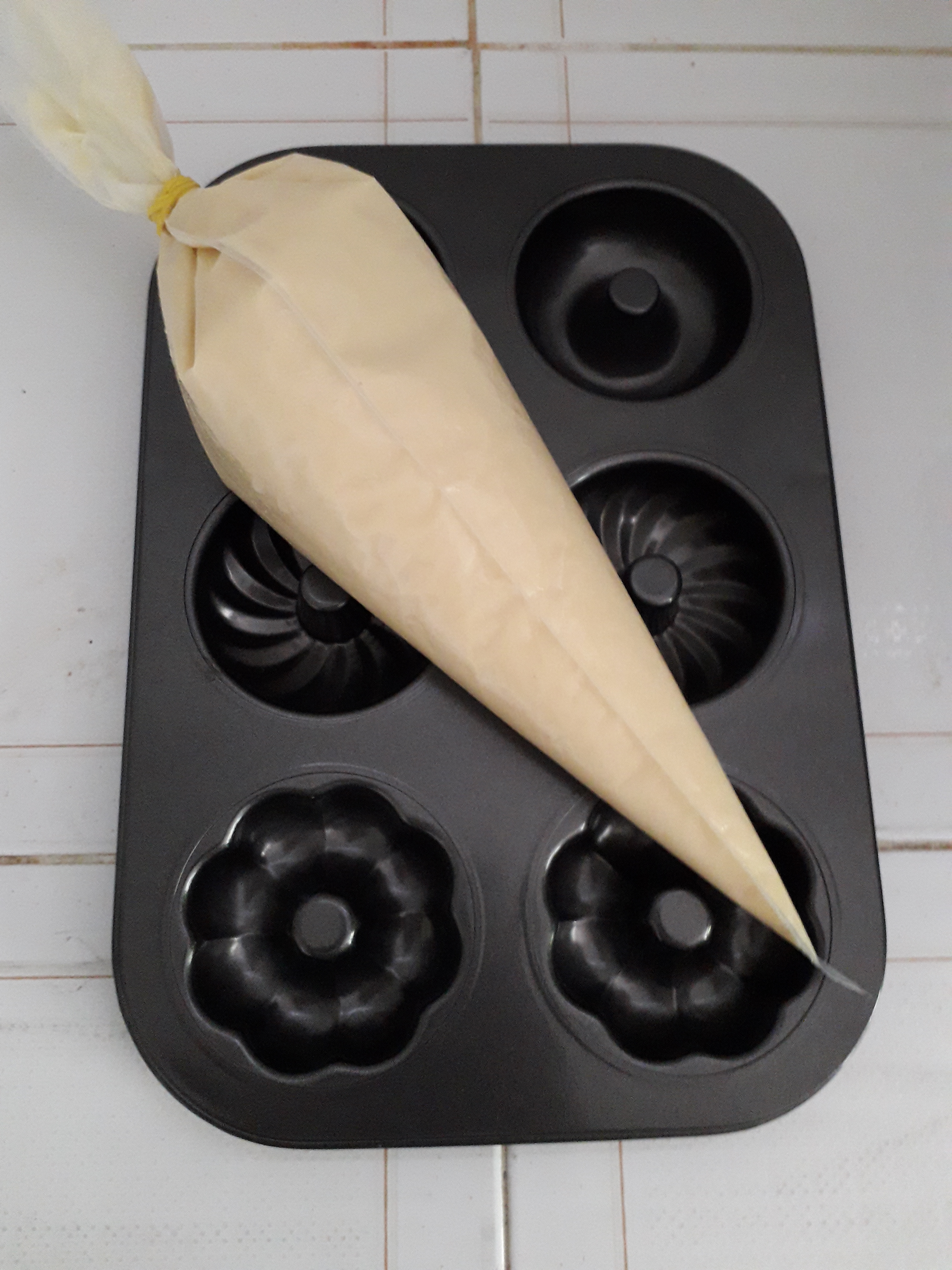 4.Grease a doughnut tray. Pour the runny batter in the tray.