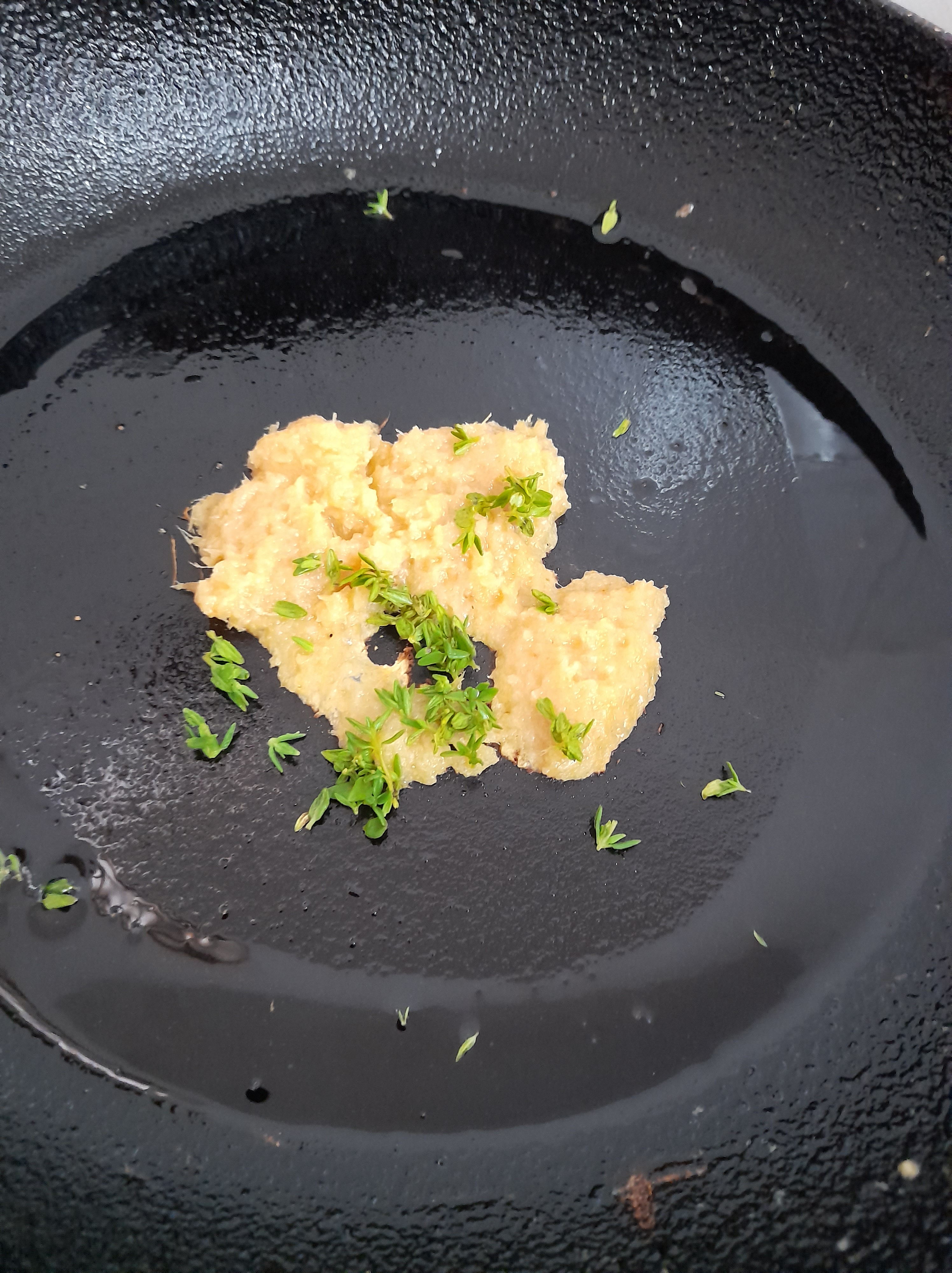4. In a pan, add 2 tablespoon oil. Fry ginger/garlic paste, add thyme leaves and stir for a few minutes.