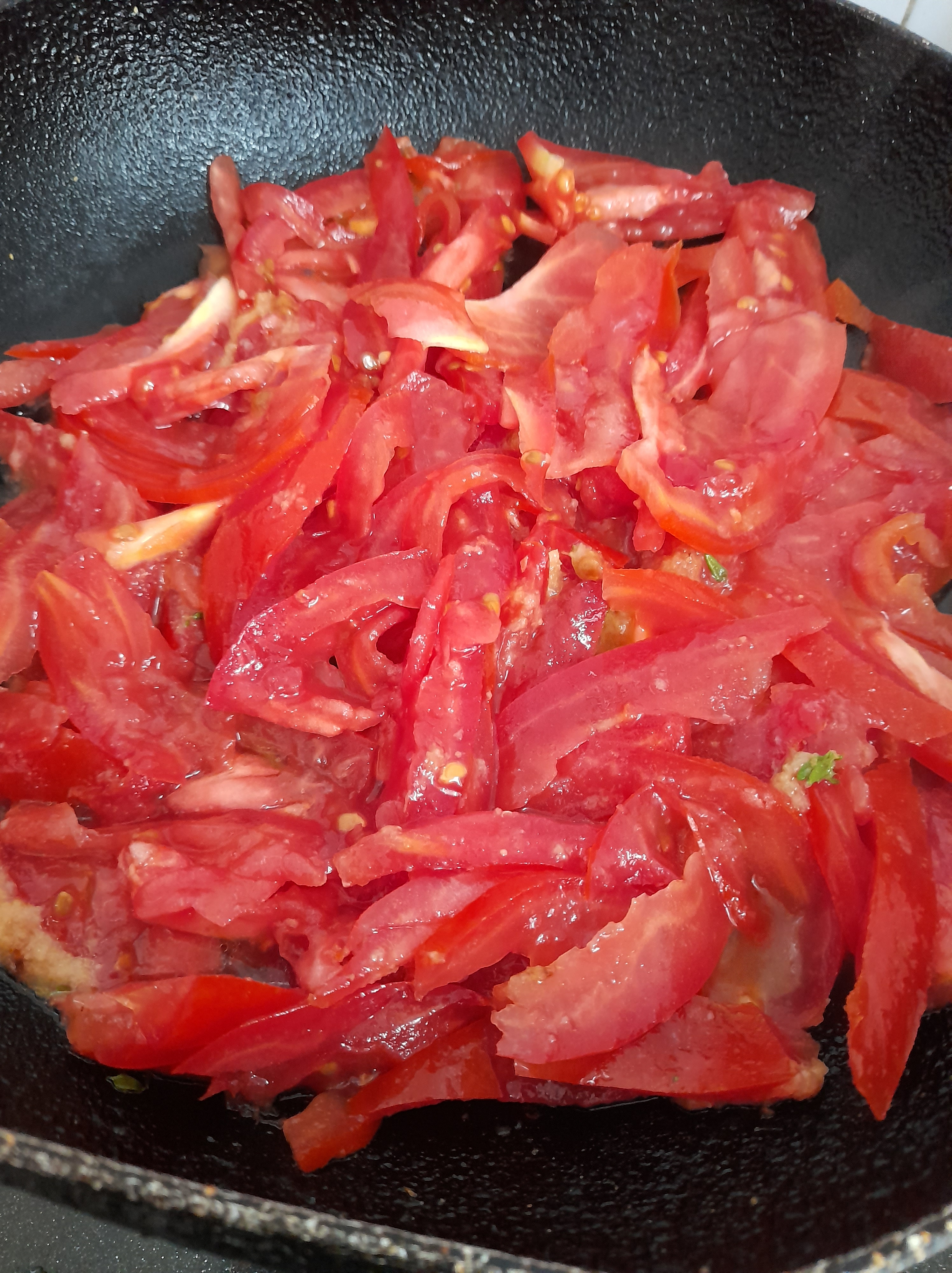 5. Add the slices of tomatoes and cook. It will become a bit fluid after some time. Optional to add salt to tomatoes.
