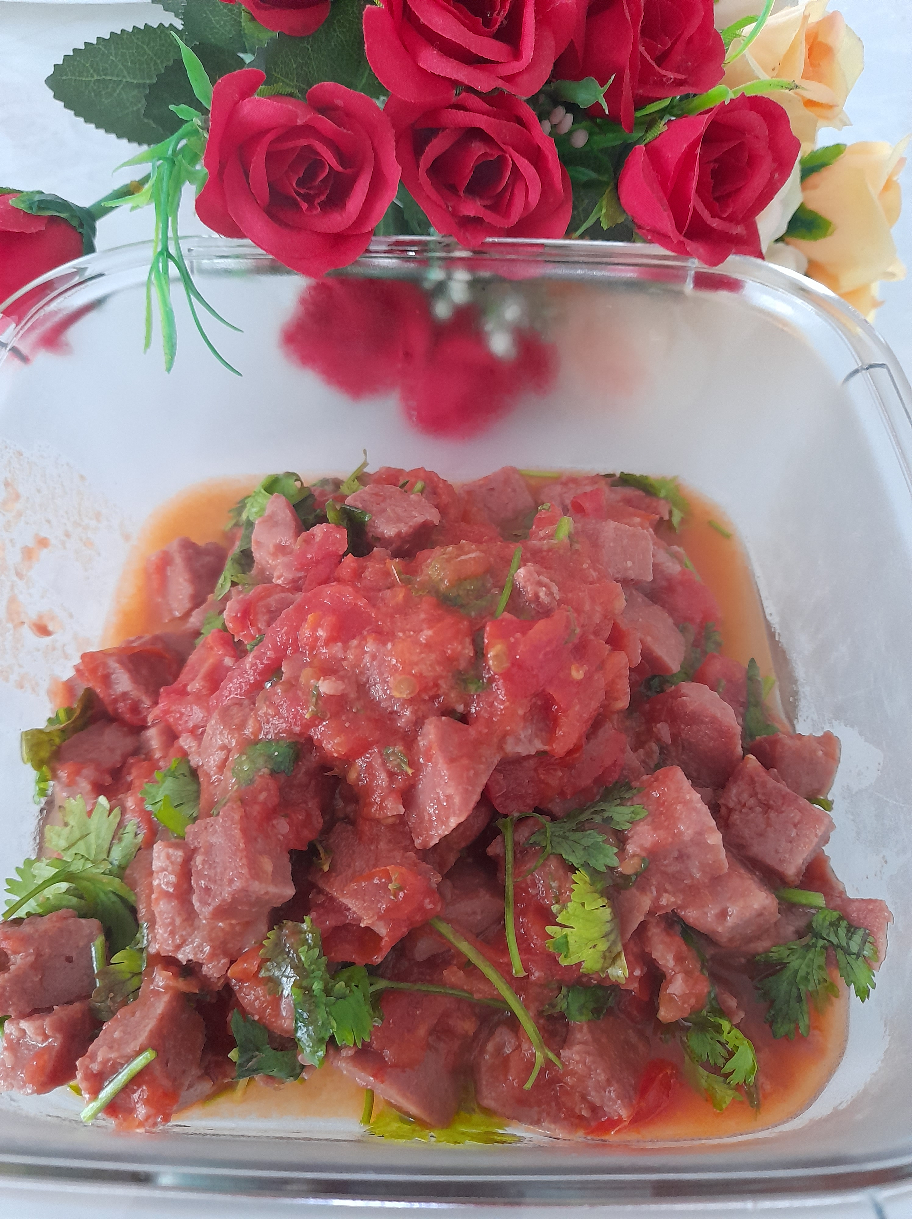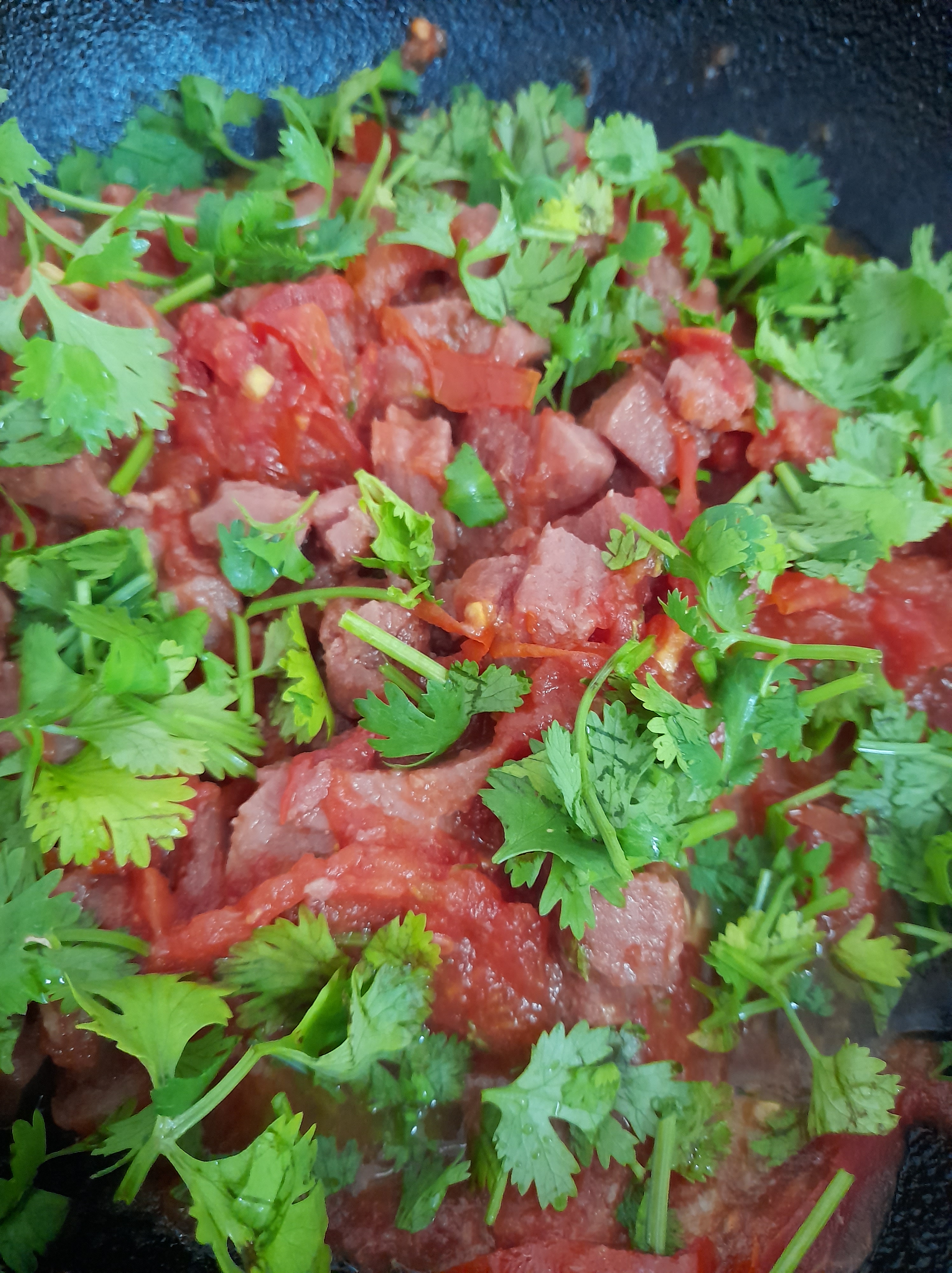 6. Add in the fried corn mutton in the tomatoes. Keep stirring and cook for some more minutes.