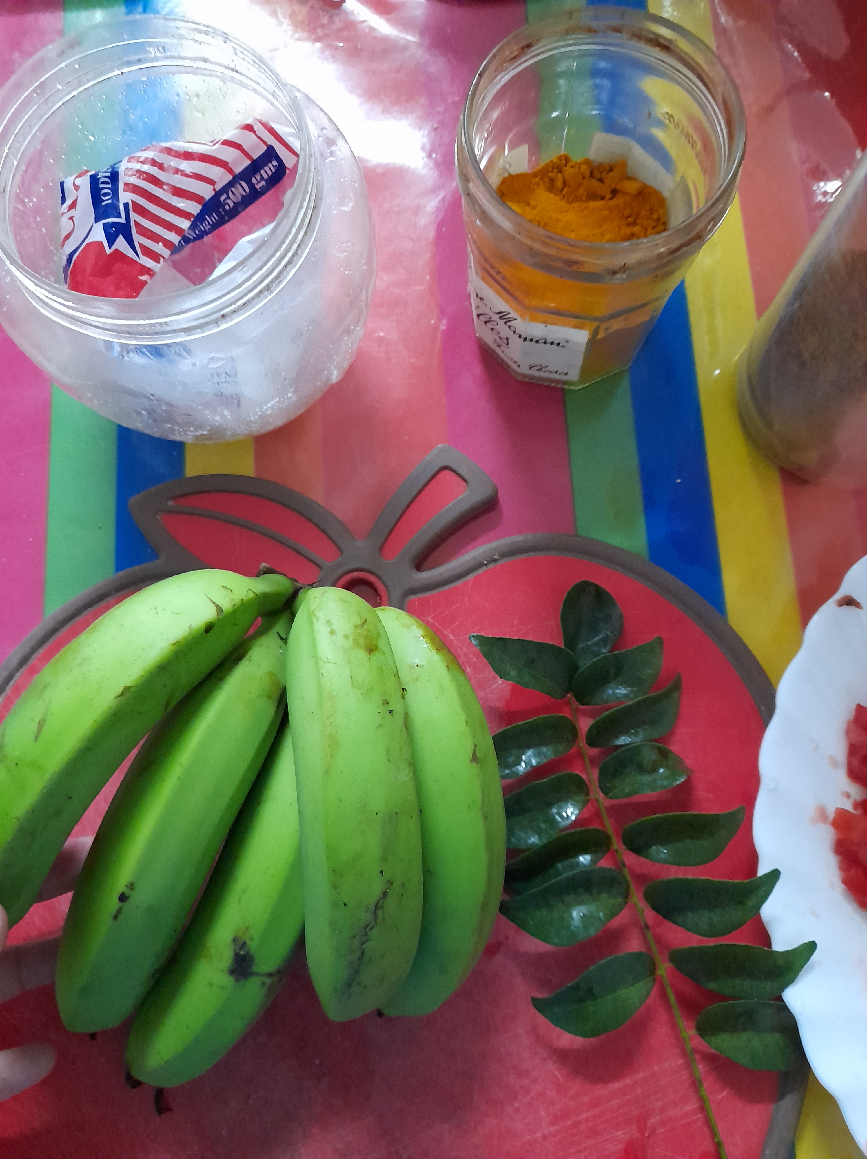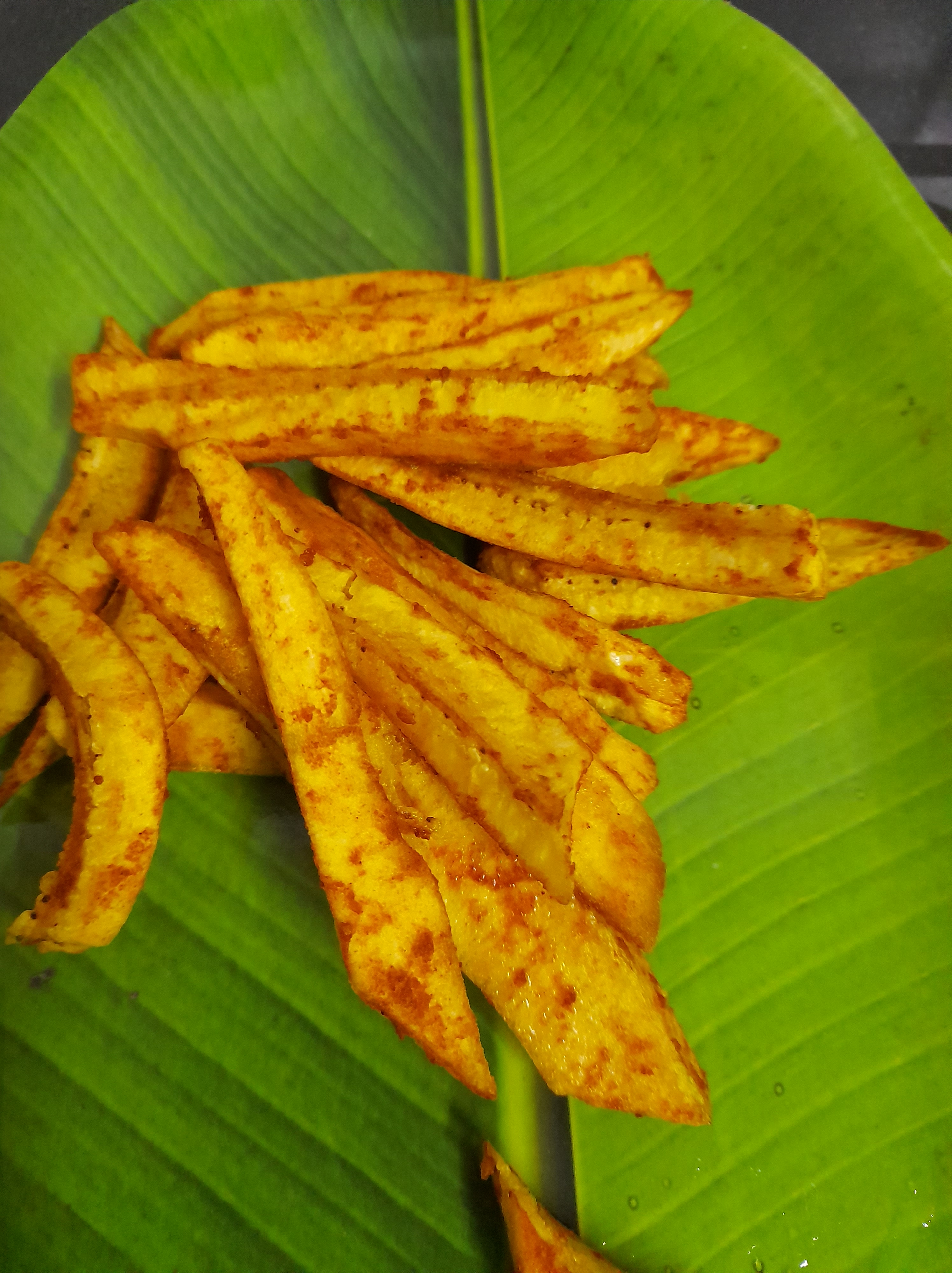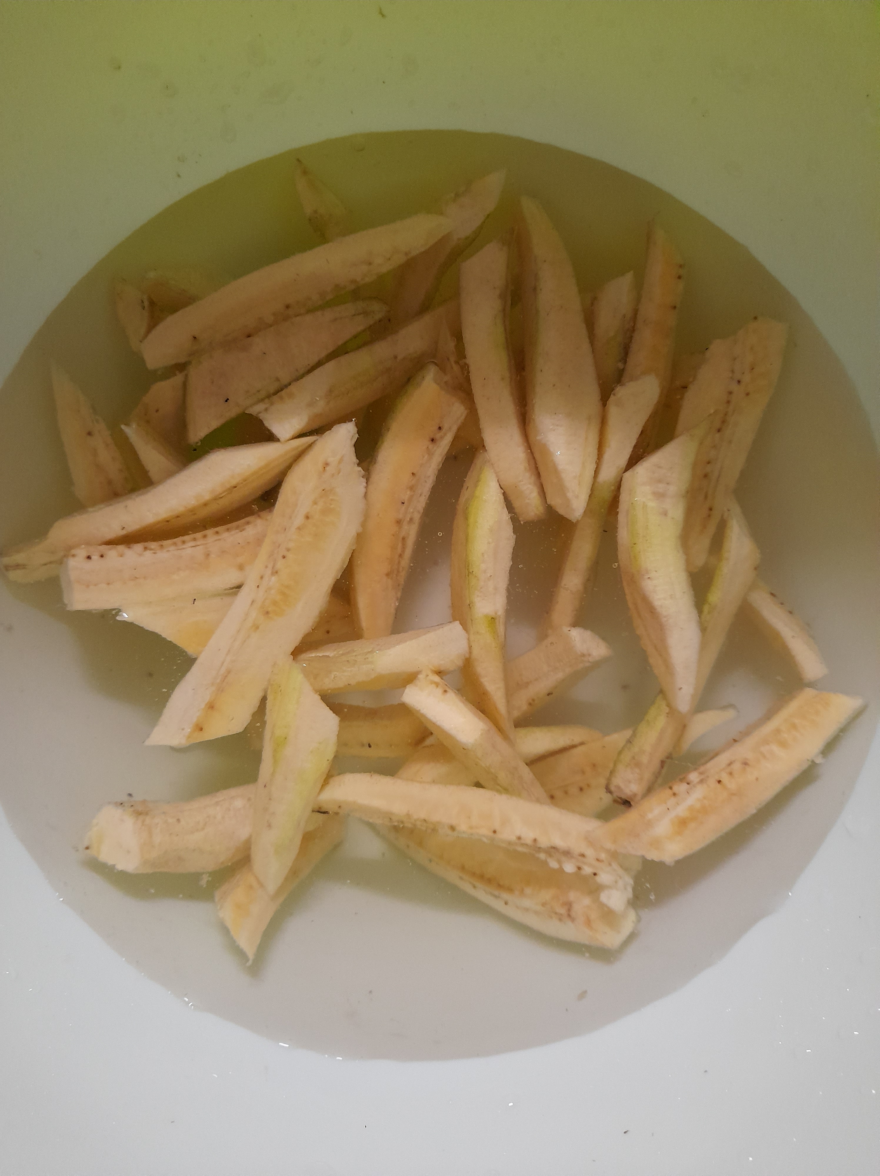 4.Marinate the green bananas slices with 1 tbsp turmeric powder and salt.