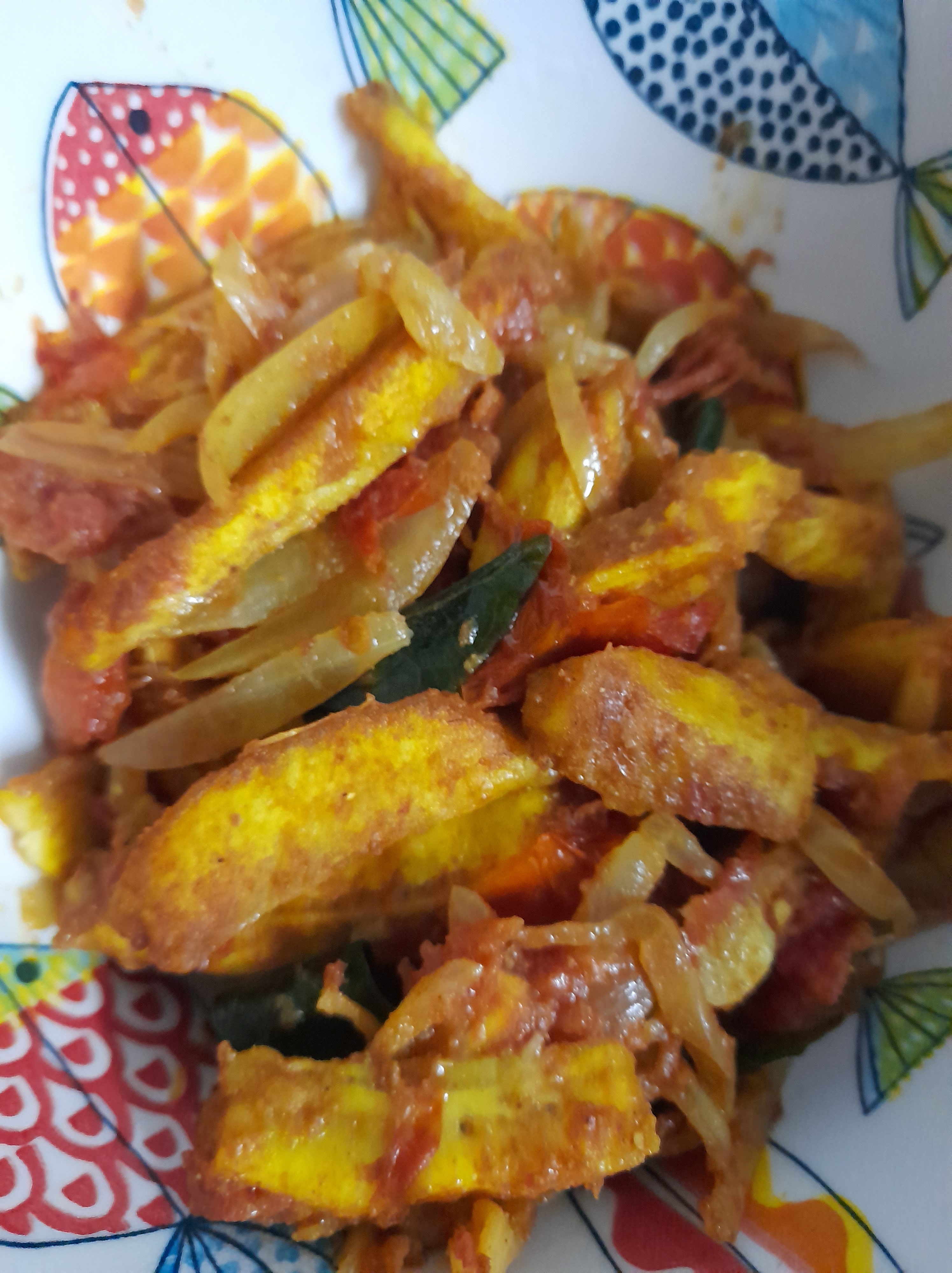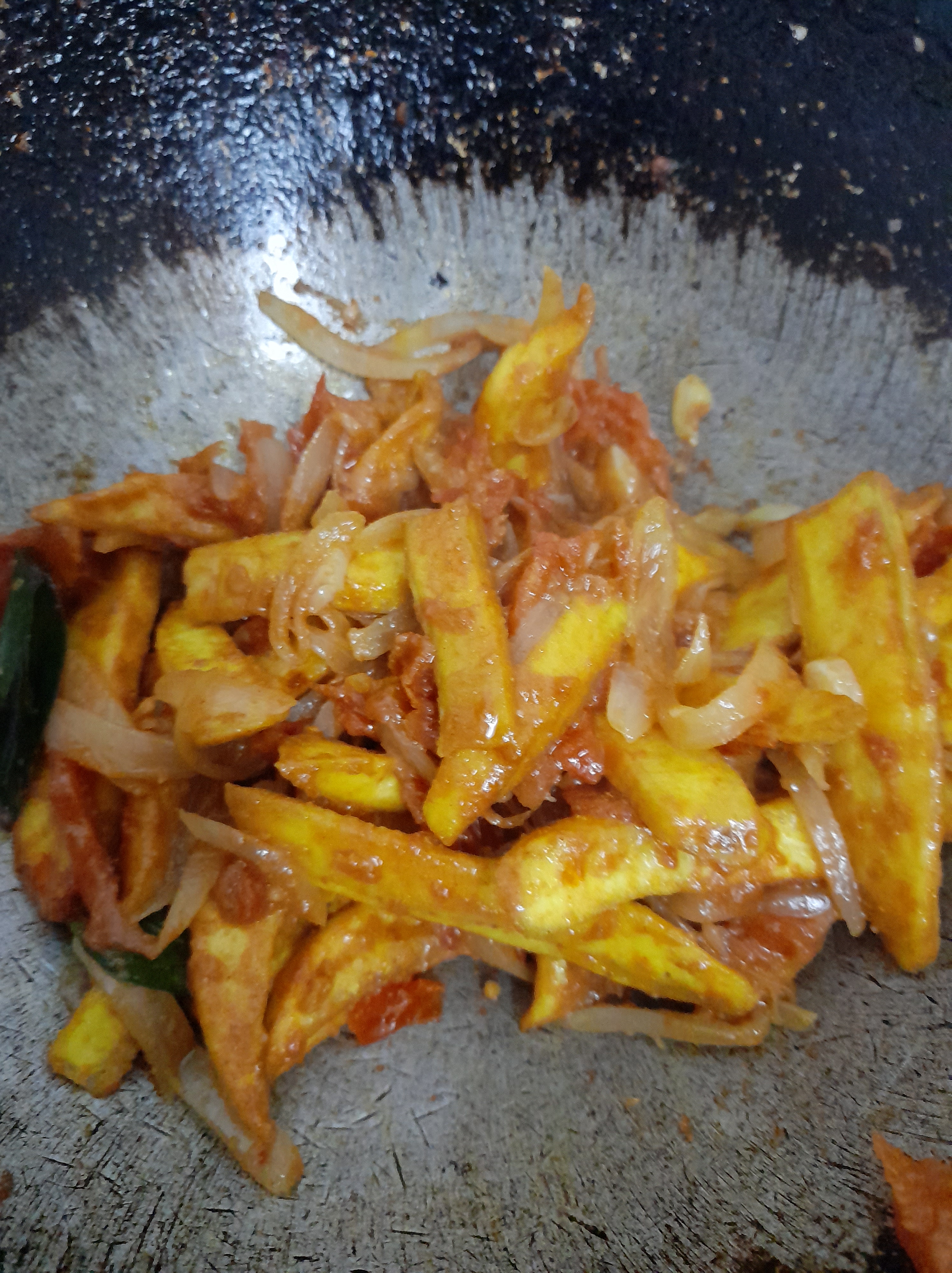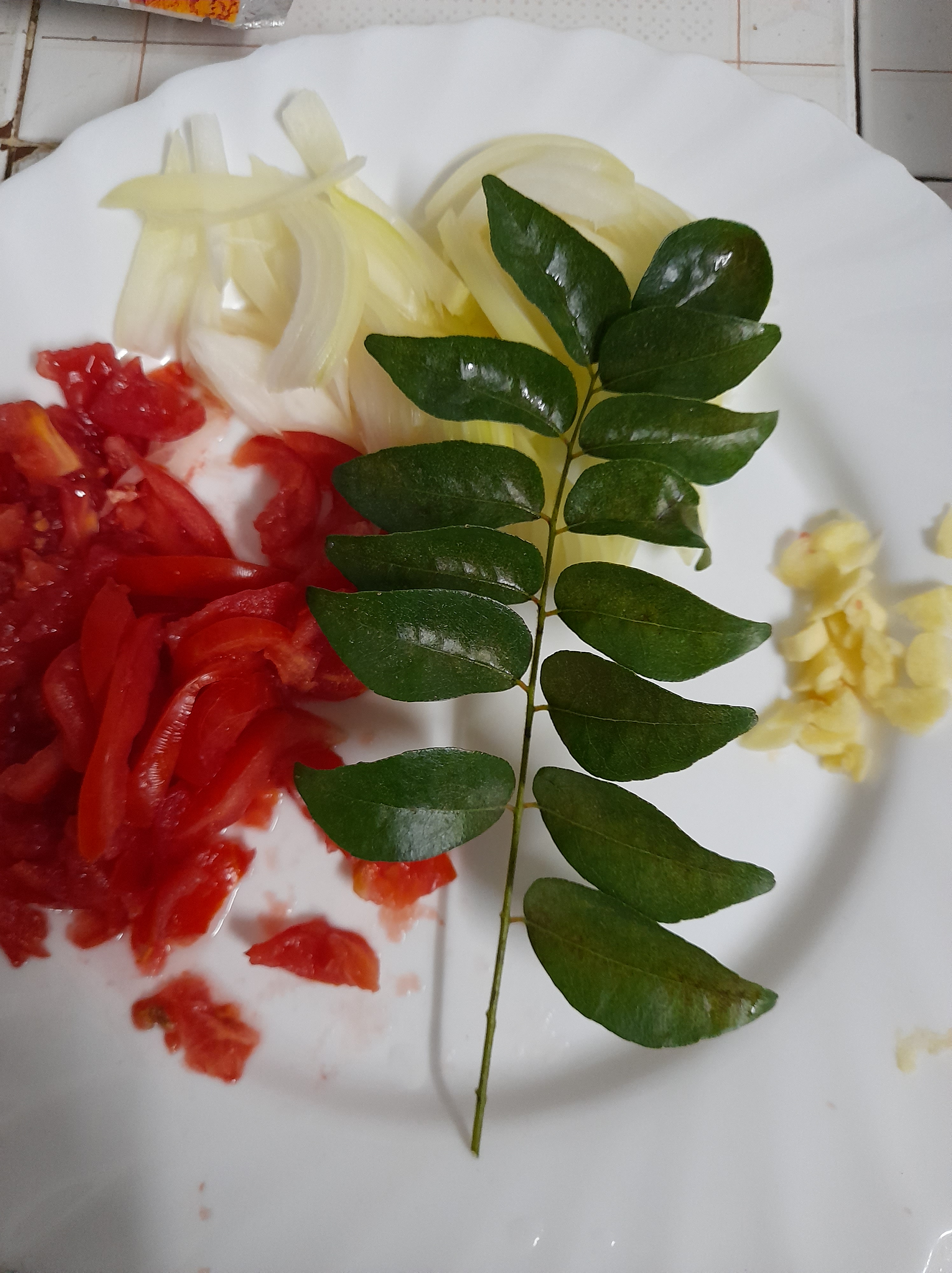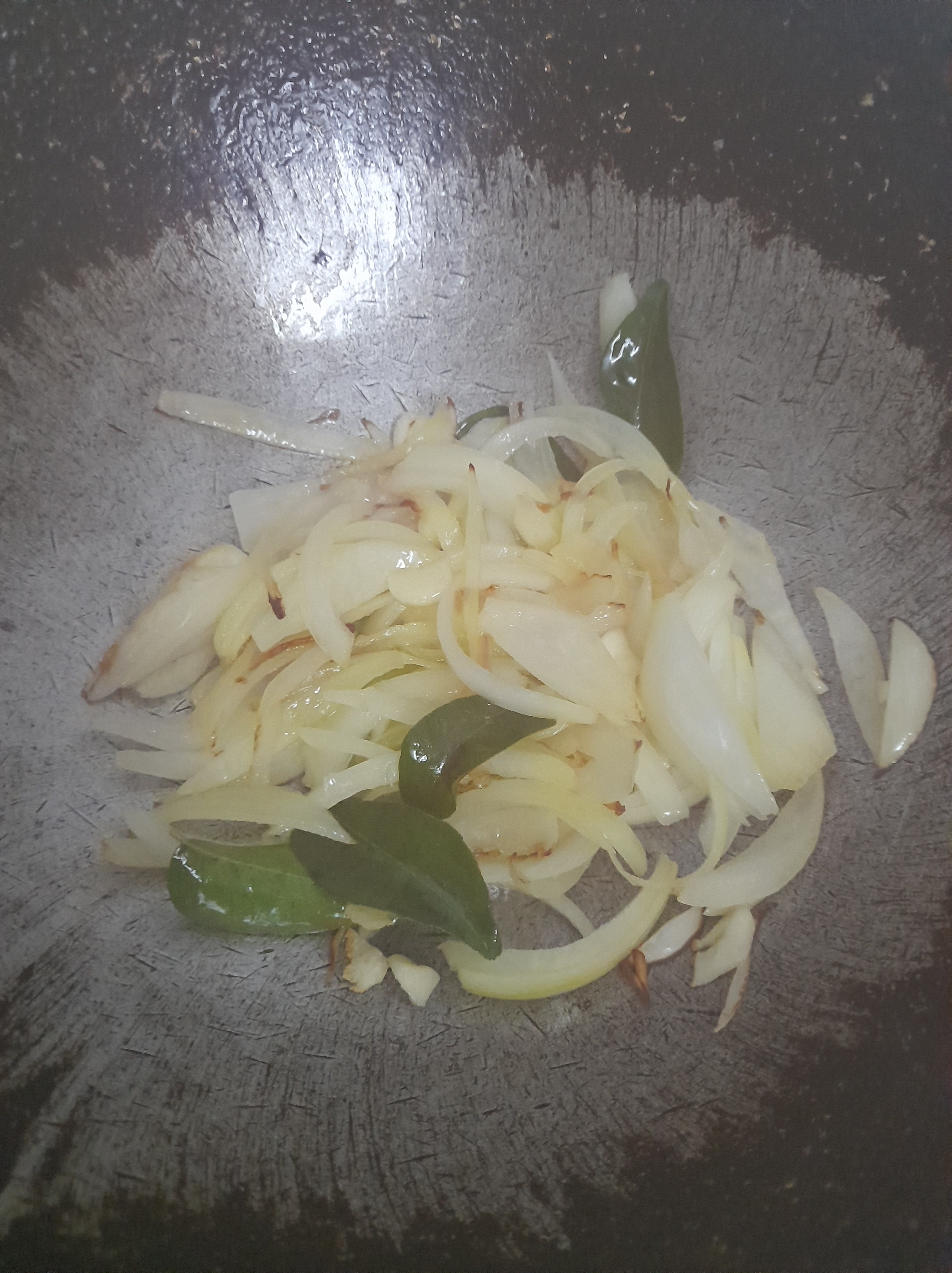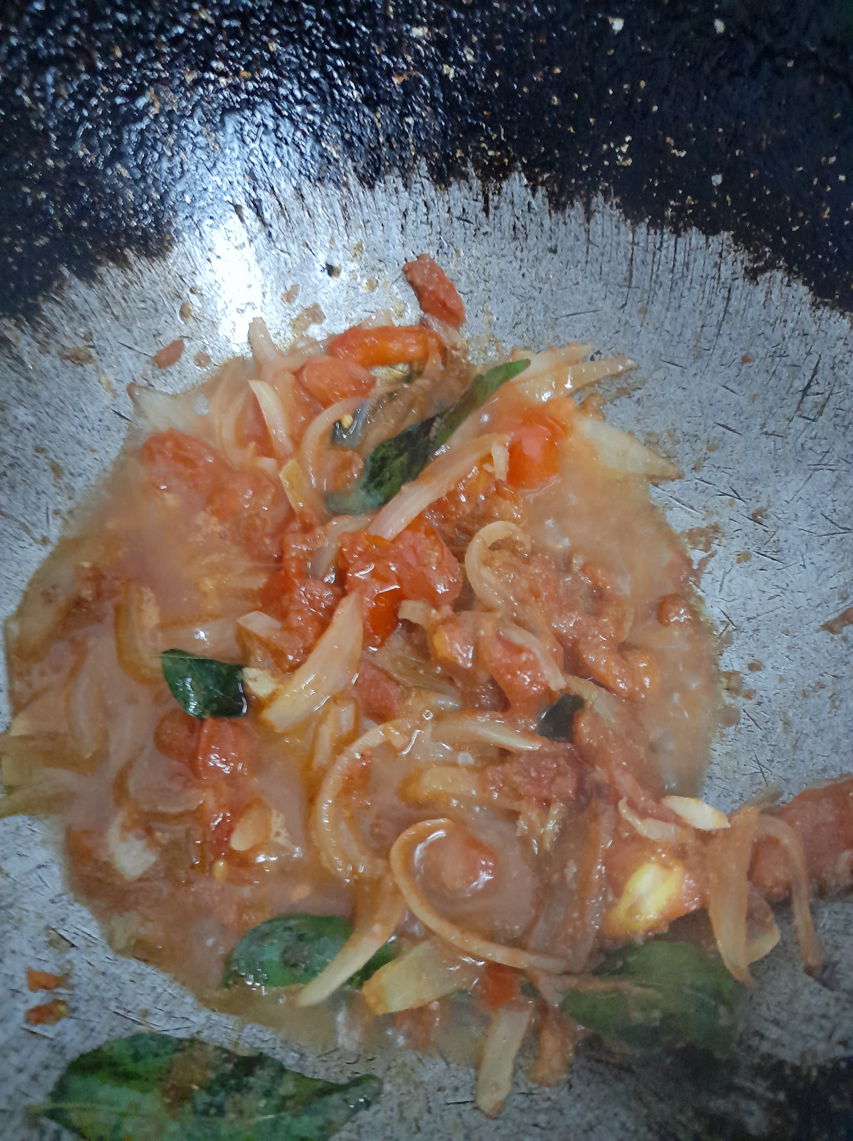 7.Fry curry leaves, onions and tomatoes in some oil over low flame till soft.