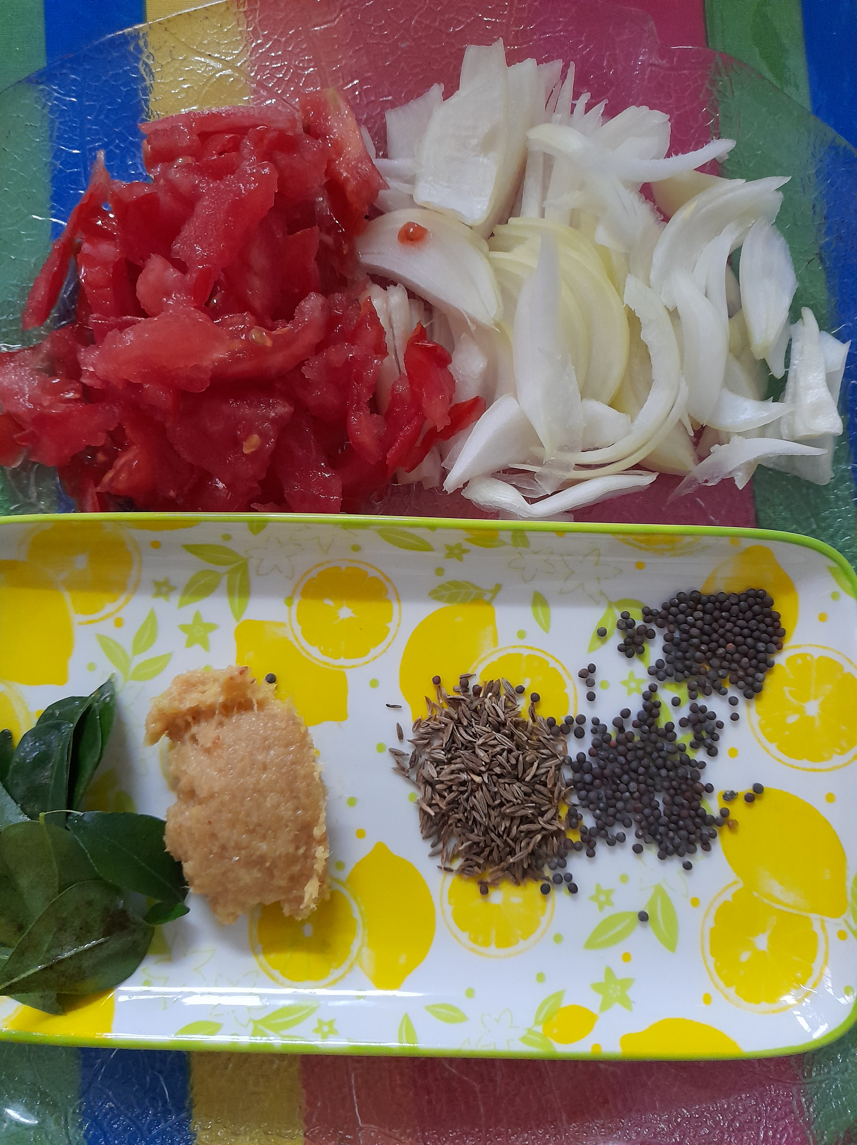 - In a large plate, prepare the following ingredients for the tadka – 1 chopped onion, 2 tomatoes chopped, 1 teaspoon of cumin seeds, 1 teaspoon of mustard seeds, 1 tbsp of ginger garlic paste, a few curry leaves washed.
