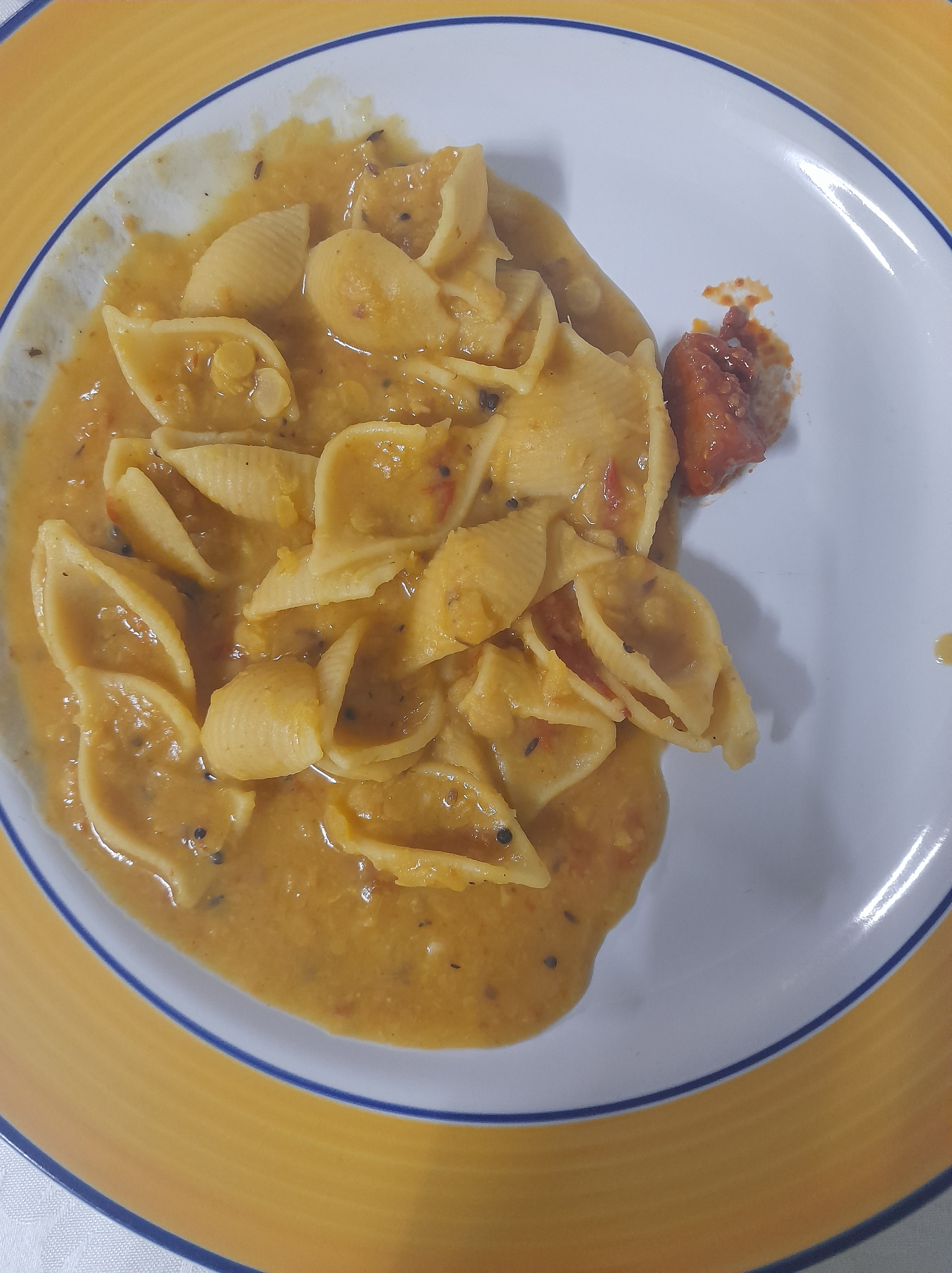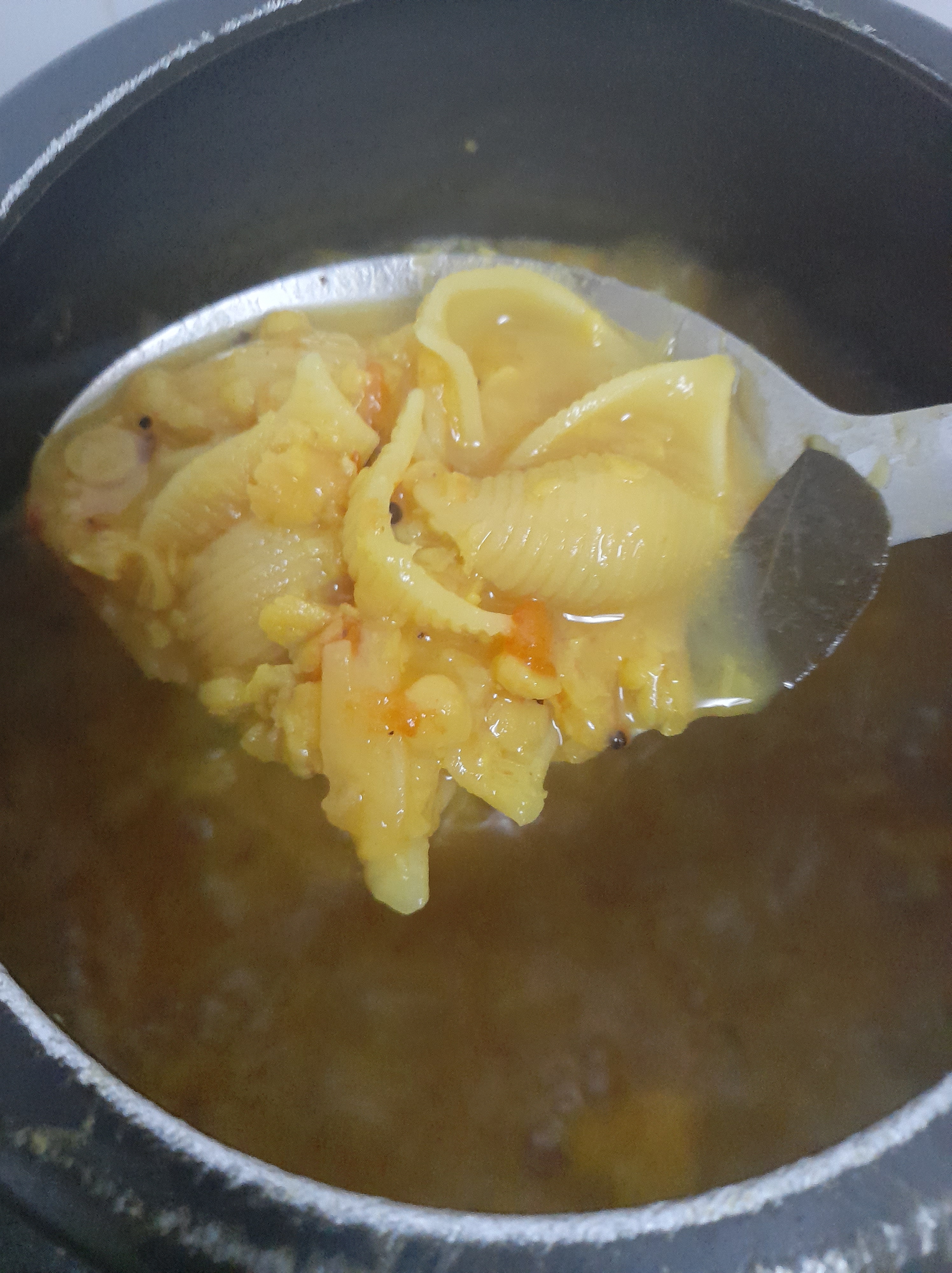 - Once the dal is cooked and is soft, add 3 cups of large shells San Remo. Add one more cup of water and a pinch of salt. Give a stir. Close the pressure cooker lid and let cook for some minutes.