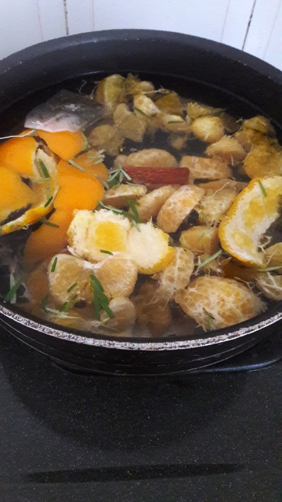 1.Put all of the above ingredients in a pan. Add water and cover till tea bag and all other fruit and spices boil.