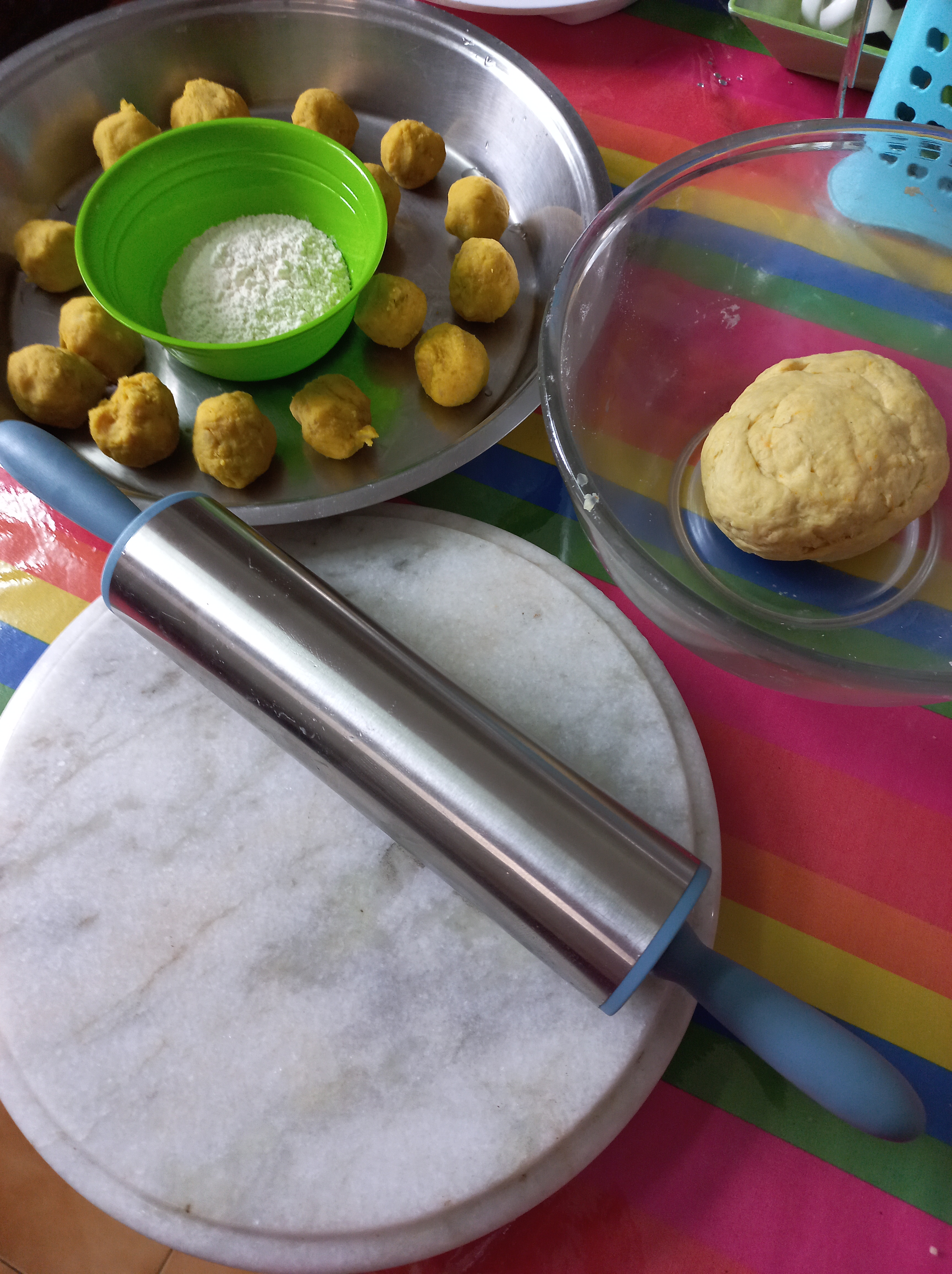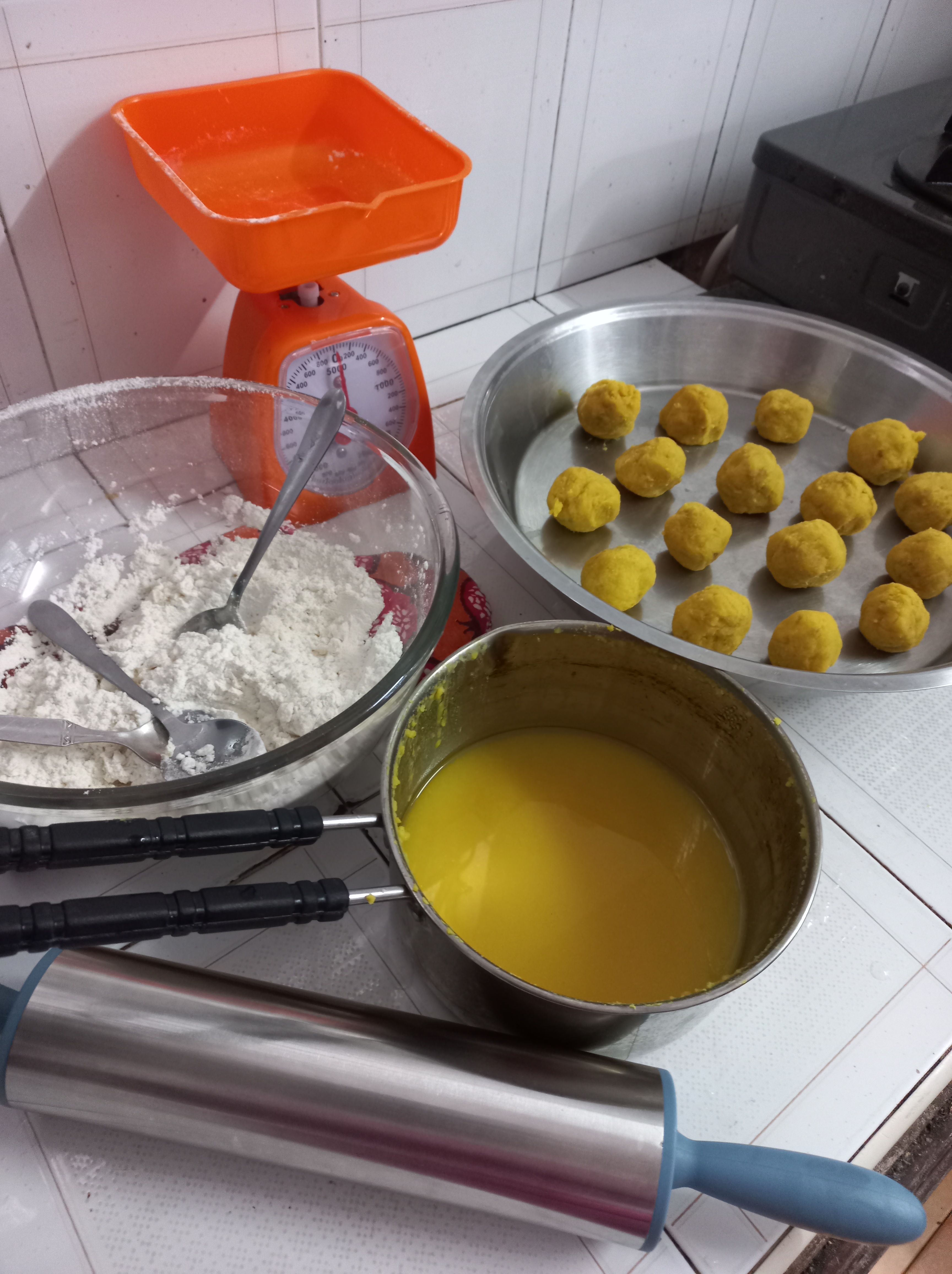 2. For the dough, sieve 250 g white flour in a bowl. Add 4 pinch of salt, add 2 tablespoon baking powder, add a pinch of yellow food colouring, add 6-8 tablespoon of oil. Mix thoroughly. Add the turmeric water from chana dhall, mix and make a dough. Then make small balls out of the dough.