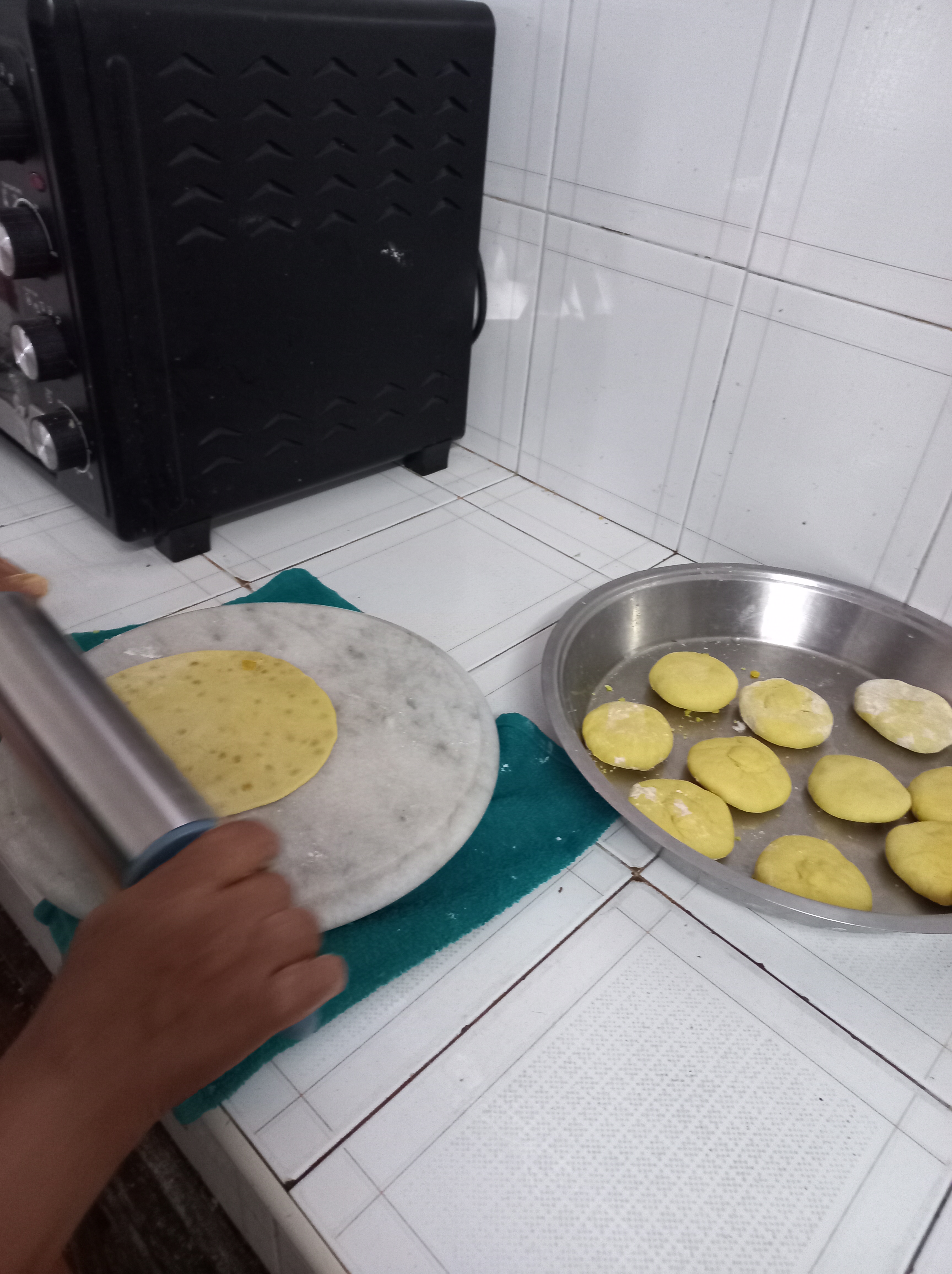 3. Insert 1 chana dhall ball inside of the dough ball and close it. Then with a rolling pin flatten the dough and use some flour if the dough is sticking on the rolling pin and board.