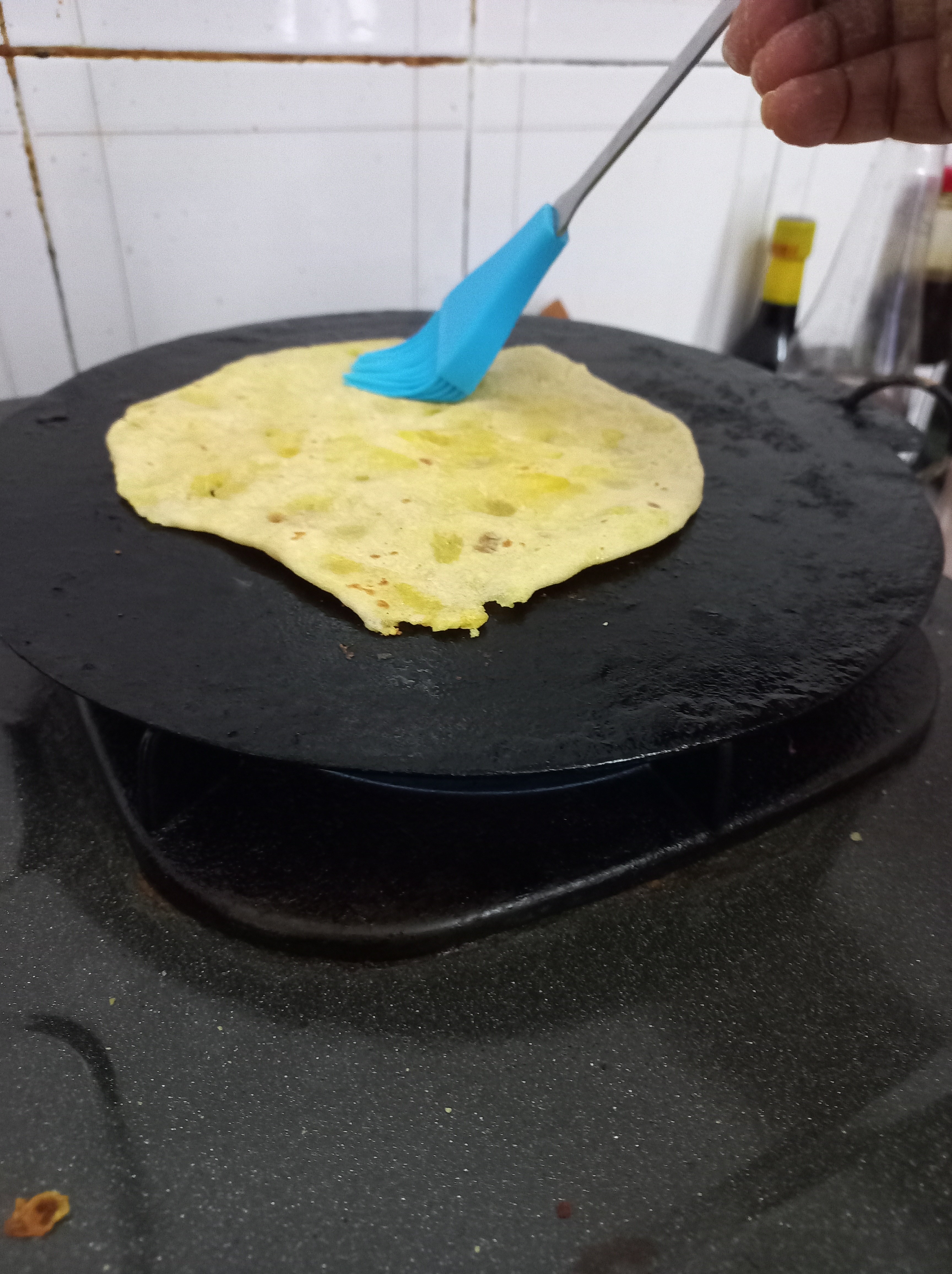 4. Heat oil on an indian pan/griddle/tawa. Place the flattened dhall puri. With a brush, add oil on the surface of the dhall puri. Cook on both sides. Dhall puri should puff while cooking and becomes a yellow golden texture.
