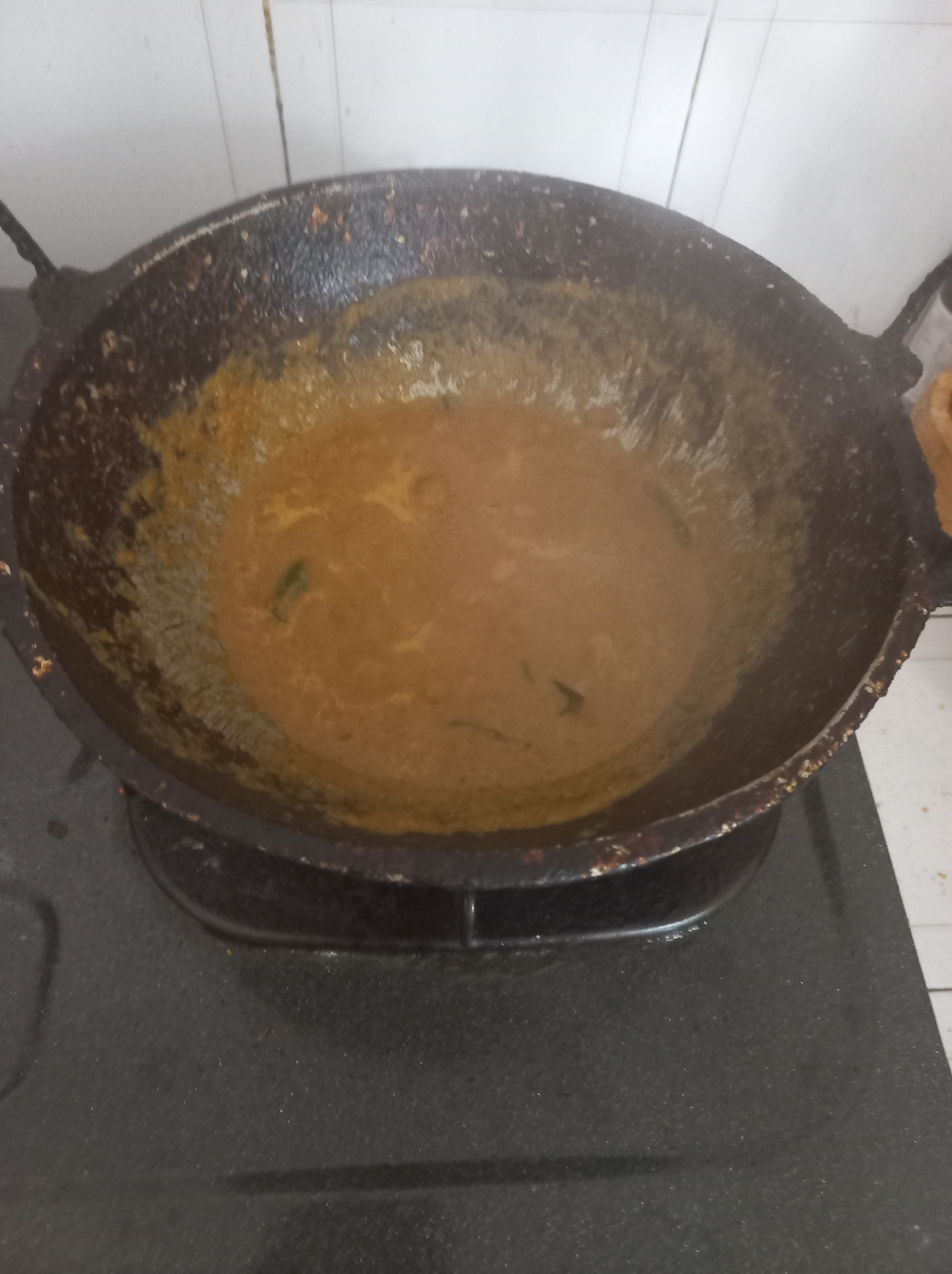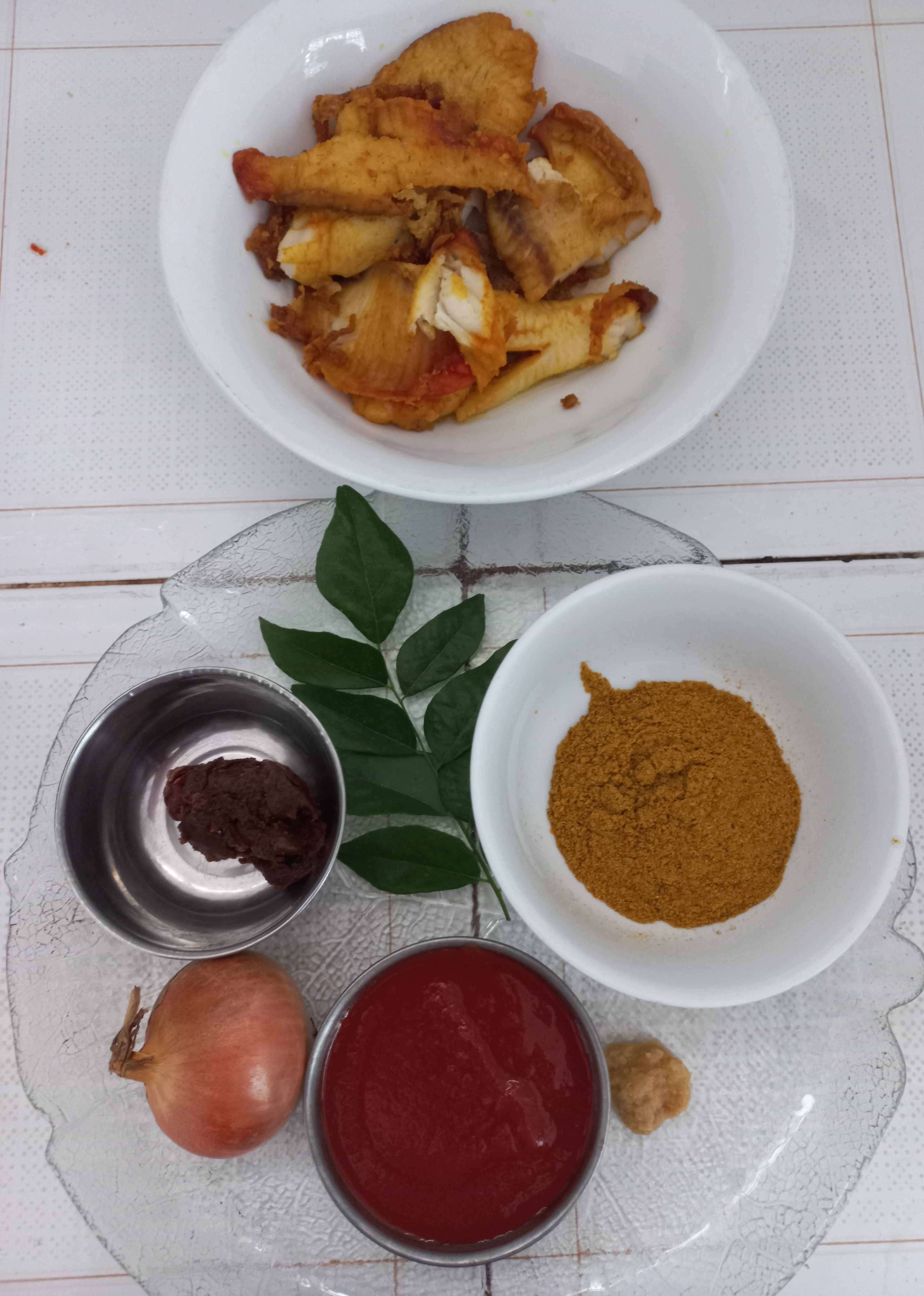 4. Prepare the following for the masala : 3/4 bowl of powdered fish masala that is dissolved to liquid form by adding some (1 bowl) water, 1/2 bowl of tomato puree, 2 bowls of water for cooking, 1/4 bowl of tamarind paste dissolve in water, 1 peeled and cut onion, 8-9 curry leaves, 2-3 tablespoon of garlic/ginger paste.