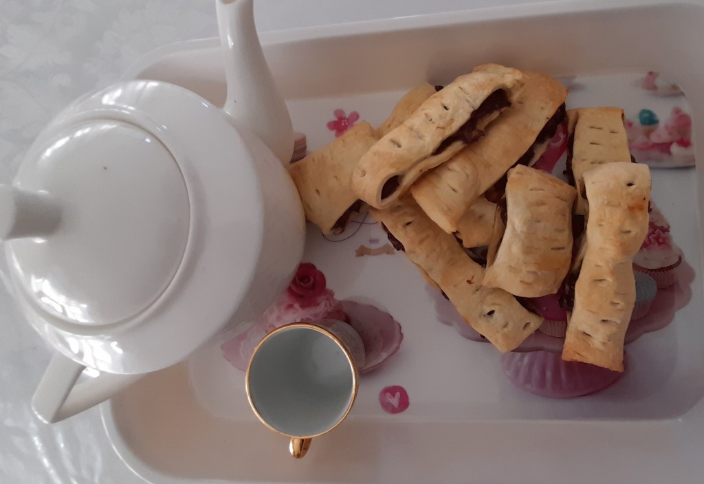 4. With a rolling pin, flatten the puff pastry and make a square out of it. With a knife, cut 4cm width to make long thin rectangles. For each long rectangle, inside banana mixture in one corner and close the pastry from the other corner. On top of banana pastry use a knife to make small holes for better cooking. Repeat same with all long rectangles.