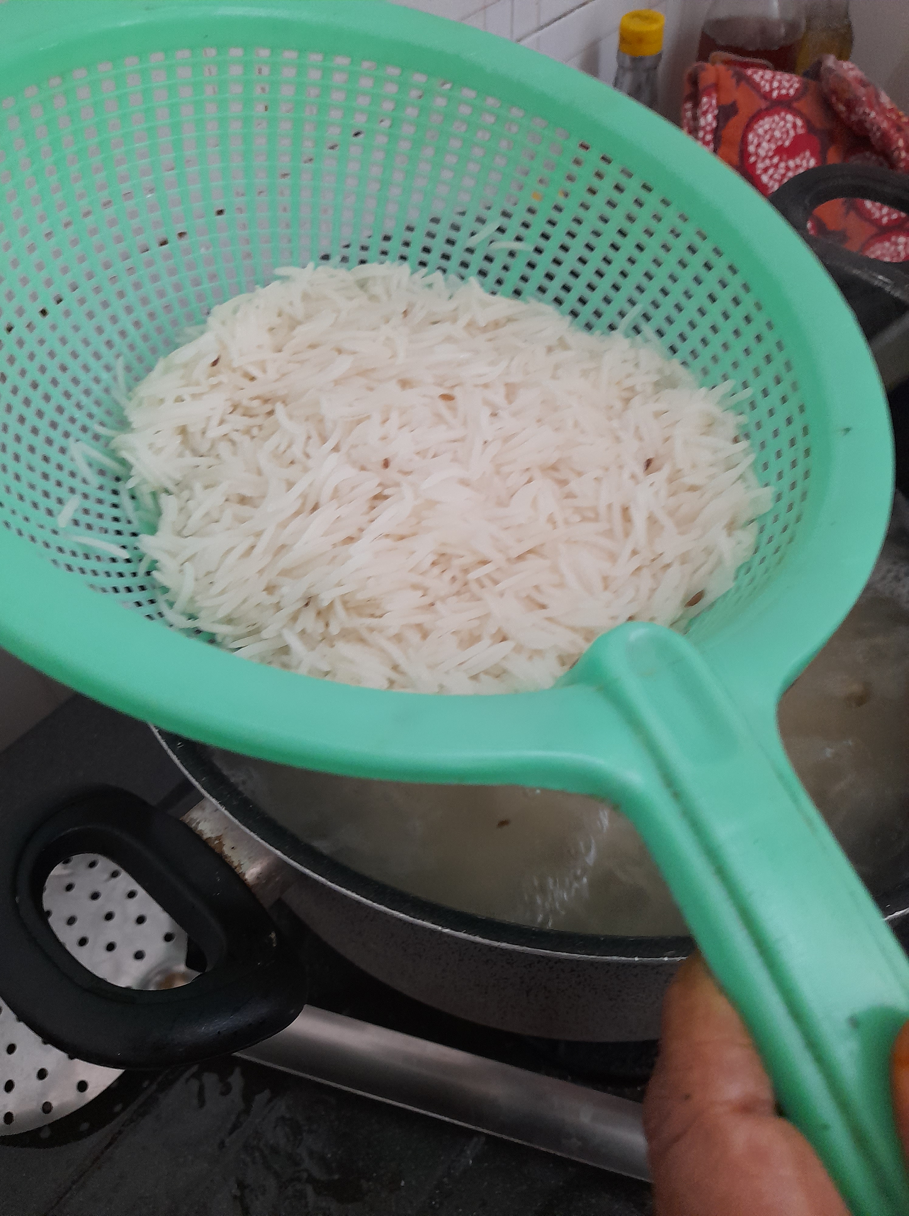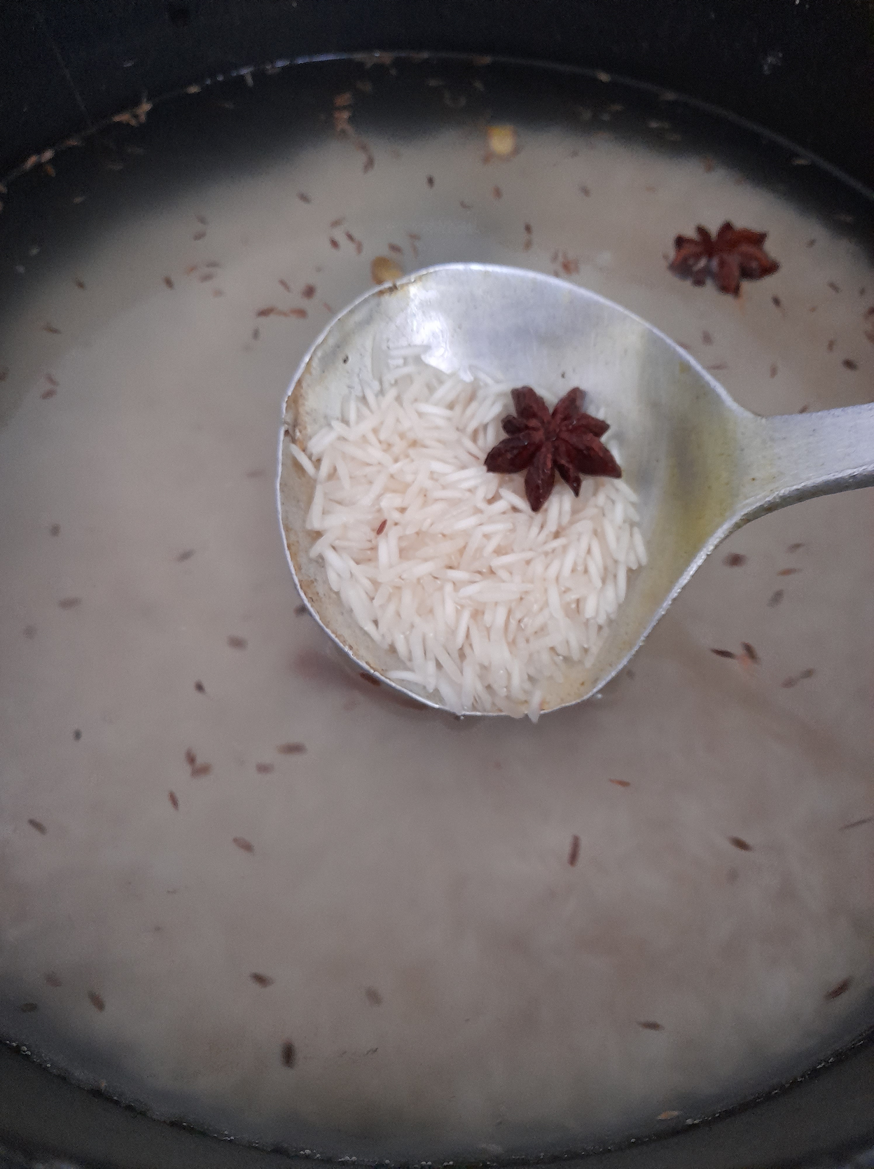 - Fill a pan with water. Add the clean 3 cups of rice. Add 1 anise seed, few cumin seeds, 2-3 pieces of crushed cardamon, 1 cinnamon stick. Add little salt. Half boil the rice. Say some 10-15 minutes. It should be half cooked. Then strain the water. Keep the half cooked rice, anise seed, cumin seed and cinnamon stick in a bowl and reserve.