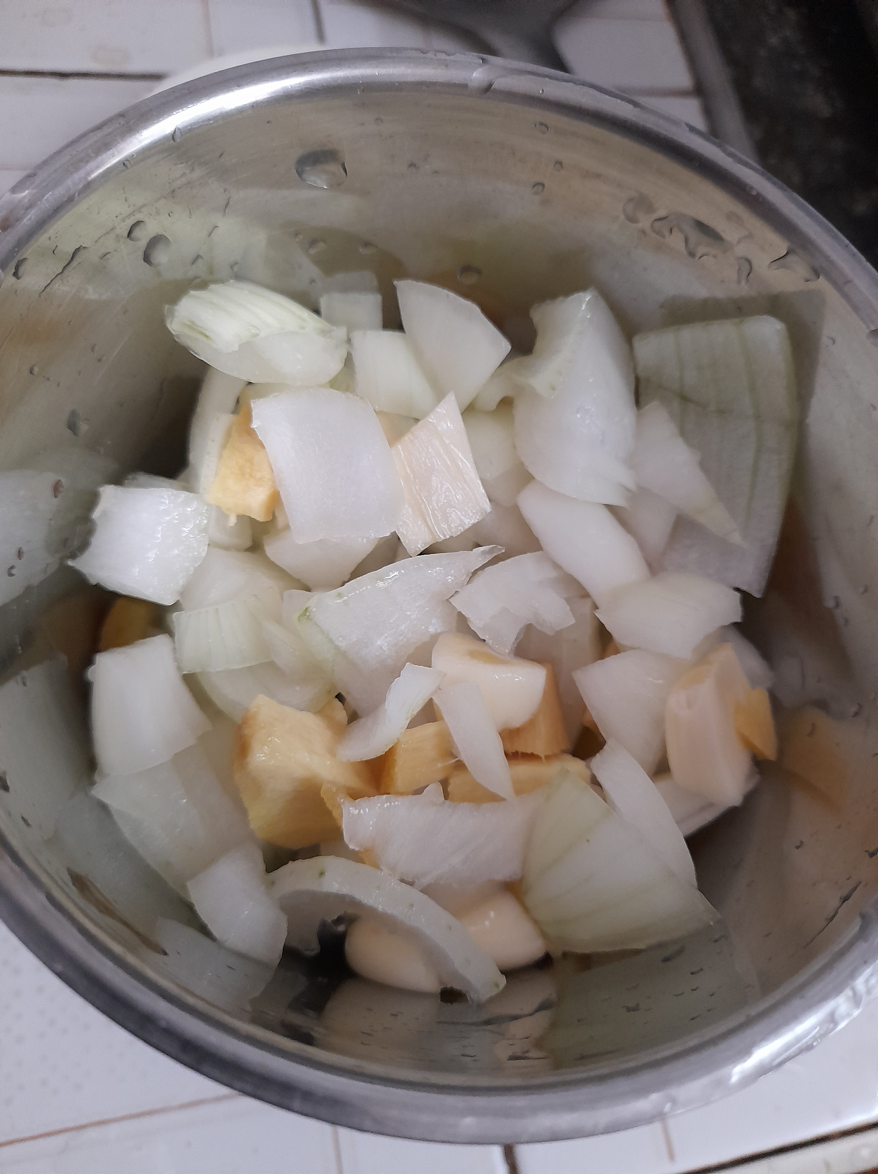 - Cut some ginger, garlic and onions. Add them in a grinder. Put some water and grind till a fresh ginger/garlic paste is ready.