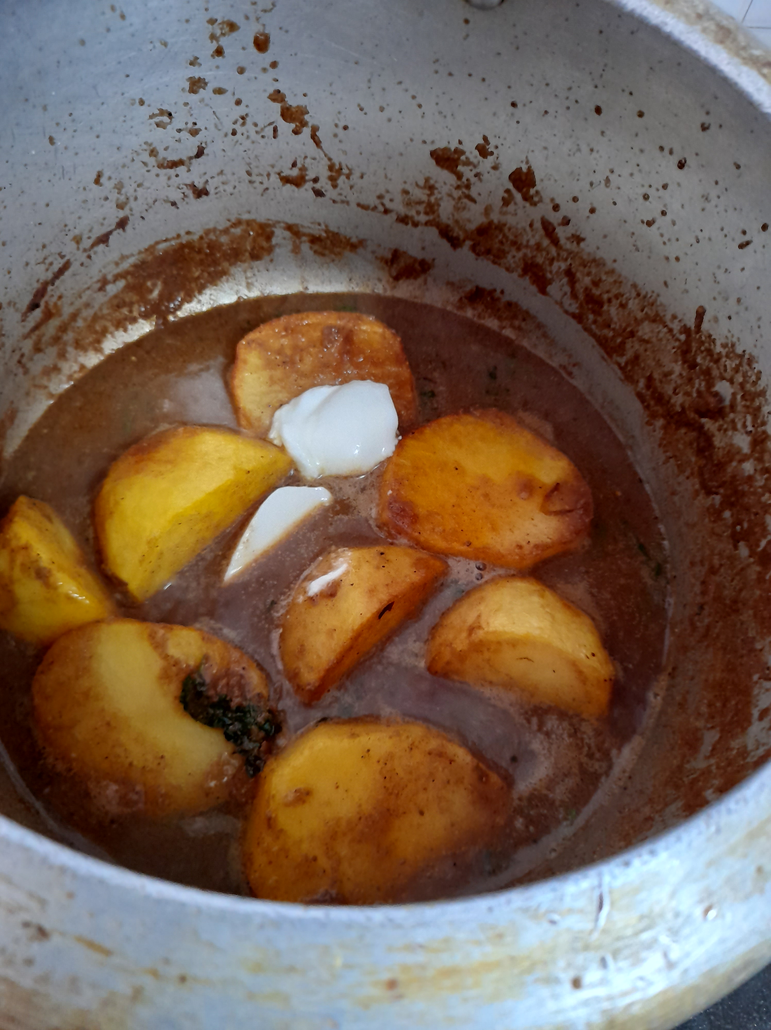 - Add a mug of water in the pressure cooker till it reaches same level of potatoes.