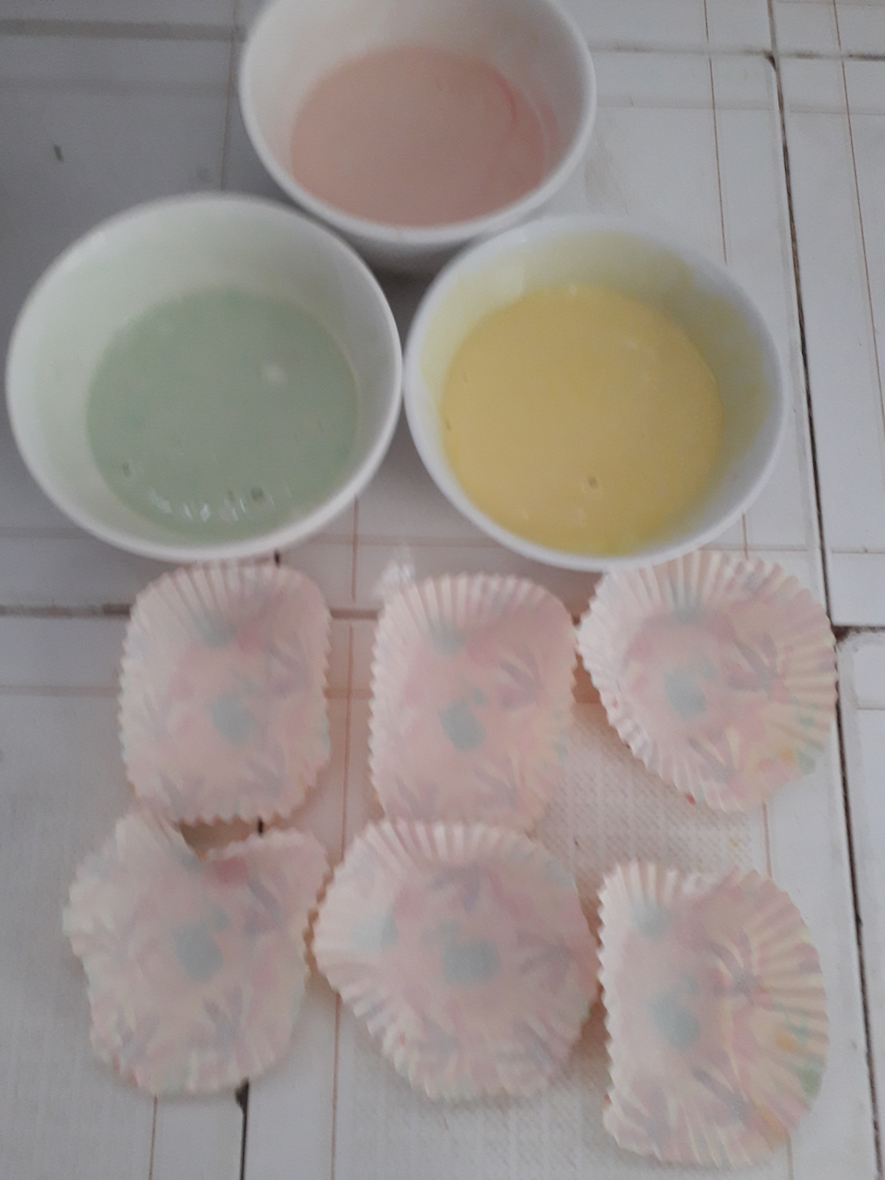 - Add yellow food colouring to the batter in first bowl, add green food colouring to the batter in second bowl, add third food colouring to the batter in third bowl. Stir.