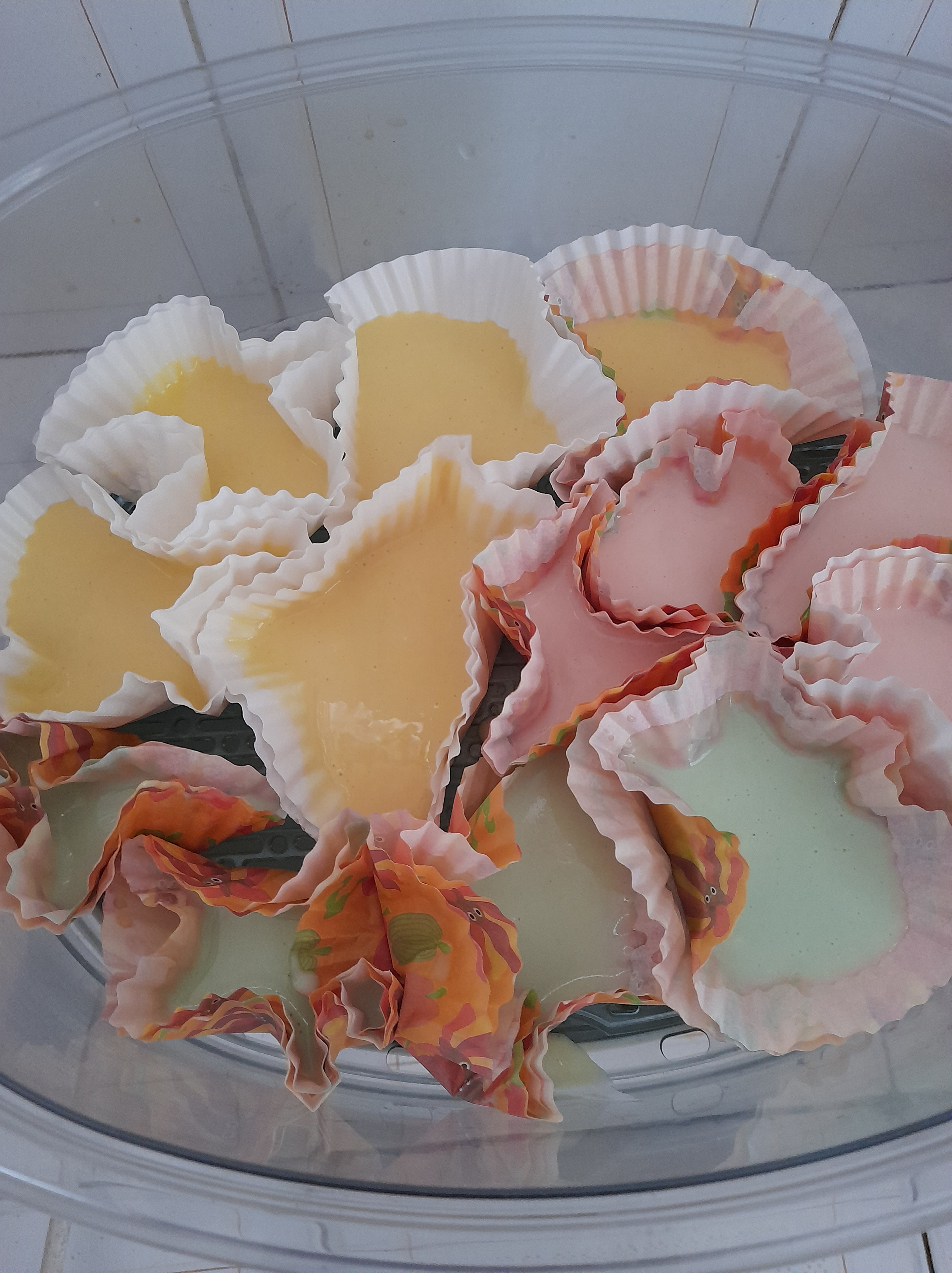 - In small aluminium foil cup moulds, pour the batter to fill half the mould. Repeat till all batter is filled in cup moulds.