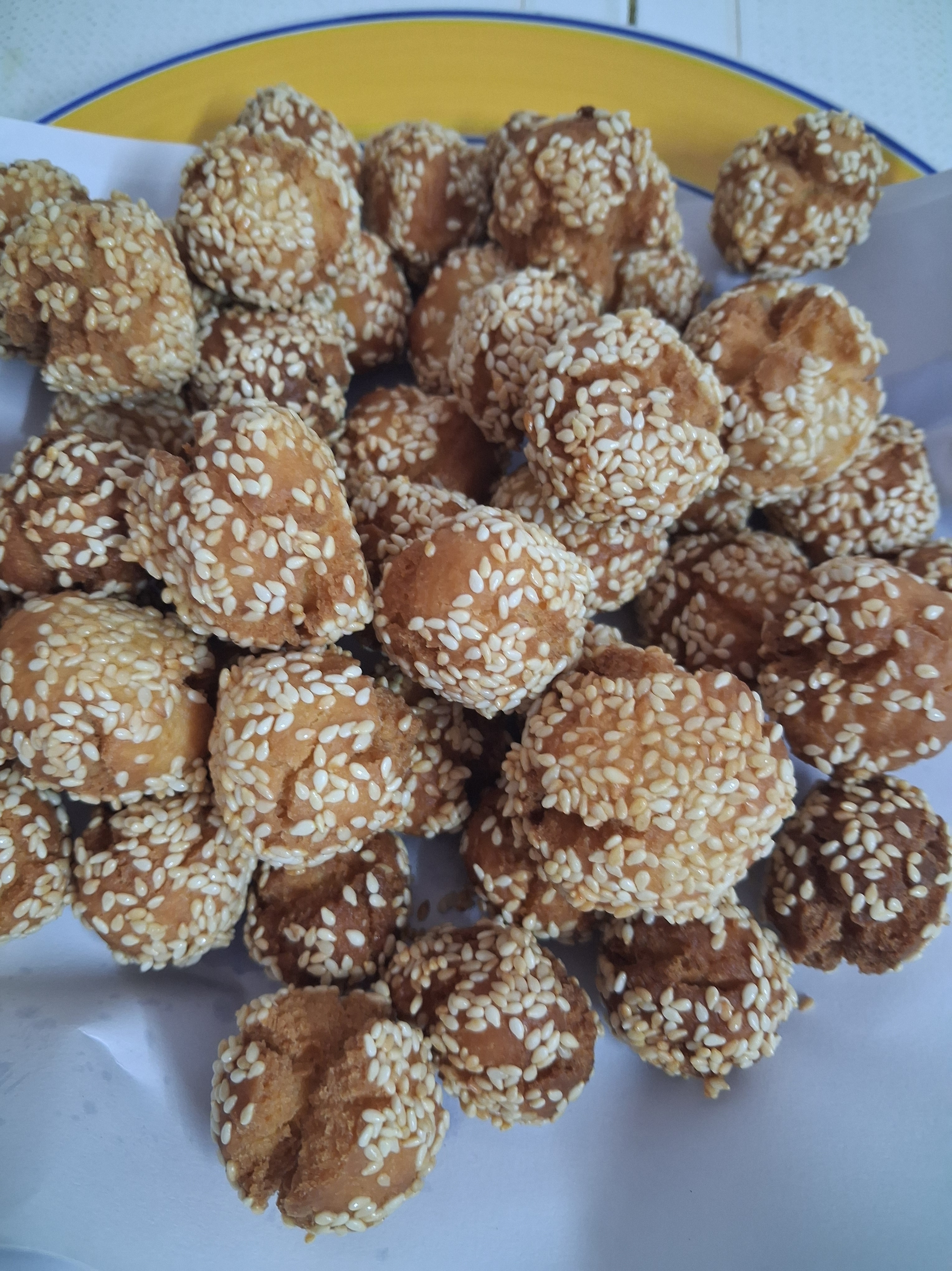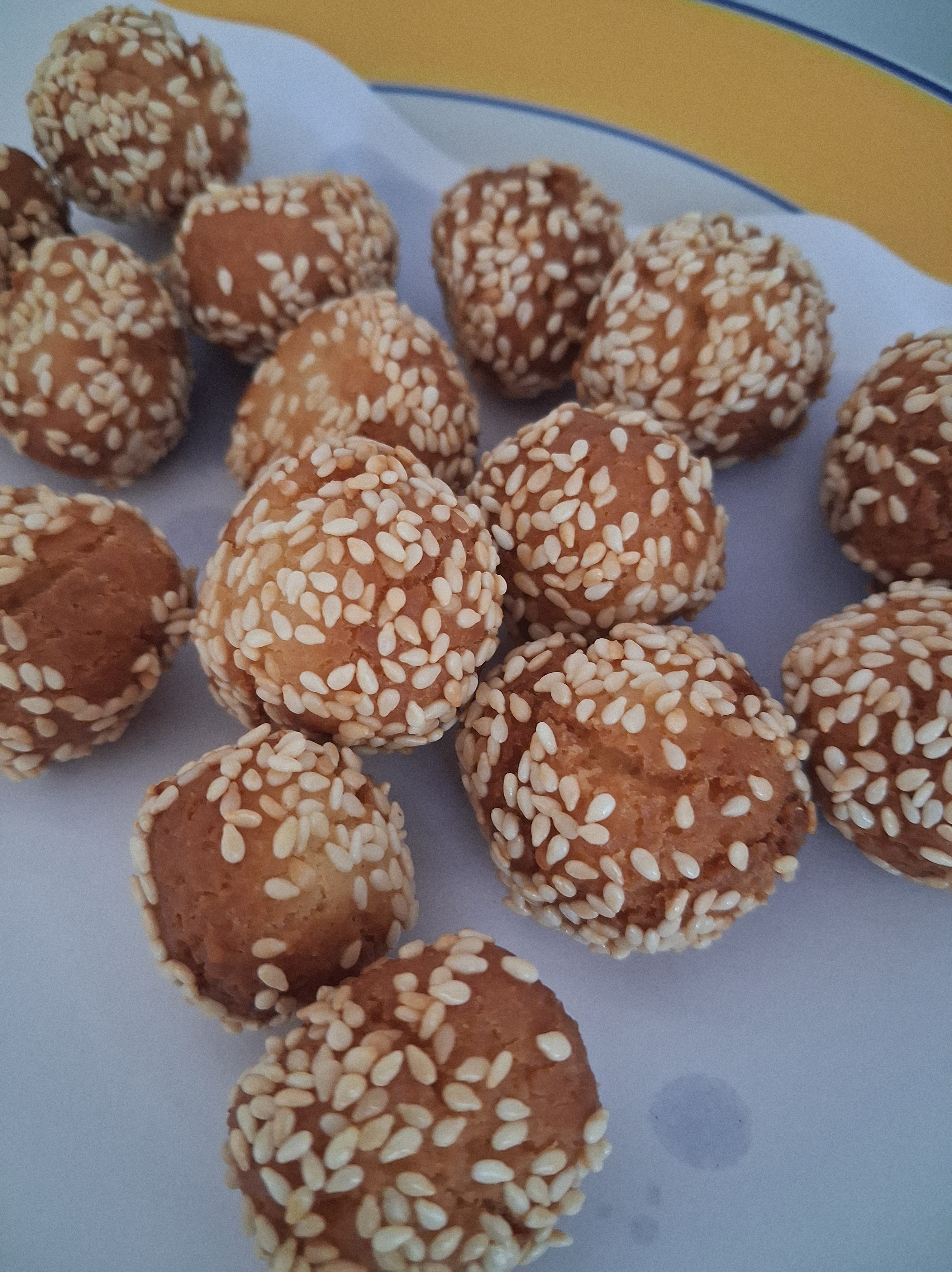 - Take each ball, place in water and remove quickly, then roll the same ball over sesame seeds. Repeat for all balls.