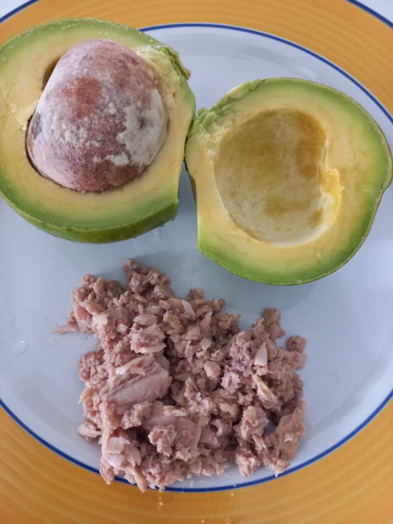 3.Mix in salad style the tuna and avocado. Optional to add tomato slices, onions, salt, pepper, cooked capsicum, nuts and raisins.