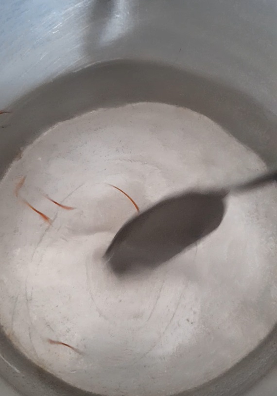 - To prepare the syrup, put 200 ml water in a pan, add 175 g sugar, few cardamon seeds, and jaffran threads. Allow the syrup to boil.