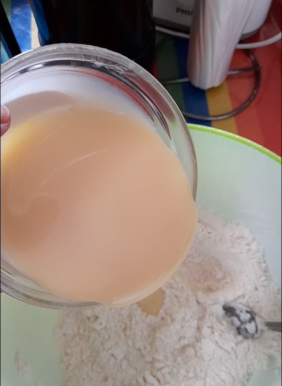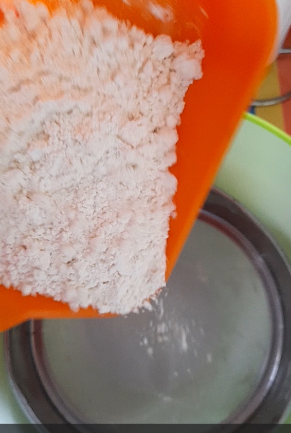 - Add 50g of self raising flour in the same bowl. Mix.