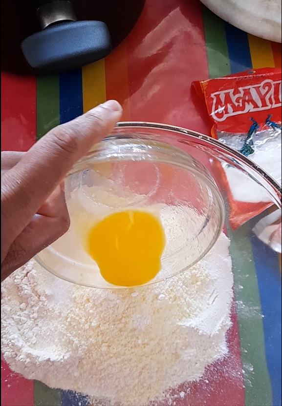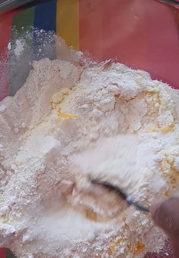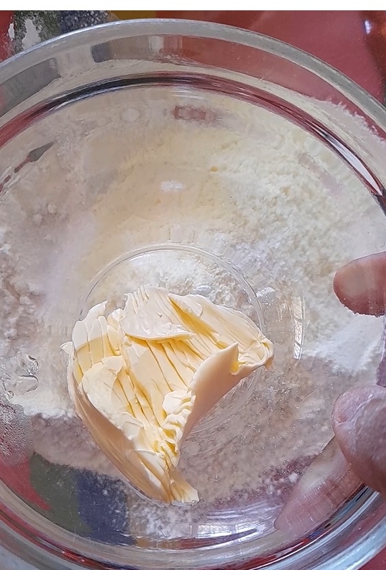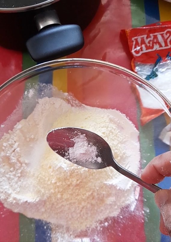 - Mix semolina, self-raising flour, sugar, milk powder, baking powder together.