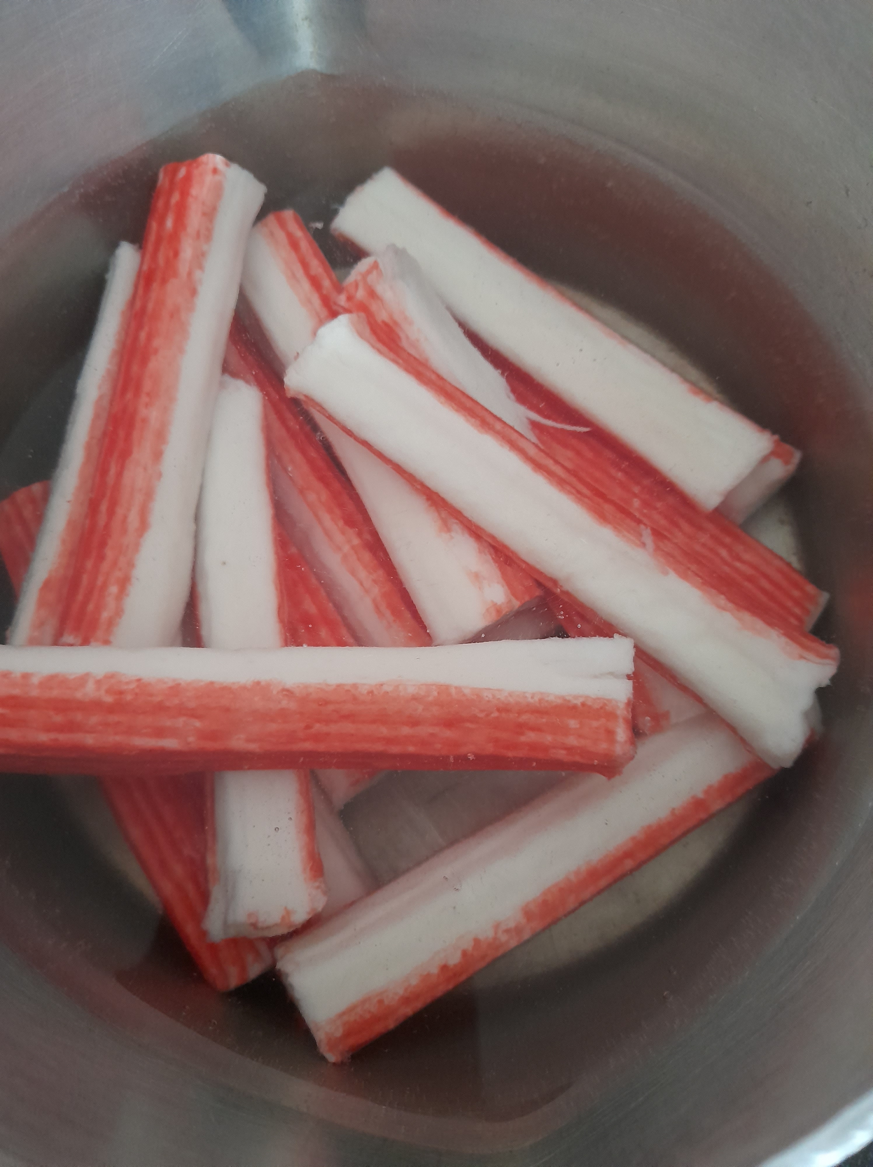 - Wash the crab sticks and put to boil in a pan of water. After boiling has reached and the crab sticks are soft, drain the water and cut thinly the crab sticks.