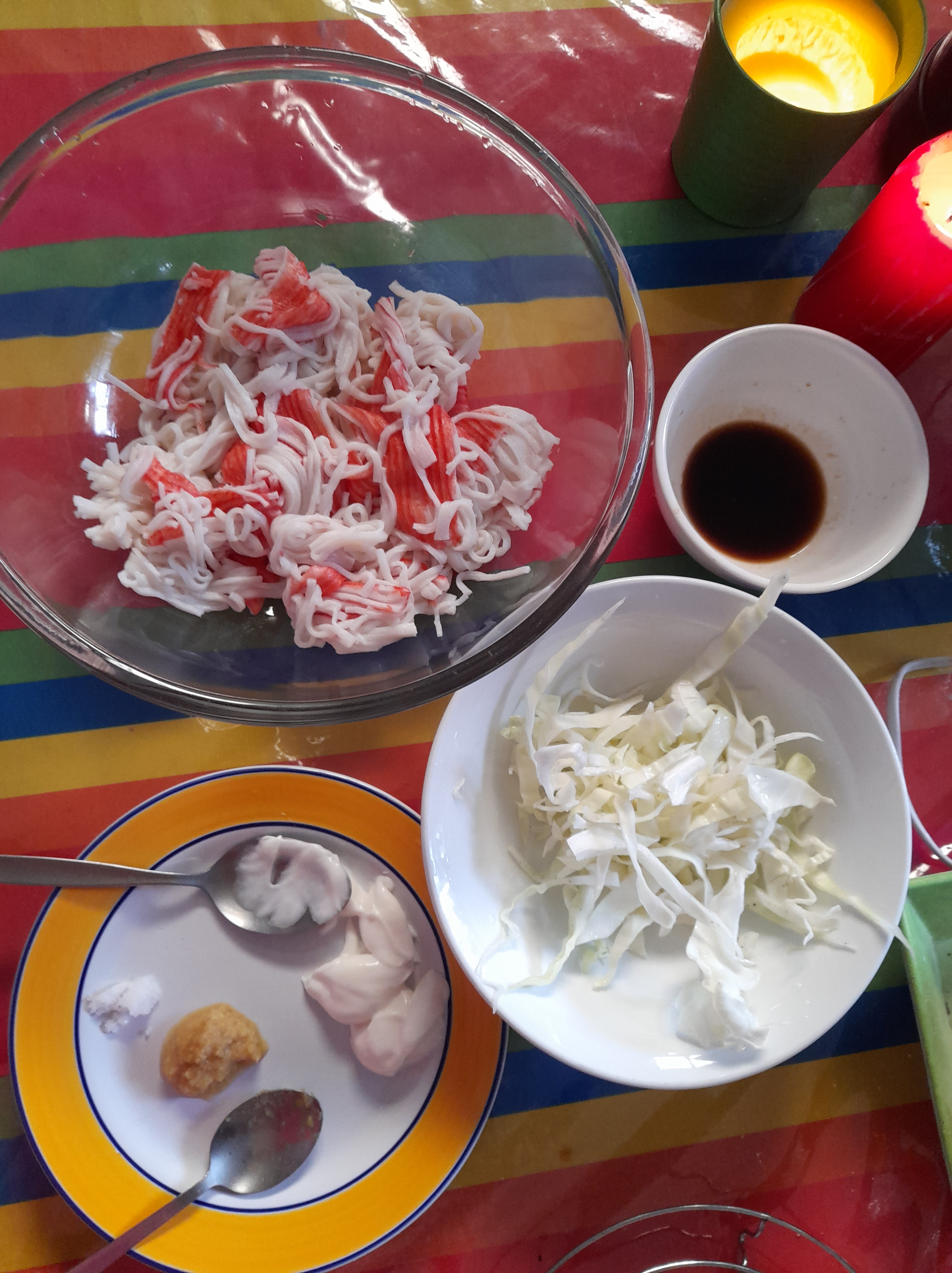 - In a large bowl, put the crab sticks, add the shredded cabbage. Mix everything without breaking the crab sticks. Then add 3 tablespoon of mayonnaise, 1 tablespoon of ginger, 2 tbsp ponzu sauce, some spring onions. Mix everything and stir. Add some salt to taste