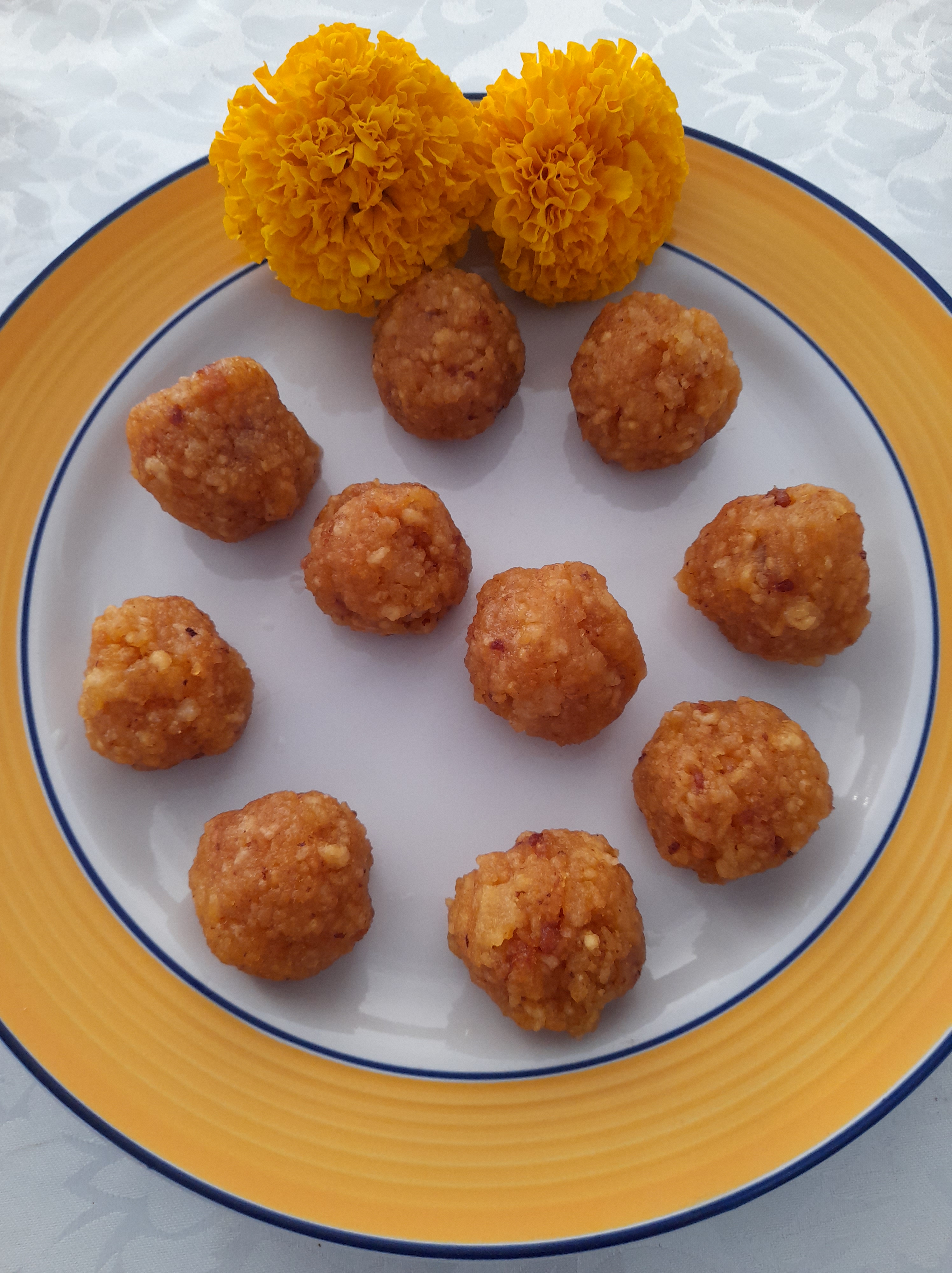 - Allow to cool and then make rounded shape laddoo’s with the hands.