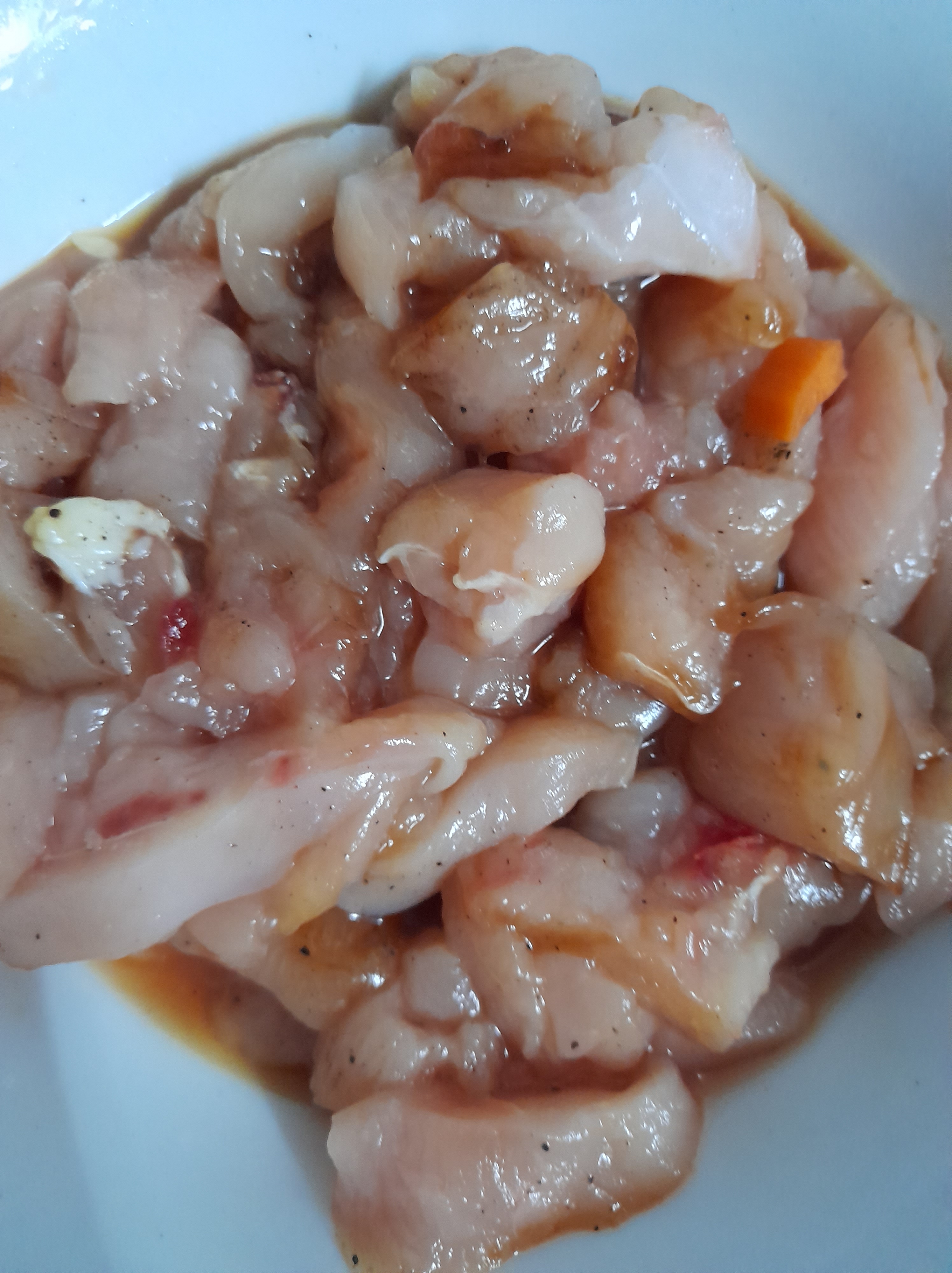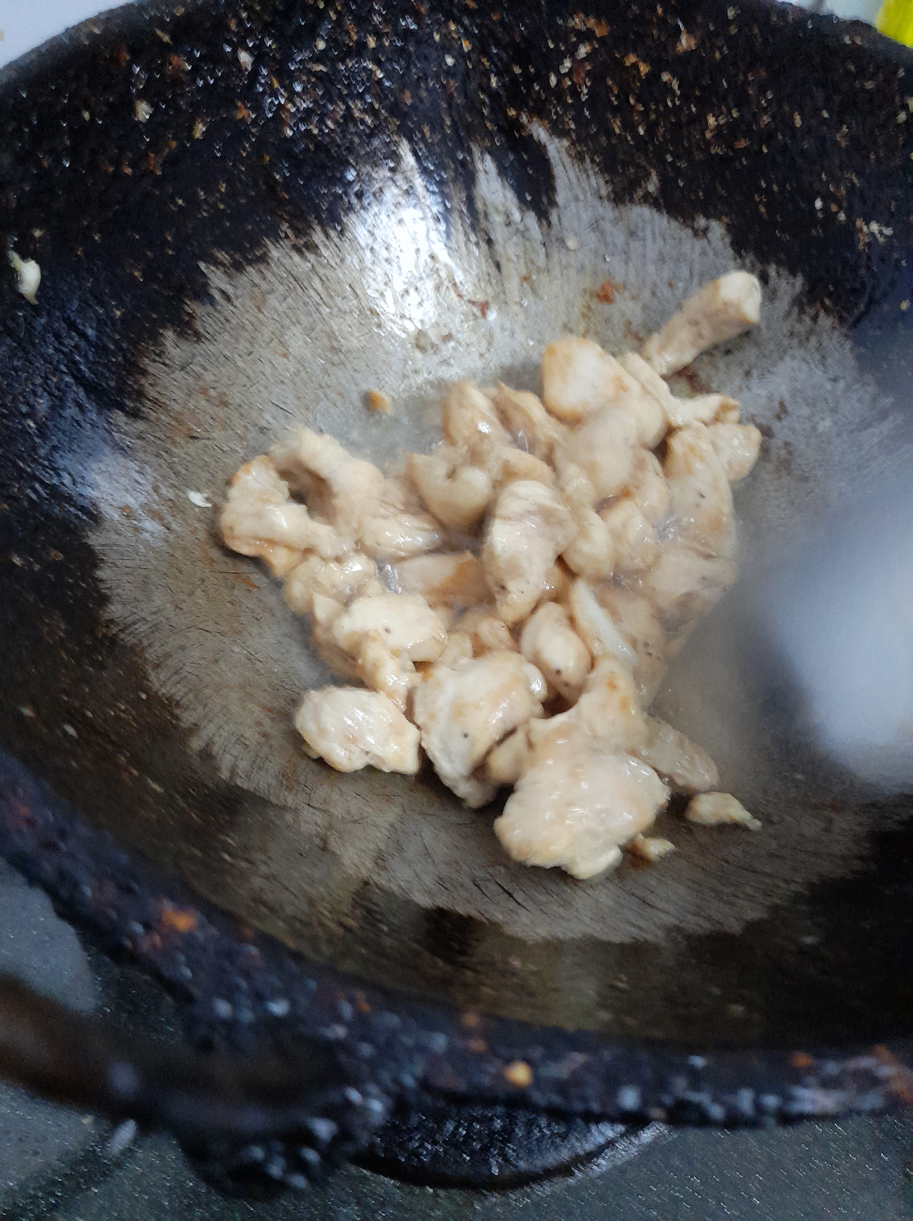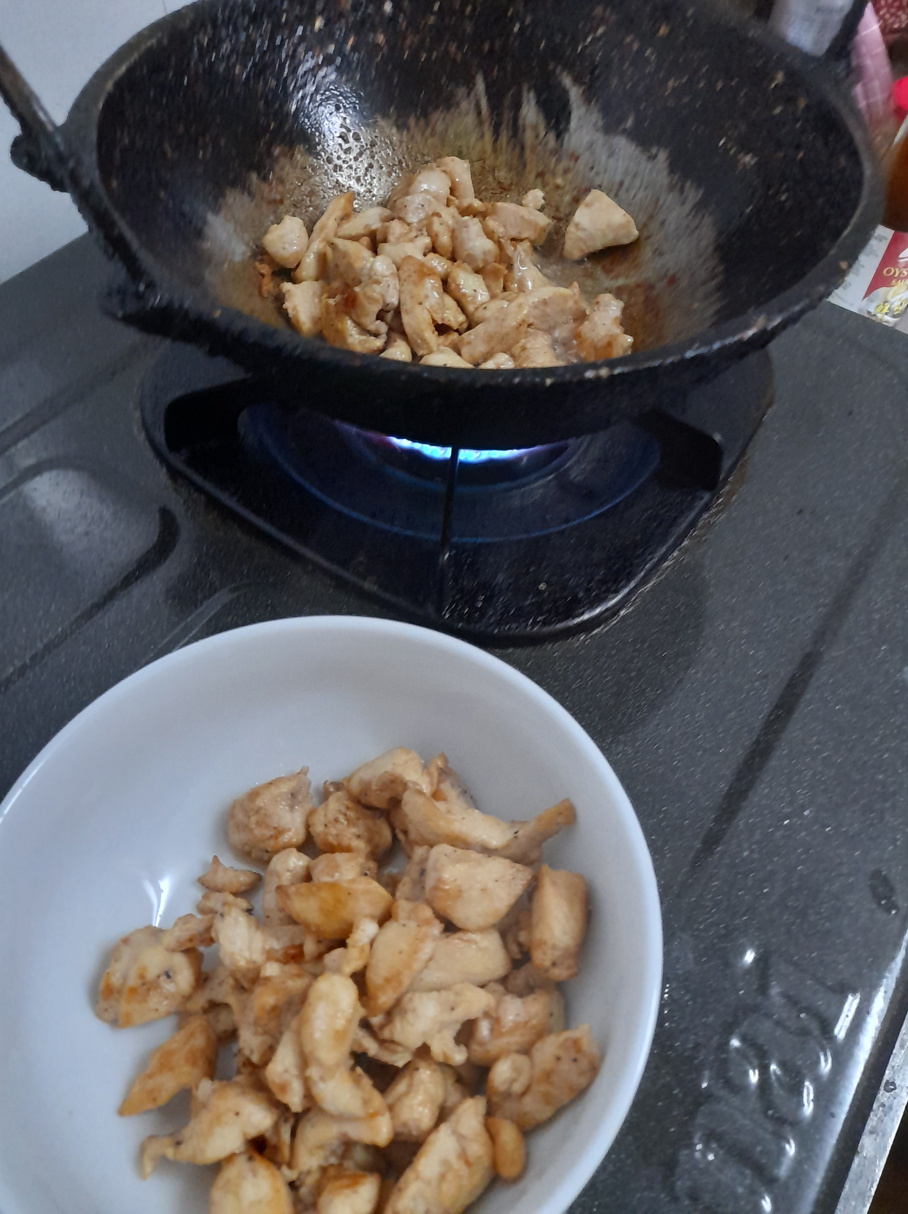 - Cut chicken breast into smaller pieces. Wash thoroughly and marinate with ginger garlic paste, salt and pepper. Then fry the chicken.
