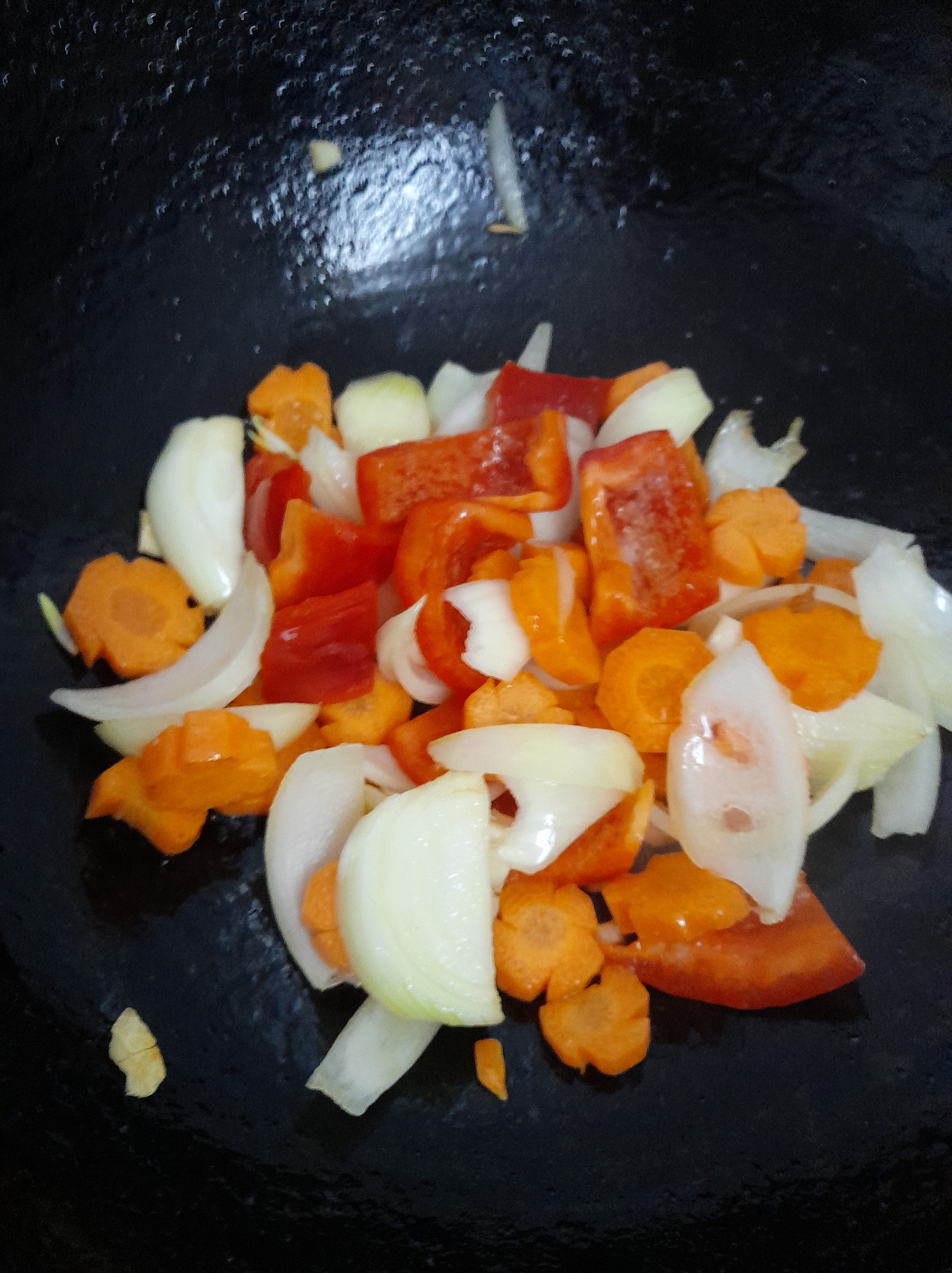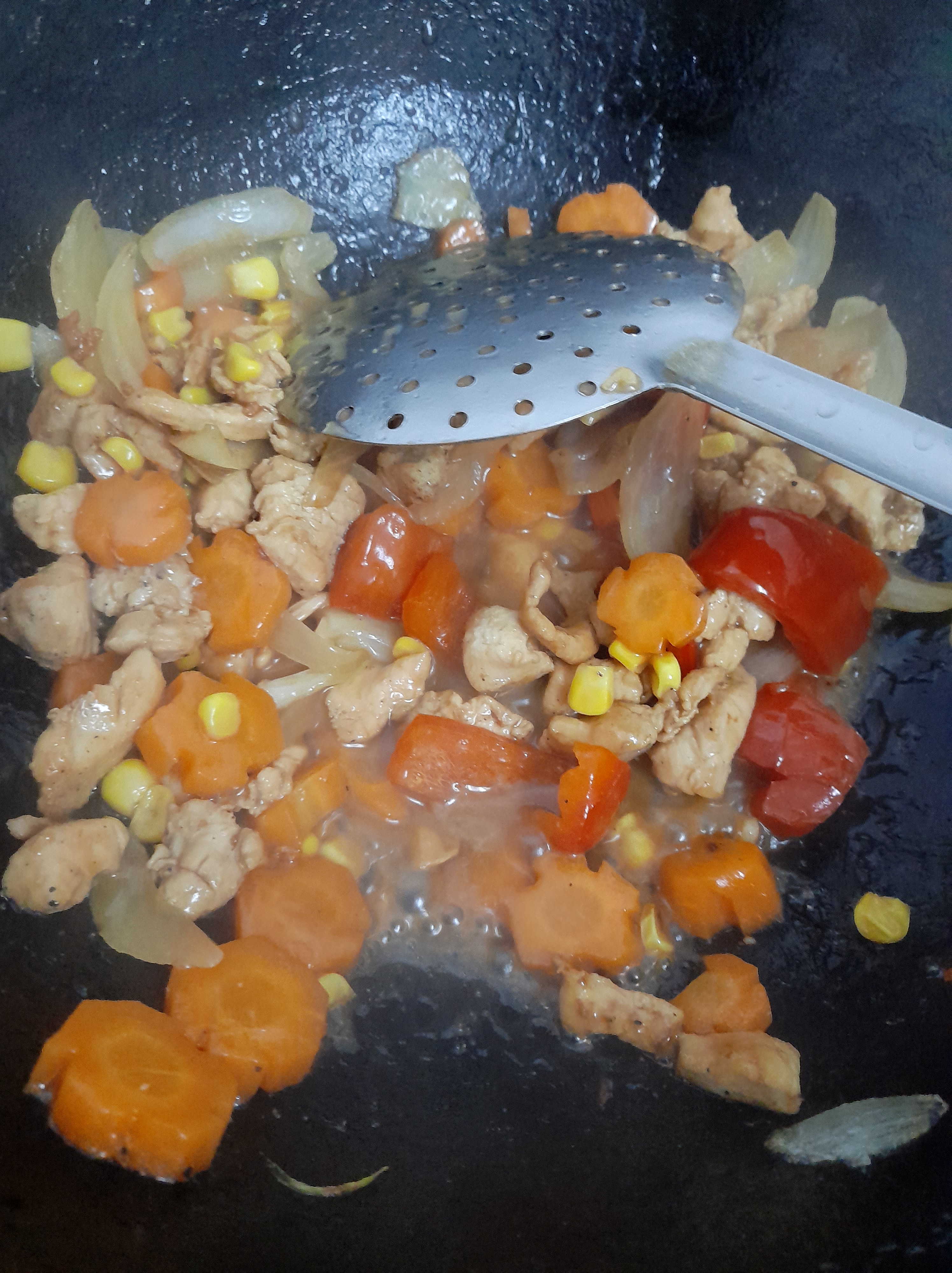 - Sautee cut vegetables – onions, carrots and corns along with the chicken.